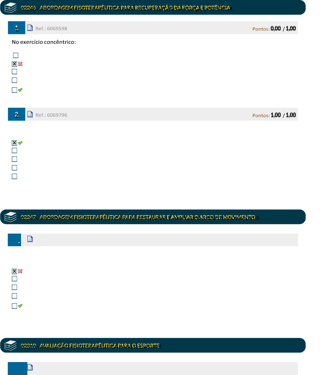 2 A velocidade independe da tensão. Poucas unidades motoras são recrutadas em relação ao exercício excêntrico. A força exercida durante a contração é maior que a obtida no exercício excêntrico. A velocidade da contração aumenta junto com a tensão muscular. A tensão muscular diminui conforme a velocidade da contração aumenta. Sobre a aplicação de resistência mecânica, assinale a alternativa VERDADEIRA: É utilizada para aumento de força, potência, funcionalidade e resistência à fadiga. É aplicável nos casos de força muscular inferior ao grau 4. A desvantagem é que você não pode utilizar a contração isométrica. A velocidade de execução dos exercícios é irrelevante. Você não pode improvisar materiais em caso de ausência dos equipamentos. 3. Ref.: 6079596 Pontos: 0,00 / 1,00 O fuso neuromuscular exerce papel fundamental no controle do tônus muscular, sendo um importante receptor sensorial no músculo. A única alternativa verdadeira sobre a função dos fusos neuromusculares é: Não participa da regulação postural. Não impedem oscilações corporais. Não participa do controle do tônus muscular. Não possui inervação recíproca. Atuam no re exo miotático. 4. Ref.: 6081479 Pontos: 1,00 / 1,00 Quando falamos de prevenção de lesão no esporte, estamos diante de várias variáveis que podem in uenciar no surgimento de lesões. Portanto, uma intervenção avaliativa inicial irá nos respaldarmos do melhor caminho para elaborarmos uma proposta de atividades visando minimizar o risco de lesões. Sobre os programas de prevenção de lesões musculares e o treinamento de atletas, assinale V (verdadeiro) ou F (falso). (SONAFE 2018, Ciclo 7 Volume 3 do Programa de Atualização e Prova de Título de Especialista em Fisioterapia Esportiva) 2 ( ) A relação entre cargas de treinamento, condicionamento físico, desempenho e lesões é fundamental para a medicina esportiva. ( ) O ponto ideal do estímulo de treinamento é aquele que maximiza o potencial de desempenho (aptidão), com uma carga de treino apropriada, ao mesmo tempo que limita as consequências negativas do treinamento. ( ) Mudanças na carga de treinamento externa de uma semana para outra não acarretam risco para lesões musculares. ( ) A literatura demonstra que, mais do que as altas cargas de treinamento, as oscilações nesse volume, nessas cargas, podem constituir um importante fator de risco para lesões relacionadas ao treinamento. Assinale a alternativa que apresenta a sequência correta. V - F - F - V. V - V - V - F. V - V - F - V. F - V - F - V. F - F - V - V. Ref.: 6077759 5. Pontos: 0,00 / 1,00 Durante a prática desportiva, os atletas realizam atividades que exigem um dinamismo do controle postural, como pular, andar, mudar de direções, portanto é importante que haja equilíbrio na dinâmica do controle postural. Para avaliarmos estas variáveis, utilizamos o teste da estrela (SEBT - Star Excursion Balance Test ou y-test modi cado). Sobre o teste da estrela, assinale a alternativa CORRETA. (SONAFE 2016, Ciclo 6 Volume 1 do Programa de Atualização e Prova de Titulo de Especialista em Fisioterapia Esportiva). Possui menor quantidade de direções a serem alcançadas em relação ao Y-test. É o único teste utilizado como parâmetro de alta em pacientes com lesões do quadril e assoalho pélvico. Foi desenvolvido primeiro o Y-test. Captura, assim como o Y-test, a distância alcançada com um dos MMII em apenas duas direções. É usado, assim como o Y-test, exclusivamente para predizer lesões de membros inferiores. 6. Ref.: 6078408 Pontos: 0,00 / 1,00 Ano: 2012 Banca: VUNESP Órgão: PM-SP Prova: VUNESP - 2012 - PM-SP - 2º Tenente - Médico Ortopedia e Traumatologia (adaptada) A luxação do ombro pode ocorrer em atletas durante uma queda com a mão espalmada no chão ou durante um gesto esportivo que envolva a abdução e rotação lateral do ombro. Em relação à luxação gleno-umeral, assinale a alternativa correta. A lesão SLAP é o afundamento do osso cortical do canto súpero-lateral da cabeça do úmero. A lesão de Hill-Sacks é a lesão anterior ou posterior do lábio superior, local onde se insere a cabeça longa do bíceps. A lesão de Bankart é a desinserção da porção anterior da cápsula articular anterior e do lábio junto ao rebordo da cavidade glenoidal. O sinal da dragona refere-se à ausência da cabeça umeral em seu local anatômico, quando observada a luxação posterior 2 A luxação posterior é a mais frequente, sendo o tipo subcoracoide o mais comum. 7. Ref.: 6078318 Pontos: 0,00 / 1,00 Sobre a anatomia do tórax, região pertencente ao esqueleto axial, e que tem a função de proteger órgãos vitais como o coração e pulmões, assinale a opção correta: Geralmente as costelas consolidam-se completamente após repouso adequado, sendo que o número de costelas envolvidas na lesão pode aumentar o tempo necessário para a recuperação. O repouso é essencial para a recuperação e reparo das costelas fraturadas nas primeiras semanas após a lesão, sendo contraindicado nesta fase qualquer trabalho de expansão pulmonar. Quando falamos de abdome, especi camente a parede ântero-lateral, podemos citar os seguintes músculos: reto do abdome e peitoral maior. A caixa torácica inclui as vértebras torácicas posteriormente, as costelas e as cartilagens costais lateralmente e o esterno anteriormente. A realização de exercícios de fortalecimento da musculatura torácica e do dorso não ajuda a proteger o gradil costal. 8. Ref.: 6049481 Pontos: 1,00 / 1,00 Os testes funcionais de membros inferiores e membros superiores são alternativas de baixo curso para avaliação do controle postural em atletas. Quando é recomendado realizar esses testes funcionais? Todos os dias. Na avaliação pré e pós-tratamento, assim como durante as etapas da temporada. No dia lesão. Na folga dos atletas. No intervalo dos jogos. 9. Ref.: 6049651 Pontos: 0,00 /