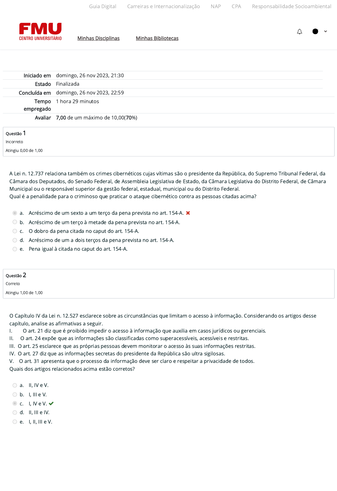 26/11/2023, 23:00 Atividade 4 (A4): Revisão da tentativa https://ambienteacademico.com.br/mod/quiz/review.php?attempt=3403410&cmid=1081556 1/4 Iniciado em domingo, 26 nov 2023, 21:30 Estado Finalizada Concluída em domingo, 26 nov 2023, 22:59 Tempo empregado 1 hora 29 minutos Avaliar 7,00 de um máximo de 10,00(70%) Questão 1 Incorreto Atingiu 0,00 de 1,00 Questão 2 Correto Atingiu 1,00 de 1,00 A Lei n. 12.737 relaciona também os crimes cibernéticos cujas vítimas são o presidente da República, do Supremo Tribunal Federal, da Câmara dos Deputados, do Senado Federal, de Assembleia Legislativa de Estado, da Câmara Legislativa do Distrito Federal, de Câmara Municipal ou o responsável superior da gestão federal, estadual, municipal ou do Distrito Federal. Qual é a penalidade para o criminoso que praticar o ataque cibernético contra as pessoas citadas acima? a. Acréscimo de um sexto a um terço da pena prevista no art. 154-A. b. Acréscimo de um terço à metade da pena prevista no art. 154-A. c. O dobro da pena citada no caput do art. 154-A. d. Acréscimo de um a dois terços da pena prevista no art. 154-A. e. Pena igual à citada no caput do art. 154-A. O Capítulo IV da Lei n. 12.527 esclarece sobre as circunstâncias que limitam o acesso à informação. Considerando os artigos desse capítulo, analise as a�rmativas a seguir. I. O art. 21 diz que é proibido impedir o acesso à informação que auxilia em casos jurídicos ou gerenciais. II. O art. 24 expõe que as informações são classi�cadas como superacessíveis, acessíveis e restritas. III. O art. 25 esclarece que as próprias pessoas devem monitorar o acesso às suas informações restritas. IV. O art. 27 diz que as informações secretas do presidente da República são ultra sigilosas. V. O art. 31 apresenta que o processo da informação deve ser claro e respeitar a privacidade de todos. Quais dos artigos relacionados acima estão corretos? a. II, IV e V. b. I, III e V. c. I, IV e V. d. II, III e IV. e. I, II, III e V. Guia Digital Carreiras e Internacionalização NAP CPA Responsabilidade Socioambiental Minhas Disciplinas Minhas Bibliotecas RY https://codely-fmu-content.s3.amazonaws.com/Moodle/GuiaDigital/Guia+digital/index.html https://carreiras.fmu.br/ https://codely-fmu-content.s3.amazonaws.com/Moodle/NAP/inicial/nap/fmu/index.html https://codely-fmu-content.s3.amazonaws.com/Moodle/CPA/landing_CPA/index.html https://portal.fmu.br/sustentabilidade https://ambienteacademico.com.br/ https://ambienteacademico.com.br/ https://ambienteacademico.com.br/course/view.php?id=236 26/11/2023, 23:00 Atividade 4 (A4): Revisão da tentativa https://ambienteacademico.com.br/mod/quiz/review.php?attempt=3403410&cmid=1081556 2/4 Questão 3 Correto Atingiu 1,00 de 1,00 Questão 4 Correto Atingiu 1,00 de 1,00 Questão 5 Correto Atingiu 1,00 de 1,00 Considere os crimes a seguir: I. ataque cibernético para acessar os jogos das vítimas; II. invasão de computadores dos outros para corromper arquivos; III. invasão de sistemas para veri�car sua fragilidade; IV. invasão de dispositivo para dani�car conteúdo; V. ataque cibernético para apropriação de dados pessoais. Quais dos crimes descritos acima estão relacionados na lei Carolina Dieckmann? a. I, II, III, IV e V. b. I, III, IV e V. c. I, II e V. d. II, III e IV. e. II, IV e V. O art. 6º da Lei n. 12.527 trata da responsabilidade em garantir a clara administração da informação, disponibilizando o acesso a todos, e de assegurar a informação, principalmente aquela que é secreta e privada, mantendo a acessibilidade, veracidade e integridade. De acordo com a referida lei, quem possui tal responsabilidade? a. Comitê de Acesso à Informação. b. Instituto de Estudo da Informação. c. Ministério Público Federal. d. Ministério da Comunicação. e. Órgãos e entidades do poder público. A lei Carolina Dieckmann - ou Lei n. 12.737, de tipi�cação criminal de delitos informáticos - foi pensada para crimes de ataques que acontecem por meio da internet, pois não havia, até a data de sua publicação, um regimento que penalizasse esses tipos de ameaças e, por isso, ela está inserida ______________. Qual das alternativas abaixo completam a sentença acima? a. na lei do estado carioca. b. no site do Ministério da Justiça. c. no Código Penal brasileiro. d. na lista federal de crimes. e. no decreto criminal. Guia Digital Carreiras e Internacionalização NAP CPA Responsabilidade Socioambiental Minhas Disciplinas Minhas Bibliotecas RY https://codely-fmu-content.s3.amazonaws.com/Moodle/GuiaDigital/Guia+digital/index.html https://carreiras.fmu.br/ https://codely-fmu-content.s3.amazonaws.com/Moodle/NAP/inicial/nap/fmu/index.html https://codely-fmu-content.s3.amazonaws.com/Moodle/CPA/landing_CPA/index.html https://portal.fmu.br/sustentabilidade https://ambienteacademico.com.br/ https://ambienteacademico.com.br/ https://ambienteacademico.com.br/course/view.php?id=236 26/11/2023, 23:00 Atividade 4 (A4): Revisão da tentativa https://ambienteacademico.com.br/mod/quiz/review.php?attempt=3403410&cmid=1081556 3/4 Questão 6 Incorreto Atingiu 0,00 de 1,00 Questão 7 Correto Atingiu 1,00 de 1,00 Questão 8 Correto Atingiu 1,00 de 1,00 A Lei n. 12.527 estabelece que para ter acesso a uma informação, a pessoa interessada deve fazer um pedido em documento impresso ou digital constando sua identidade e os detalhes sobre a informação requerida. Após isso, as instituições públicas devem entregar a informação solicitada imediatamente ou no período de até 20 dias. As informações referidas acima estão contidas em quais artigos da referida lei? a. Arts. 10 e 11. b. Arts. 15 e 16. c. Arts. 5º e 6º. d. Arts. 8º e 9º. e. Arts. 2º e 3º. A Lei n. 12.737, de 30 de novembro de 2012, trata dos tipos de crimes realizados por meios computacionais. Ela também é chamada de lei Carolina Dieckmann, pois sua criação esteve relacionada a um caso que aconteceu com a atriz. Te