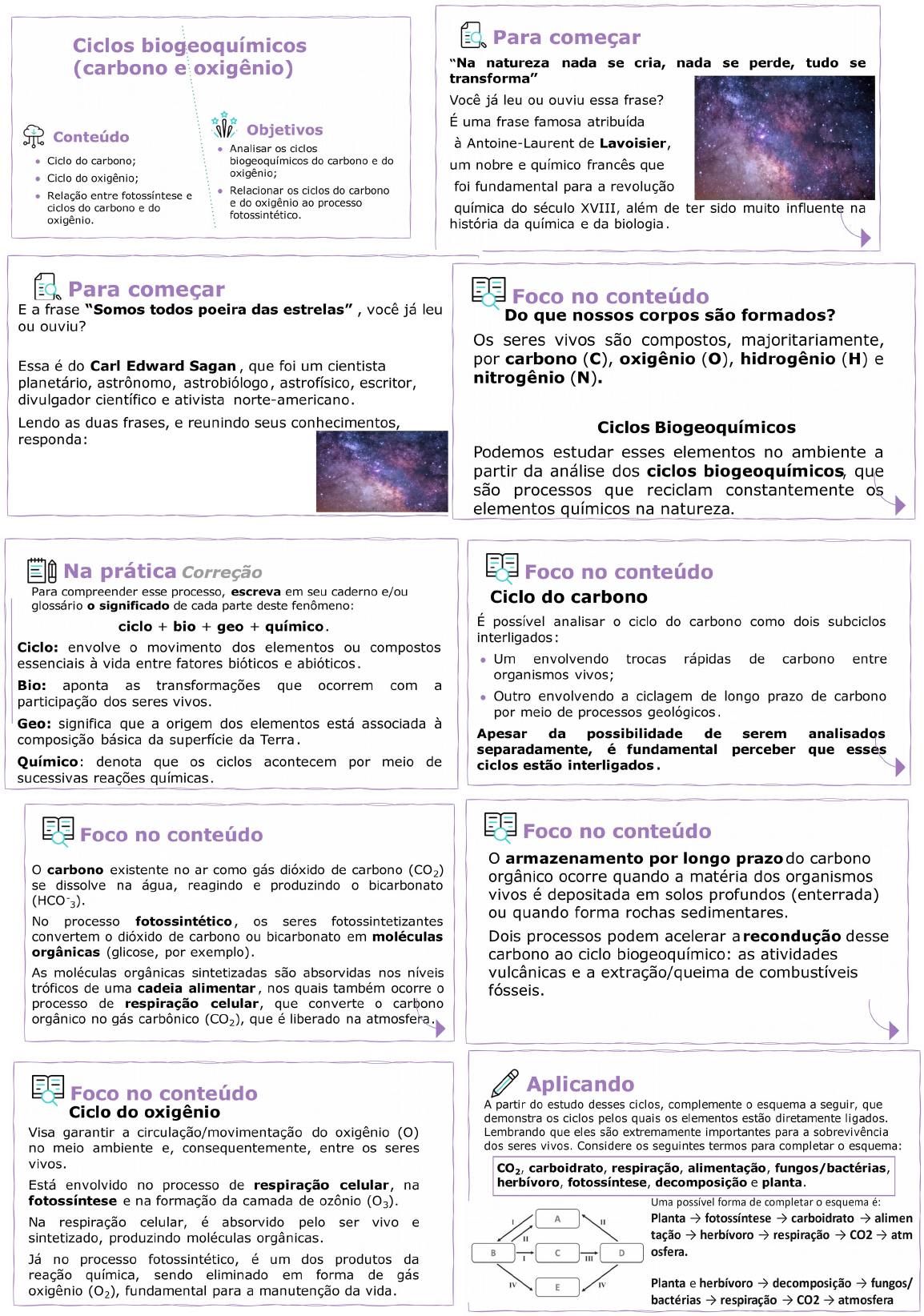 Foco no conteúdo O carbono existente no ar como gás dióxido de carbono (CO 2 ) se dissolve na água, reagindo e produzindo o bicarbonato (HCO - 3 ) . No processo fotossintético , os seres fotossintetizantes convertem o dióxido de carbono ou bicarbonato em moléculas orgânicas (glicose, por exemplo) . As moléculas orgânicas sintetizadas são absorvidas nos níveis tróficos de uma cadeia alimentar , nos quais também ocorre o processo de respiração celular , que converte o carbono orgânico no gás carbônico (CO 2 ), que é liberado na atmosfera . Foco no conteúdo É possível analisar o ciclo do carbono como dois subciclos interligados : ● Um envolvendo trocas rápidas de carbono entre organismos vivos ; ● Outro envolvendo a ciclagem de longo prazo de carbono por meio de processos geológicos . Apesar da possibilidade de serem analisados separadamente, é fundamental perceber que esses ciclos estão interligados . Ciclo do carbono Na prática Ciclo : envolve o movimento dos elementos ou compostos essenciais à vida entre fatores bióticos e abióticos . Bio : aponta as transformações que ocorrem com a participação dos seres vivos . Geo : significa que a origem dos elementos está associada à composição básica da superfície da Terra . Químico : denota que os ciclos acontecem por meio de sucessivas reações químicas . Correção Para compreender esse processo, escreva em seu caderno e/ou glossário o significado de cada parte deste fenômeno: ciclo + bio + geo + químico . Para começar E a frase “Somos todos poeira das estrelas” , você já leu ou ouviu ? Essa é do Carl Edward Sagan , que foi um cientista planetário, astrônomo, astrobiólogo , astrofísico, escritor, divulgador científico e ativista norte - americano . Lendo as duas frases, e reunindo seus conhecimentos, responda: Foco no conteúdo Os seres vivos são compostos, majoritariamente, por carbono ( C ), oxigênio ( O ), hidrogênio ( H ) e nitrogênio ( N ) . Ciclos B iogeoquímicos Podemos estudar esses elementos no ambiente a partir da análise dos ciclos biogeoquímicos , que são processos que reciclam constantemente os elementos químicos na natureza . Do que nossos corpos são formados? ● Ciclo do carbono; ● Ciclo do oxigênio; ● Relação entre fotossíntese e ciclos do carbono e do oxigênio. ● Analisar os ciclos biogeoquímicos do carbono e do oxigênio; ● Relacionar os ciclos do carbono e do oxigênio ao processo fotossintético. Conteúdo Objetivos Ciclos biogeoquímicos (carbono e oxigênio) Para começar “ Na natureza nada se cria, nada se perde, tudo se transforma” Você já leu ou ouviu essa frase? É uma frase famosa atribuída à Antoine - Laurent de Lavoisier , um nobre e químico francês que foi fundamental para a revolução química do século XVIII, além de ter sido muito influente na história da química e da biologia . Foco no conteúdo Na prática É possível relacionar o ciclo do carbono ao do oxigênio, analisando processos que ocorrem nos seres autótrofos. Com base nos seus conhecimentos, utilizando a imagem a seguir, relacione um ciclo ao outro . 5 min. Aplicando A partir do estudo desses ciclos, complemente o esquema a seguir, que demonstra os ciclos pelos quais os elementos estão diretamente ligados. Lembrando que eles são extremamente importantes para a sobrevivência dos seres vivos. Considere os seguintes termos para completar o esquema: CO 2 , carboidrato , respiração , alimentação , fungos/bactérias , herbívoro , fotossíntese , decomposição e planta . Uma possível forma de completar o esquema é: Planta → fotossíntese → carboidrato → alimen tação → herbívoro → respiração → CO2 → atm osfera. Planta e herbívoro → decomposição → fungos/ bactérias → respiração → CO2 → atmosfera Foco no conteúdo Visa garantir a circulação/movimentação do oxigênio (O) no meio ambiente e, consequentemente, entre os seres vivos . Está envolvido no processo de respiração celular , na fotossíntese e na formação da camada de ozônio (O 3 ) . Na respiração celular, é absorvido pelo ser vivo e sintetizado, produzindo moléculas orgânicas . Já no processo fotossintético, é um dos produtos da reação química, sendo eliminado em forma de gás oxigênio (O 2 ), fundamental para a manutenção da vida . Ciclo do oxigênio Foco no conteúdo O armazenamento por longo prazo do carbono orgânico ocorre quando a matéria dos organismos vivos é depositada em solos profundos (enterrada) ou quando forma rochas sedimentares. Dois processos podem acelerar a recondução desse carbono ao ciclo biogeoquímico: as atividades vulcânicas e a extração/queima de combustíveis fósseis.