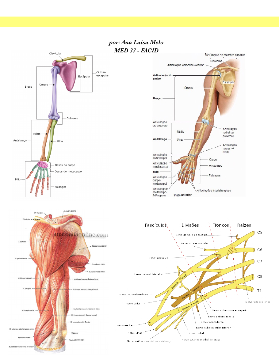 anatomia do membro superior por: Ana Luísa Melo MED 37 - FACID ossos do membro superior por: Ana Luísa Melo MED 37 - FACID ossos do membro superior —> Cintura Escapular: • Clavícula: —> Funções: • suporte (âncora) • fixação para músculos • transmitir as forças do membro superior para o esqueleto axial —> Extremidades: • medial ou esternal (globosa) • lateral ou acromial (achatada) —> Faces: • superior (lisa) • inferior (irregular) - linha trapezoidea - tubérculo conoide - sulco para o músculo subclávio —> local de fixação do músculo subclávio - impressao para o ligamento costoclavicular FACE INFERIOR FACE SUPERIOR ANTERIOR ANTERIOR POSTERIOR POSTERIOR extremidade esternal extremidade acromial fixam o ligamento coracoclavicular tubérculo conoide linha trapezoidea impressão para o ligamento costoclavicular sulco para o músculo subclávio • Escápula: —> Faces: • anterior (costal) —> côncava • posterior (dorsal) —> convexa —> Bordas: • medial (vertebral) • lateral (axilar) • superior —> Ângulos: • superior • inferior • lateral —> cabeça da escápula processo coracoide incisura supraescapular FACE POSTERIOR FACE ANTERIOR incisura supraescapular processo coracoide borda lateral borda medial borda superior ângulo superior ângulo inferior ângulo lateral processo coracoide fixa o ligamento conoide fixa o ligamento trapezoide (lig. trapezoide + lig. conoide) —> Cabeça da Escápula: • colo • cavidade glenoide • tubérculo supraglenoidal • tubérculo infraglenoidal —> Face Anterior: • fossa subescapular (côncava) —> Face Posterior: • espinha da escápula • acrômio • fossa supraespinhal • fossa infraespinhal CABEÇA DA ESCÁPULA FACE ANTERIOR FACE POSTERIOR cavidade glenoidecolo tubérculo supraglenoidal tubérculo infraglenoidal fossa subescapular espinha da escápula acrômio fossa supraespinhal fossa infraespinhal —> Braço: • Úmero: —> Extremidade Proximal: • cabeça do úmero —> articula-se com a cavidade glenoide da escápula • colo anatômico • tubérculos —> local de fixação para alguns músculos escapuloumerais - maior (lateral) - menor (ântero- medial) • sulco intertubercular —> separa os tubérculos • colo cirúrgico —> local comum de fratura Maior osso do membro superior, articula-se com a escápula na articulação do ombro e com o rádio e com a ulna na articulação do cotovelo. POSTERIORANTERIOR cabeça do úmero colo anatômico colo cirúrgico tubérculo menor tubérculo maior sulco intertubercular —> Corpo: • forma - cilíndrica (superiormente) - achatada (inferiormente) • cristas - do tubérculo maior (lateralmente) - do tubérculo menor (medialmente) • sulco intertubercular (continuação) • tuberosidade deltoide (ântero-lateralmente) —> onde se fixa o músculo deltoide • sulco do nervo radial crista do tubérculo menor crista do tubérculo maior sulco intertubercular tuberosidade deltoide sulco do nervo radial —> Extremidade Distal: • superfície articular - capítulo (lateral) —> articula-se com a cabeça do rádio - tróclea (medial) —> articula-se com a extremidade proximal da ulna (incisura troclear) • fossas - radial (anterior) —> acima do capítulo, recebe a margem da cabeça do rádio durante a flexão total do antebraço - coronoidea (anterior) —> entrada do processo coronoide da ulna durante a flexão completa do cotovelo - do olécrano (posterior) —> recebe o olécrano da ulna durante a extensão total do cotovelo • epicôndilos —> locais de fixação muscular - medial (maior) - lateral (menor) • cristas - supraepicondilar medial - supraepicondilar lateral • sulco para o nervo ulnar (epicôndilo medial) ANTERIOR POSTERIOR fossa coronoidea fossa radial tróclea capítulo epicôndilo lateral epicôndilo medial fossa do olécrano tróclea capítulo sulco para o nervo ulnar crista supraepicondilar medial crista supraepicondilar lateral —> Antebraço: • Ulna: —> Extremidade Proximal: • olécrano • processo coronoide • incisura troclear —> formada pelas paredes do olécrano e do processo coronoide • incisura radial da ulna —> recebe a parte periférica larga da cabeça do rádio • crista do supinador —> localiza-se inferiormente à incisura radial da ulna, a parte profunda do músculo supinador fixa-se à crista • tuberosidade da ulna —> fixa o tendão do músculo braquial incisura troclear —> Extremidade Distal: • cabeça da ulna • processo estiloide da ulna olécrano processo coronoide incisura troclear tuberosidade da ulna processo estiloide da ulna cabeça da ulna processo coronoide tuberosidade da ulna incisura radial da ulna crista do supinador ANTERIOR POSTERIOR LATERAL • Rádio: —> Extremidade Proximal: • cabeça do rádio - fóvea - circunferência articular • colo do rádio • tuberosidade do rádio —> fixa o músculo bíceps braquial —> Extremidade Distal: • face cárpica do rádio —> onde se fixam os ossos do carpo • incisura ulnar do rádio —> acomoda a cabeça da ulna • processo estiloide do rádio • tubérculo dorsal (posterior) cabeça do rádio rádio ulna fóvea circunferência articular processo estiloide do rádio incisura ulnar do rádio face cárpica do rádio tubérculo dorsal —> Mão: • Carpo: • Carpo • Metacarpo • Falanges —> Fileira Proximal: • escafoide • semilunar • piramidal • pisiforme —> Fileira Distal: • trapézio • trapezoide • capitato • hamato - hâmulo escafoide semilunar piramidal pisiforme trapézio trapezoide capitato hamato hâmulo do hamato • Metacarpo: —> Denominação: (lateral-medial) • I metacarpo • II metacarpo • III metacarpo • IV metacarpo • V metacarpo —> Estrutura: • base proximal —> articulam-se com os ossos carpais • corpo • base distal —> articulam-se com as falanges proximais • Falanges: —> Denominação dos Dedos: • polegar —> fa