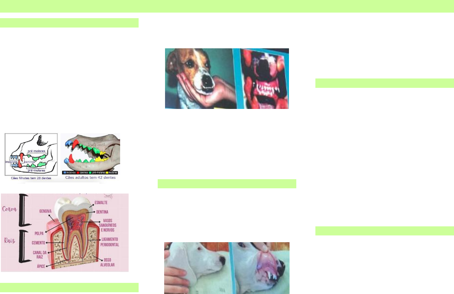 Cavidade Oral Anatomia Dentes Decíduos (de leite): formados entre 3-4 semanas (troca da ingestão de leite para sólidos). A troca ocorre em 4-6 meses. Ordem de queda Incisivos ➜ Molares ➜ Caninos Prognatismo Congênito e hereditária Definição: projeção rostral da mandíbula em relação à maxila. Evolução: retenção de alimentos e desenvolvimento de doenças periodontais. Tratamento: prevenção da doença periodontal ou cirurgia ortodôntica. Bragnatismo Congênito e hereditária Definição: projeção rostral da maxila em relação à mandíbula. Evolução: retenção de alimentos e desenvolvimento de doenças periodontais. Tratamento: prevenção da doença periodontal ou cirurgia ortodôntica. Queilosquise (lábio leporino) Congênito e hereditária Definição: fenda labial devido ao não fechamento do osso externo da narina. Evolução: filhote sem eficiência na sucção de leite (peso inferior ao da ninhada) e aspiração e pneumonia por aspiração. Tratamento: queiloplastia (desbridamento da borda lateral e realização de rafia com PSI e nylon). Palatosquise (fenda palatina) Congênito e hereditária Definição: não fechamento do palato duro ou mole. SC: leite flui pelas narinas e menor peso comparado a ninhada. Evolução: pneumonia aspirativa associada a pneumonias bacterianas e deficiência no desenvolvimento. Tratamento: difícil tratamento. 1º opção – descolar os palatos e suturar para o centro, fechando a fenda. 2º – colocação de prótese de biomateriais 3º– esperar o animal crescer e mantê-lo por esofagostomia. Natosquise Congênito e hereditária Definição: queilosquise + palatosquise Tratamento: individualizados e podem ser feitos em uma cirurgia só. Persistência do dente decíduo Definição: Os caninos ou incisivos podem ser retidos, fazendo com que o adecíduo se expanda na cav. oral. Incidência: ocorre mais nos caninos do que nos incisivos e mais na maxila do que na mandíbula. Evolução: retenção de alimentos leva a fermentação e a formação de placa dental que se calcifica e forma o tártaro. Tratamento: remoção do dente decíduo (em caninos a retirada deve ser sempre feita na direção da raiz, com movimentos de alavanca). Doença periodontal Definição: doenças que acometem gengiva, osso alveolar, cemento e lig. periodontal. Incidência: cães que comem NA (alimentação natural) e raças pequenas Patogenia: se inicia com uma periodontite (falta de escovação ➜ placas calcificadas ➜ tártaro) seguida de uma gengivite. Formação das placas: a película de glicoproteínas natural dos dentes retém bactérias e alimentos e se não for escovada vai se acumulando e induz a imunidade local. A saliva faz a calcificação dessas placas, pois é rica em minerais. O atrito com a gengiva causa sangramento e um ambiente ideal para proliferação bacteriana, o que leva ao descolamento e retração gengivais, formando o sulco sub- gengival (expõe o lig. periodontal, que se enfraquece ➜ maior mobilidade do dente). Quais dentes são mais atingidos? Como a maior glândula é a parótida (secreta + mineirais ➜ calcifica +) o 4º pré- molar e outros dentes nessa região são os mais afetados. SC: halitose, perda dos dentes, exposição da dentina (+sensibilidade ➜ inapetência), úlceras na mucosa (em gatos na prega pterigo-palatina), emagrecimento, efeitos sistêmicos pela formação de microtrombos (miocardite, glomerulonefrite, abcessos hepáticos, artrite séptica), pouca dor em gatos e lesões em furca (visualização do espaço entre as raízes). Diagnóstico: sonda gengival (classifica em leve, moderada ou grave); radiografia (áreas radioluscentes na raiz e destruição óssea na mandíbula ou maxila ➜ osteomielite). Tratamento: Raspagem dental supra e sub-gengival (ATB antes 3-5 dias Espiramicina+Metronidazol ou ampicilina IV 20 min antes). Dentes com lesão em furca devem ser removidos. Gengivoplastia em dentes viáveis (firmes no alvéolo) Pós: hipoclorito de sódio ou clorexidine para retirar o sangue. Fistula do Carniceiro Definição: fistulização patológica no plano nasal devido a abcesso no 4º pré-molar (+ aporte da parótida). SC: doença periodontal, abertura que drena conteúdo sanguinolento/purulento com bordos elevados e trajetos em fundo de saco na região periapical. Diagnóstico: sonda, radiografia e fistulografia com iodo. Tratamento: remoção do dente, desbridamento do trajeto fistuloso (iodo 2%) e suturado fundo de saco. Fechamento por 2º intenção. Pós: ATB 10-15 dias e injeção de iodo povidine no local da fístula ou borrifar pelo menos 2x ao dia antisséptico. Complexo Gengivite-Estomatite Felina Definição: complexo de lesões em gengiva, mucosa oral e língua. Sem etiologia conhecida. Pode estar associado a doença periodontal ou a doença reabsortiva odontoclássica felina (ativação de osteoclastos na dentina formando áreas de rarefação dentária e enegrecimento). Incidência: raças peludas. SC: inflamação e ulceração gengival, formação de fimbrias, dentes escuros e acinzentados, hiporexia devido a dor, sialorreia, ptialismo, halitose, tosse, pateamento da boca, auto-higiene prejudicada. Evolução: anorexia, lipidose hepática e abcessos espontâneos. Diagnóstico: visual ou biópsia (muitos linf B) Tratamento: exodontia Pré: fluidoterapia e alimentação por sonda Pós: clorexidine 2x ao dia e Espiramicina + metro, prednisona 1x o dia até a melhora das lesões. Fratura Dentária Tratamento: exodontia, restauração ou implante. Neoplasias Papiloma Benigno Etiologia: Papiloma vírus Incidência: jovens com menos de 1 ano SC: alteração na mastigação e apreensão, sangramento, halitose, sialorreia, dor ao mastigar, odor fétido e emagrecimento. Diagnóstico: visual (aspecto de couve flor + animal jovem), citologia ou PBA de linf regional. Tratamento: criocirurgia, excisão, termocautério de alguns e dentro de 1-2 semanas os demais sofrem apoptose e caem