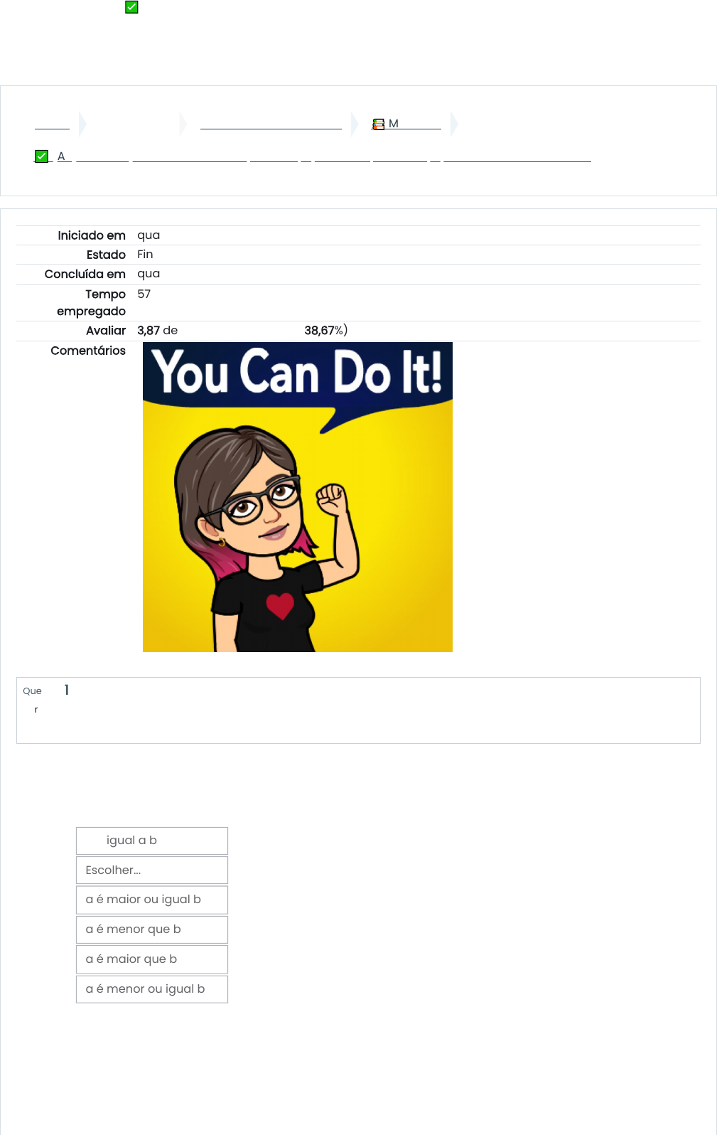 22/11/2023, 12:37 ✅ [A2] – Avaliação do Módulo 2 – Expressões, operadores, variáveis, tipos e estruturas de dados: Revisão da tentativa https://ava.ufms.br/mod/quiz/review.php?attempt=816304&cmid=641328 1/4 Painel Meus cursos 32010001808-T01-2023-2 📚 Módulo 2 ✅ [A2] – Avaliação do Módulo 2 – Expressões, operadores, variáveis, tipos e estruturas de dados Iniciado em quarta, 22 nov 2023, 11:39 Estado Finalizada Concluída em quarta, 22 nov 2023, 12:36 Tempo empregado 57 minutos 14 segundos Avaliar 3,87 de um máximo de 10,00(38,67%) Comentários Questão 1 Parcialmente correto Atingiu 0,67 de 1,00 Relacione as expressões relacionais, à esquerda, com o seu significado, à direita, conforme o que representam na linguagem Python. a != b a == b a >= b a < b a > b a <= b a é igual a b Escolher... a é maior ou igual b a é menor que b a é maior que b a é menor ou igual b https://ava.ufms.br/my/ https://ava.ufms.br/course/view.php?id=46316 https://ava.ufms.br/course/view.php?id=46316#section-3 https://ava.ufms.br/mod/quiz/view.php?id=641328 22/11/2023, 12:37 ✅ [A2] – Avaliação do Módulo 2 – Expressões, operadores, variáveis, tipos e estruturas de dados: Revisão da tentativa https://ava.ufms.br/mod/quiz/review.php?attempt=816304&cmid=641328 2/4 Questão 2 Incorreto Atingiu 0,00 de 1,00 Questão 3 Parcialmente correto Atingiu 0,20 de 1,00 Questão 4 Correto Atingiu 1,00 de 1,00 Questão 5 Incorreto Atingiu 0,00 de 1,00 O valor da expressão 1 + 4 > 1 or 1 - 4 > 1 quando resolvida pelo Python é FALSE. Escolha uma opção: Verdadeiro Falso Relacione os tipos com os seus respectivos objetos de acordo com o valor desses últimos. float bool int str list "Bom dia pessoal" 2.35 2**1024 2**1024 2**1024 Relacione os símbolos com a operação aritmética que eles representam na linguagem Python. Subtração Soma Divisão fracionária Multiplicação Divisão inteira Resto de uma divisão - + / * // % Em Python é possível somar um objeto do tipo booleano com um objeto do tipo inteiro. Escolha uma opção: Verdadeiro Falso 22/11/2023, 12:37 ✅ [A2] – Avaliação do Módulo 2 – Expressões, operadores, variáveis, tipos e estruturas de dados: Revisão da tentativa https://ava.ufms.br/mod/quiz/review.php?attempt=816304&cmid=641328 3/4 Questão 6 Correto Atingiu 1,00 de 1,00 Questão 7 Correto Atingiu 1,00 de 1,00 Questão 8 Incorreto Atingiu 0,00 de 1,00 Questão 9 Incorreto Atingiu 0,00 de 1,00 O valor da expressão 1 + 4 > 1 or 1 - 4 > 1 and 3 > 1 quando resolvida pelo Python é TRUE. Escolha uma opção: Verdadeiro Falso Em Python, podemos fazer a conversão explícita entre tipos usando a definição de construtores. Escolha uma opção: Verdadeiro Falso O valor da expressão aritmética 343 // 3 executada pelo Python é: a. 114,33 b. 10 c. 114 d. 9 e. 115 O valor da expressão aritmética 2 - 4 * 7 / 3 + 8 - 9 + 0 quando resolvida pelo Python é um valor inteiro. Escolha uma opção: Verdadeiro Falso 22/11/2023, 12:37 ✅ [A2] – Avaliação do Módulo 2 – Expressões, operadores, variáveis, tipos e estruturas de dados: Revisão da tentativa https://ava.ufms.br/mod/quiz/review.php?attempt=816304&cmid=641328 4/4 Questão 10 Incorreto Atingiu 0,00 de 1,00 Em Python, uma lista é uma sequência de objetos, de diferentes tipos, separados por ponto e vírgula e envoltos por colchetes. Escolha uma opção: Verdadeiro Falso Atividade anterior ◄ 📍 [Checkout de Presença] Módulo 2 – Expressões, operadores, variáveis, tipos e estruturas de dados Seguir para... Próxima atividade ▶ [Videoaula] Apresentação do Módulo 3 ► Manter contato Suporte Técnico ao Usuário https://suporteagetic.ufms.br (67) 3345-7613 suporte.agead@ufms.br https://ava.ufms.br/mod/assign/view.php?id=641326&forceview=1 https://ava.ufms.br/mod/url/view.php?id=641329&forceview=1 https://suporteagetic.ufms.br/ tel:(67) 3345-7613 mailto:suporte.agead@ufms.br https://api.whatsapp.com/send?phone=556733457613