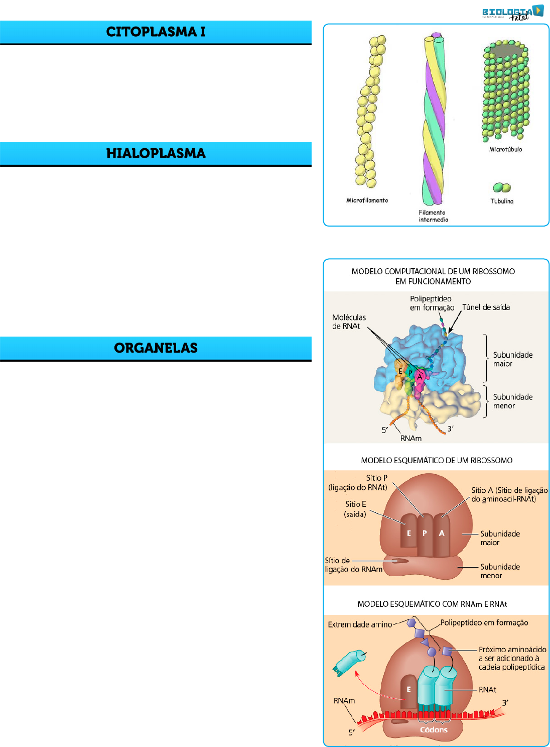 54Citologia Sempre é bom lembrar que quando falamos em organelas celulares, referimo-nos a uma célula eucarionte, já que as células procariontes possuem apenas os ribossomos, responsáveis pela síntese protéica. Já as células eucariontes apresentam diversas organelas responsáveis pelo metabolismo celular. a) citoesqueleto: constituído por microtúbulos e microfilamentos de proteínas contráteis, está aos movimentos do citoplasma, bem como ao batimento de cílios e flagelos e a migração dos cromossomos durante a divisão celular. b) ribossomos: são estruturas compostas por RNA e proteínas, distribuídas em duas subunidades sobrepostas. Os ribossomos podem se apresentar livres no citoplasma, isolados, presos à superfície do RE rugoso ou então presos uns aos outros por uma fita de RNA. Nesse caso, são chamados polissomos ou polirribossomos. É nos ribossomos que ocorre a síntese protéica. c) mitocôndrias: são organóides presentes em todas as células eucarióticas, animais e vegetais. As mitocôndrias, assim como os cloroplastos, possuem seu próprio DNA, alguns ribossomos e a capacidade de autoduplicação. d) plastos: um tipo de organela característica das células vegetais. Eles podem conter pigmentos ou substâncias de reserva. Os plastos coloridos pela presença de pigmentos são chamados cromoplastos e, destes, os mais numerosos e importantes são os cloroplastos, nos quais ocorrem as reações da fotossíntese, pois possuem o pigmento verde clorofila. e) centríolos: têm a forma de bastonetes e ocupam, normalmente, uma posição próxima ao núcleo celular. Ao microscópio eletrônico cada centríolo aparece formado por nove trincas de microtúbulos de proteína, ligados entre si e dispostos de maneira a formar um cilindro. Em geral há dois centríolos por célula, dispostos perpendicularmente. Os centríolos atuam na formação de cílios e flagelos e, durante a divisão celular, orientam os cromossomos e formam o fuso acromático. Ribossomos não são membranosos. São organelas feitas de RNA e proteína, apenas. Quando se descreve uma célula nos seus componentes fundamentais, falamos em membrana plasmática, citoplasma e núcleo. Já fizemos um estudo da membrana e suas particularidades. Vimos ainda, quando diferenciamos célula procarionte da célula eucarionte que, todas as células possuem citoplasma. Os citologistas costumam dividir o citoplasma em duas partes, para fins de estudo: o hialoplasma e as organelas Material gelatinoso que preenche o interior da célula. Quimicamente, o hialoplasma está formado por água e proteínas, principalmente, além das demais substâncias orgânicas e sais minerais já vistos anteriormente, como glicose, lipídios, aminoácidos, etc. Podemos observar no hialoplasma uma região mais externa, o ectoplasma, geralmente mais denso, sendo denominado de gel. Observa-se também, uma região mais interna, o endoplasma, geralmente mais fluido, no estado de sol. A parte sol do hialoplasma realiza um movimento orientado, geralmente circular, ao redor do núcleo, chamado ciclose, facilmente observado em células vegetais. Outro tipo de movimento realizado pelo hialoplasma é o movimento amebóide, do qual resultam os pseudópodos, observados em glóbulos brancos e protozoários. As diferentes composições e conformações do citoesqueleto. Cada tipo de citoesqueleto acaba tendo uma função na célula. 55 1. (CFTSC 2010) A célula constitui a unidade morfológica e funcional de todos os seres vivos e apresenta, como estrutu- ras básicas, a membrana plasmática, o citoplasma e o núcleo. Com relação aos constituintes celulares, é correto afirmar que: a) É no ribossomo que ocorre o processo de respiração celular e o processo de síntese de proteínas. b) A membrana plasmática é constituída por uma bicamada de li- pídeos, os fosfolipídios, na qual estão presentes, imersas e na sua superfície, diferentes proteínas. c) Os seres vivos identificados como procariontes apresentam o material genético envolvido por uma membrana, constituindo uma estrutura chamada de núcleo. d) Os cloroplastos, estruturas que possuem em seu interior o pig- mento verde clorofila, estão presentes nas células animais e vege- tais. e) A difusão, um tipo de mecanismo de transporte de substâncias através da membrana plasmática, promove o movimento de molé- culas do meio onde estão menos concentradas para o local onde estão mais concentradas. 2. (UFSC 2009) Observe a coluna 1, que apresenta processos ocorridos em uma célula eucariótica, e a coluna 2, que apre- senta o local da célula onde eles ocorrem. Assinale a(s) proposição(ões) cuja(s) correlação(ões) é(são) CORRETA(S). 01) I - A 02) II - B 04) III - C 08) IV - C 16) V - B 32) VI - B 64) VII – C 3. (CFTSC) Considerando o estudo da célula, assinale a alter- nativa CORRETA: a) As mitocôndrias servem para realizar fotossíntese em células vegetais. b) As células animais apresentam plastos na sua estrutura c) Ribossomos são grânulos responsáveis pela síntese de proteí- nas. d) A função do núcleo é apenas armazenar informações genéticas. e) A difusão é a passagem de substâncias através da membrana da célula, com gasto de energia. 4. (PUCRS) Com auxílio de uma refinada tecnologia de biologia molecular adaptada para células eucariotas diploides oriundas de tecidos animais, um cientista pretende encontrar a presen- ça de ácidos nucleicos (DNA ou RNA) para processar seus experimentos. Considerando as estruturas celulares abaixo, a identificação de DNA ou RNA através do uso dessa tecnologia só NÃO será possível: a) no núcleo b) no nucléolo. c) na mitocôndria. d) no centríolo. 5. (CFTMG) A droga cloranfenicol tem efeito antibiótico por impedir que os ribossomos das bactérias realizem sua função, inibindo a produção de: a) ATP. b) lipídios. c) proteínas. d) RNA mensageiro. DETONANDO 6. (UDESC 2014) Analise as proposições quanto às c