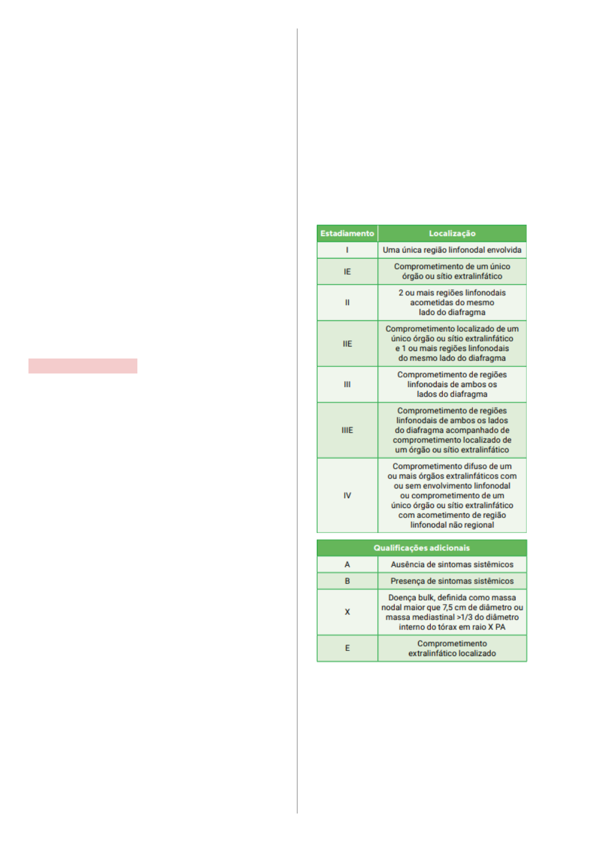 Linfoma� ● acúmulo de linfócitos malignos em linfonodos ● clínica característica de linfonodopatias ● quando pensar em malignidade: ○ aumento assimétrico ○ mais de uma cadeiras ganglionar acometida ○ consistência endurecida ○ mobilidade diminuída pela aderência aos tecidos periganglionares ○ indolor ○ sem rubor ○ localização não habitual: peritroclear, supraclavicular, cervical baixo, poplíteo… Linfoma de Hodgkin: ● presença da célula de Reed-Sternberg (olhos de coruja) ● associação com vírus Epstein-Barr ● incidência bimodal (20-30 anos e 60-70 anos) → Quadro clínico: ● aumento assimétrico de linfonodos periféricos ● massa mediastinal ● esplenomegalia ● hepatomegalia ● prurido intenso ● sintomas B ● dor no linfonodo com uso de álcool → Laboratório: ● anemia normocítica e normocrômica ● plaquetas variáveis ● DHL aumentado ● marcadores de progressão da doença: VHS e PCR → Diagnóstico: ● biópsia excisional do linfonodo acometido ● diagnóstico e subtipos ● não fazer punção aspirativa → Estadiamento: ● exame físico ● exames de imagem: raio x de tórax, tc, rnm, pet-ct ● biópsia da medula óssea e outros órgãos ● Ann Arbor → Prognóstico: ● IPS - doença avançada: ● idade > 45 anos ● sexo masculino ● albumina sérica < 40 ● hb < 10,5 ● estadiamento IV ● leuco > 15.000 ● leuco < 600 → Tratamento: ● radioterapia: ○ I e II ○ massas volumosas ○ tumores mediastinais ○ dores ósseas ● quimioterapia: ○ duração e intensidade depende do subtipo e estadiamento Linfomas não Hodgkin: ● maioria células B - pode ser T ou NK ● apresentações bem mais variáveis que o LH ● associação com imunossupressão → Quadro clínico: ● 50-65 anos ● associado com: pesticidas, radiação, agente infecciosos ● agentes infecciosos: HTLV-1, EBC, HHV8, HCV, HIV, malária e h. pylori ● linfomas indolentes: idosos, história clínica lenta e poucos sintomas ● linfomas agressivos: adultos e massa de crescimento rápido ● linfadenopatia ● sintomas B ● hepa/esplenomegalia ● envolvimento da medula óssea e tgi ● citopenias ● envolvimento mediastinal ● DHL, ácido úrico e beta-2-microglobulina elevados → Subtipos: ● macroglobulinemia de Waldenstrom (linfoma linfoplasmocítico) ○ produção de IgM ○ hiperviscosidade ● linfoma de Burkitt ○ alto grau ○ endêmica (áfrica) ○ infecções repetidas por malária ● Linfoma MALT ○ baixo grau ○ maioria gástricos ○ H. pylori ○ tto: erradicação h. pylori - não precisa de qt → Estadiamento e prognóstico: ● sistema de Ann Arbor ● realizar os mesmos exames ● linfomas indolentes: difíceis de curar, maior sobrevida sem tratamento ● linfomas agressivos: maior chance de cura, sobrevida curta sem tratamento → Tratamento: ● diversos protocolos para os diversos tipos ● Rituximabe - anti CD20
