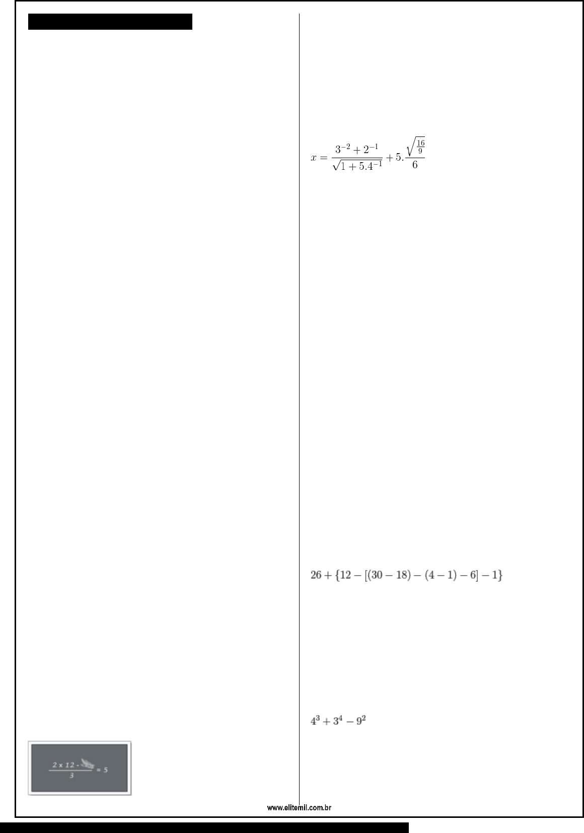 125 LISTAS DE EXERCÍCIOS Exercícios – Expressões numéricas 1) (UNAERP SP/2006) Analisando as expressões: I. [(+2)(– 3/4):(–2/3)] II. (+2–3+1):(–2+2) III. (+4–9):(–5+3) IV. (2–3+1):(–7) podemos afirmar que zero é o valor de: a) somente I, II e IV b) somente I e III c) somente IV d) somente II e IV e) somente II 2) Escrever um número na notação científica significa expressá-lo como o produto de dois números reais x e y, tais que: 1 ≤ x < 10 e y é uma potência de 10. Assim, por exemplo, as respectivas expressões dos números 0,0021 e 376,4 na notação científica são 2,1 x 10–3 e 3,764 x 102. Com base nessas informações, a expressão do número N na notação científica é: N = 14,4·0,072 / 0,16·0,000027 a) 7,2 x 103 b) 2,4 x 104 c) 2,4 x 105 d) 3,6 x 104 e) 3,6 x 103 3) Qual das alternativas a seguir representa um quinto do resultado desta expressão numérica: [(64 – 16·4) + (48·10 – 180)]·5 a) 270 b) 300 c) 350 d) 400 e) 410 4) Margarida viu no quadro-negro algumas anotações da aula anterior um pouco apagadas, conforme mostra a figura a seguir. Qual número foi apagado? a) 9 b) 10 c) 12 d) 13 e) 15 5) Qual o valor de x na expressão abaixo? a) 1/27 b) 41/27 c) 1/17 d) 11/18 e) 41/17 6) Simplifique: ( (0 ÷ 3) + (0,75 x 4) ) / ( 1 + 0,5). a) 1,5 b) 2 c) 4 d) 5,5 e) 6 7) Determine o valor da expressão: -1 + 6 x (7 – 4 ÷ 2) A) 7,5 B) 29 C) 8,5 D) 24 E) 32,5 8) Calcule o valor da expressão: a) 10 b) 15 c) 34 d) 40 e) 54 9) Calcule o valor da expressão: a) 6 b) 22 c) 32 http://www.elitemil.com.br/ 126 d) 36 e) 64 10) Calcule o valor da expressão [(5 + 3) x 12] ÷ [(5- 3) x 4] a) 6 b) 8 c) 12 d) 16 e) 24 Exercícios – Radiciação 1) (FGV) Simplificando-se 2√3 + 2√12 – 2√75 obtém-se: a) 0 b) – 2√3 c) – 4√3 d) – 6√3 e) – 8√3 2) (Mack) O valor de √2 + √3.√18 é igual a: a) √56 b) √108 c) √2 + 54 d) √6 + 6 e) √2.(1 + 3.√3) 3) (UFRGS) A expressão: é igual a: a) √2 + 3√3 / 4√2 b) 5√2 c) √3 d) 8√2 e) 1 4) (UTF - PR) Considere as seguintes expressões: I. II. III. É (são) verdadeira(s), somente: a) I. b) II. c) III. d) I e II. e) I e III. 5) EPCAR - 2015 O valor da soma é um número a) natural menor que 10 b) natural maior que 10 c) racional não inteiro. d) irracional. 6) CEFET/RJ – 2014 Por qual número devemos multiplicar o número 0,75 de modo que a raiz quadrada do produto obtido seja igual a 45? a) 2700 b) 2800 c) 2900 d) 3000 7) IFCE - 2017 Aproximando os valores de até a segunda casa decimal, obtemos 2,23 e 1,73, respectivamente. Aproximando o valor de até a segunda casa decimal, obtemos a) 1,98. b) 0,96. c) 3,96. d) 0,48. e) 0,25. 8) IFSC - 2018 Analise as afirmações seguintes: I. −52 − √16 ∙ (−10) ÷ (√5)2 = −17 II. 35 ÷ (3 + √81 −23 + 1) × 2 = 10 III. Efetuando-se (3 + √5)(3 − √5) , obtém-se um número múltiplo de 2. Assinale a alternativa CORRETA. a) Todas são verdadeiras. b) Apenas I e III são verdadeiras. http://www.elitemil.com.br/ 127 c) Todas são falsas. d) Apenas uma das afirmações é verdadeira. e) Apenas II e III são verdadeiras. Exercícios – Produtos notáveis 1) O resultado y2x2 – 4a2 é obtido por meio de qual dos produtos notáveis abaixo? a) (yx + 2a)(yx – 2a) b) (yx + 2a)(yx + 2a) c) (x + a)(y – 2) d) (y + a)(x + 2) e) (yx + 2a)2 2) Seja x2 + y2 = 60. Qual é o valor positivo de x + y, sabendo que xy = 20? a) 5 b) 10 c) 15 d) 20 e) 25 3) A respeito dos produtos notáveis, assinale a alternativa correta. a) (x + a)2 = x2 + a2 b) (x + a)2 = x2 + xa + a2 c) (x – a)2 = x2 – a2 d) (x – a)2 = x2 – 2x – a2 e) (x – a)2 = x2 – 2ax + a2 4) Cefet/MG – 2014 O valor numérico da expressão está compreendido no intervalo a) [30,40[ b) [40,50[ c) [50,60[ d) [60,70[ 5) Aprendiz de Marinheiro - 2015 O produto é igual a a) 6 b) 1 c) 0 d) – 1 e) – 6 6) EPCAR - 2016 O valor da expressão em que x e y ∈ R* e x ≠ y e x ≠ −y, é a) −1 b) −2 c) 1 d) 2 7) (Uel) Se o polinômio f=2x£-12Ë(2)x+4k é um quadrado perfeito, então a constante real k é um número a) quadrado perfeito. b) cubo perfeito. c) irracional. d) divisível por 8. e) primo. 8) A expressão [(4x+8)/(x£+3x+2)]+[(3x3)/(x£-1)], para x·•1, x·-2, é equivalente a a) [ 4/(x + 1) ] - [ 3/(x - 1) ] b) 1/(x + 1) c) 7/(x + 1) d) [ 4/(x + 1) ] + [ 3/(x - 1) ] e) 1/(x + 1) 9) (Fatec) Sabendo-se que a² - 2bc - b² - c² = 40 e a - b - c = 10, com a, b e c reais. Então o valor de a + b + c é igual a : a) 1 b) 2 c) 4 d) 10 e) 20 10) (Ufes) Assinale a sentença verdadeira. a) Se a e b são números reais e ab>1, então a>1 ou b>1. b) Se a = 0,999..., então Ëa = 0,333... c) Se n é um inteiro positivo, então n£ + n é par. d) Para todo número real x > 0 tem-se |x-1| = x-1. e) Para todo número real x > 0 tem-se x ´ x£ ´ x¤. http://www.elitemil.com.br/