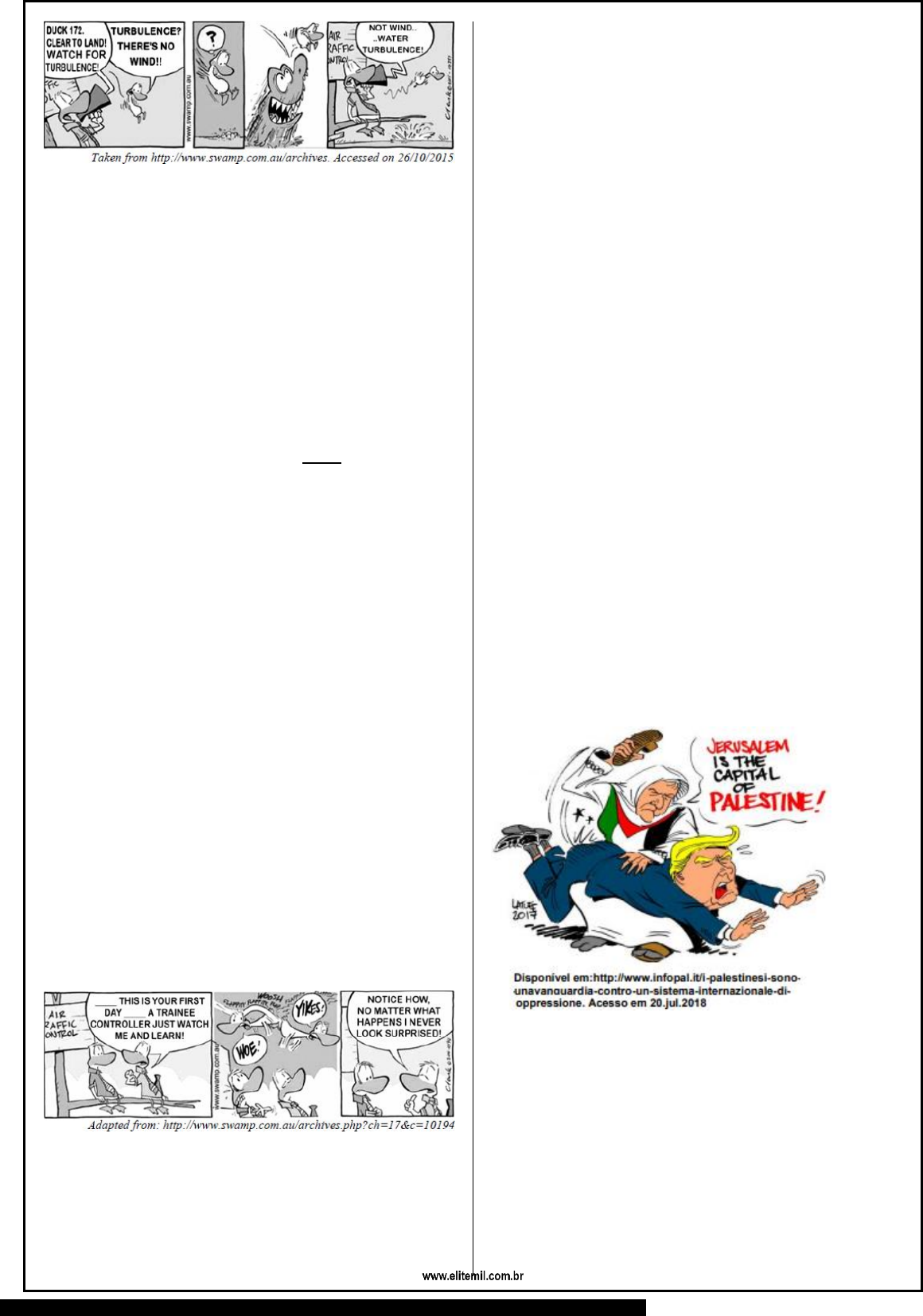 83 Choose the correct alternative, according to the cartoon. a) The flying duck understood there was turbulence, because the winds were strong. b) The air traffic controller duck didn’t have time to warn about turbulence. c) The water in movement caused the wind turbulence. d) The water turbulence was caused by the alligator. 47) Read the text and answer question. Heathrow expansion should face strict environmental conditions, say MPs. [1] Final government approval for the expansion of Heathrow should be withheld until Europe’s busiest airport can demonstrate that it accepts and will comply with key environmental conditions, a parliamentary committee has concluded. MPs on the environmental audit committee have been [5] hearing evidence on the likely carbon emissions, air quality and noise levels after the government-appointed Airports Commission recommended a third runway at Heathrow as the preferred plan for London airport expansion. (Adapted from www.theguardian/ environment. Acessed on 01/12/2015) Choose the synonym in the context for the underlined word in the title, and its correct part of speech. a) easygoing – adverb b) tough – adjective c) fear – adjective d) severely – adverb 48) Read the cartoon and answer question. Which words complete the lines in the cartoon? a) As – as b) At – as c) Like – as d) How – like 49) Read the text and answer question. The Last Dalai Lama? [1] On a wet Sunday in June at the Glastonbury Festival, more than 100,000 people spontaneously burst into a rendition of ‘‘Happy Birthday.’’ Onstage, Tenzin Gyatso, the 14th Dalai Lama, blew out the solitary candle on a large [5] birthday cake while clasping the hand of Patti Smith, who stood beside him. The world’s most famous monk then poked a thick finger at Smith’s silvery mane. ‘‘Musicians,’’ he said, ‘‘white hair.’’ But ‘‘the voice and physical action,’’ he added in his booming baritone, ‘‘forceful.’’ As Smith giggled, he [10] went on: ‘‘So, that gives me encouragement. Myself, now 80 years old, but I should be like you — more active!’’ Taken from www.nytimes.com. Acessed on 14/12/15. According to the text, it is correct to affirm that a) Tenzin Gyatso, the world’s most famous monk, had more than 100,000 people celebrating his 80th birthday. b) Dalai Lama is celebrating his friend Patti Smith’s 80th birthday. c) Dalai Lama would like to have white hair and beard. d) Patti Smith is considered the 14th Dalai Lama. 50) Analise a imagem a seguir: O conteúdo implícito na charge faz uma referência crítica à (ao) a) Posição histórica de hostilidade dos Estados Unidos ao povo curdo, minoria excluída em terras palestinas. b) Decisão de Donald Trump, presidente dos Estados Unidos, em reconhecer Jerusalém como capital de Israel, gerando tensões de cunho nacionalista na região. c) Decreto do presidente norte-americano, Donald Trump, em dar apoio militar ao grupo Hamas na Faixa de Gaza, gerando descontentamento do povo palestino. http://www.elitemil.com.br/ 84 d) Resolução da ONU, apoiada pelos Estados Unidos e pela comunidade internacional, determinando recentemente que Jerusalém é a capital “eterna e indivisível” de Israel. e) Deliberação do presidente dos Estados Unidos, Donald Trump, definindo a divisão da cidade de Jerusalém entre Israel (área ocidental) e Palestina (área oriental), com consentimento da comunidade internacional. 51) Read the graph below and answer the following question. According to the graph above it is true to assert that a) the population of extinct species has risen twofold in 200 years. b) there’s roughly a link between human population and species extinction. c) as human population has risen so has the extinction of species. d) the more humans there are the less extinct species there are too. e) there were virtually as many extinct species in the 1800s as now. 52) Fort De Soto Park, St. Petersburg, Florida One of the most dog-friendly beaches in Florida, Fort De Soto State Park not only welcomes pets on the sand, but also has special Paw Playgrounds for big and small dogs with shade and water stations. Dogs must be leashed when they enter and exit the beach, but can enjoy the water and sand off leash with their owners the rest of their visit. In a recently released survey, Fort De Soto was one of Invitation Homes Top 10 Dog Beaches, where factors such as leash laws, whether pets can go in the water, what times of the year pets are allowed on the beach, and whether there is a pet-only section were evaluated. “For anyone who lives near the beach or takes their pet on vacation, there is nothing like seeing the joy of your ‘best friend’ frolicking in the sand,” says Marnie Vaughn, vice president of operations in Florida. Disponível em <https://www.rd.com/advice/pets/dog-friendly- beaches/1/>. Acesso em 10 de ago. 2018. Fort De Soto is a place that a) Only dogs can take advantages of the sand and sun. b) Was ranked one of top 10 beaches that accept dogs. c) People get injured when dogs are around. d) Dogs enter the beach without being leashed. e) Pets are able to run, swim and play without their owners. 53) Analise a charge. As expressões I’m not lacking leadership e Everyone else is lacking, para expressar o sarcasmo da charge, demonstram que o profissional em questão a) acredita ser um bom líder. b) sente falta de seus funcionários. c) se importa com seus funcionários. d) tem dificuldade de ser comandado. e) ignora a habilidade de liderança de seus funcionários. 54) Examine a tira de Steinberg, publicada em seu Instagram no dia 20.08.2018. Colabora para o efeito de humor da tira o recurso à figura de linguagem denominada a) eufemismo. b) pleonasmo. c) hipérbole. http://www.elitemil.com.br/ 85 d) personificação. e) sinestesia. 55) The woman a) regrets that people accept only her internet identity. b) presents herself in an unreal way on the internet. c) discovered th