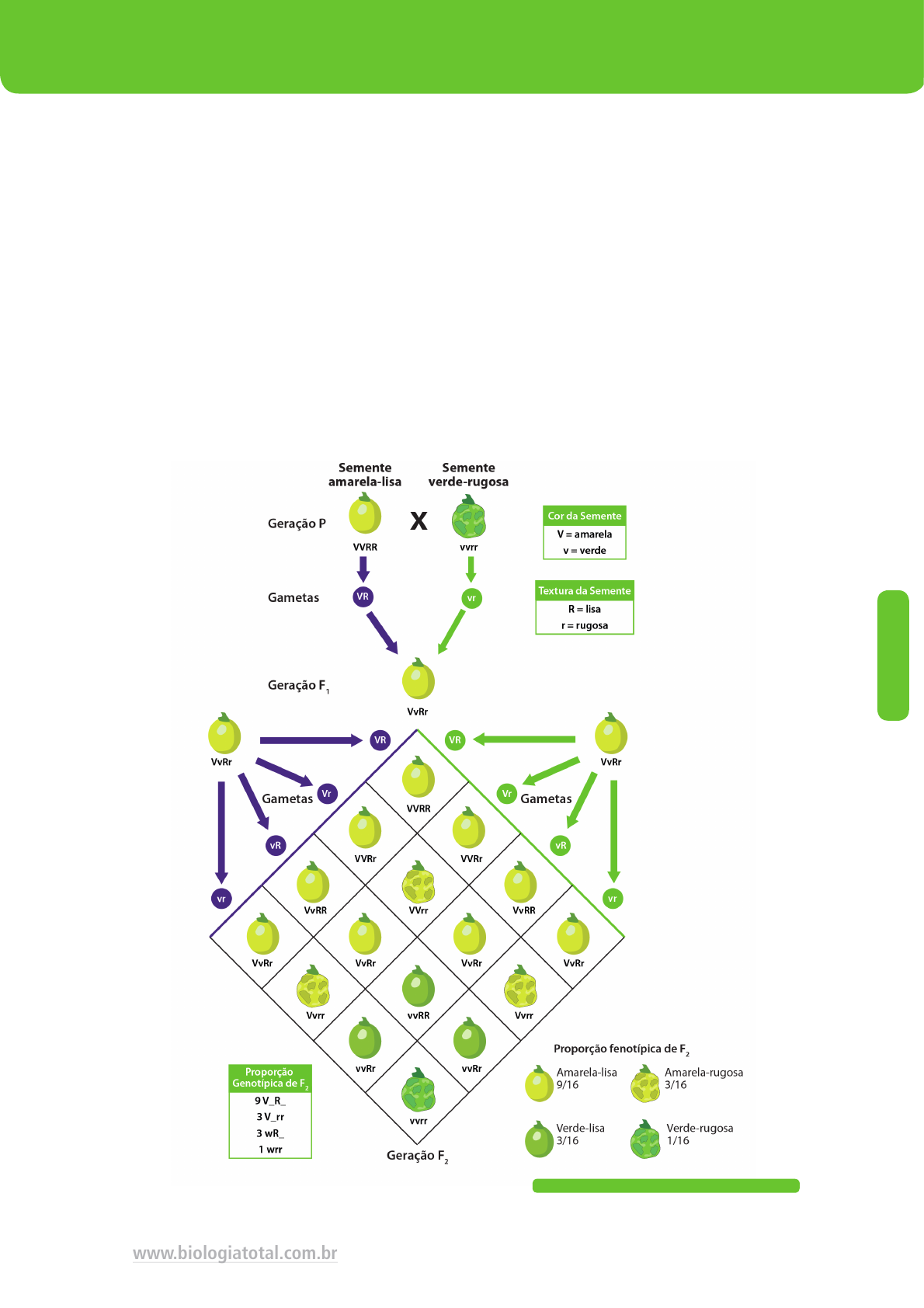 G EN ÉT IC A 57www.biologiatotal.com.br 2ª LEI DE MENDEL OU LEI DA SEGREGAÇÃO INDEPENDENTE Depois de estudar a herança de um único caráter hereditário (monoibridismo), Mendel passou a analisar a herança de dois caracteres combinados (diibridismo). Mendel tomou inicialmente linhagens de plantas com sementes amarelas lisas e outra linhagem de plantas de sementes verde rugosas, ambas puras, e as cruzou. Do cruzamento obteve plantas de sementes amarelas lisas. A experiência mostrou que os caracteres amarelo e liso dominam os caracteres verde e rugoso, respectivamente. Autofecundando os indivíduos de F1, Mendel obteve em F2 indivíduos de sementes amarelas lisas, amarelas rugosas, verdes lisas e verde rugosas, conforme a figura abaixo: Cruzamento demonstrando a Segregação Independente 58 G EN ÉT IC A As proporções de cada fenótipo obtido no cruzamento ilustrado acima são mostradas no esquema abaixo: Cruzamento mostrando as proporções obtidas Demonstração de cruzamento entre duplos-heterozigotos Separando as sementes pela cor, Mendel notou que 3/4 eram amarelas e 1/4 era verde. Levando em conta a forma das sementes, Mendel notou que 3/4 das sementes amarelas eram lisas e 1/4 era rugosa. Então, nesse cruzamento, chegamos à seguinte probabilidade: 9/16 – sementes Amarelas e Lisas (V_R_) 3/16 – sementes Amarelas Rugosas (V_rr) 3/16 – sementes Verdes Lisas (vvR_) 1/16 – sementes Verdes Rugosas (vvrr) Isto significa que, para cada 16 ervilhas, estatisticamente há 9 amarelas lisas, 3 amarelas rugosas, 3 verdes lisas e uma 1 verde rugosa, o que confere com o resultado da experiência. Mendel obteve esses resultados porque os pares de genes para cor e forma das sementes encontram-se em pares de cromossomos não homólogos. Nesse caso, ocorrem durante a meiose dois modos de os cromossomos se combinarem para formar os gametas, como se vê no esquema abaixo: Segregação durante a meiose (formação dos gametas) Admitimos, então, que os indivíduos cruzados em F1 produzem quatro tipos de gametas em iguais proporções. Assim, teremos na experiência de Mendel: O quadro abaixo mostra a geração F2. Observe que há 9 genótipos diferentes, entre os quatro fenótipos possíveis. G EN ÉT IC A 59www.biologiatotal.com.br Essa experiência demonstra a 2ª Lei de Mendel ou Lei da Segregação Independente dos Fatores. Quando trabalhamos com mais de duas características ao mesmo tempo, podemos usar o seguinte recurso, para saber quantos tipos diferentes de gametas o indivíduo irá formar: Nº DE GAMETAS DIFERENTES = 2n, onde n é igual ao número de genes em heterozigose Exemplo: AaBbCc = 2n = 23 = 8 tipos diferentes de gametas AaBBCcDdEeFfGG = 2n = 25 = 32 tipos de gametas diferentes. Segregação Independente entre 3 pares de genes Esta mesma lógica pode ser aplicada para mais de dois pares de genes. Por exemplo, se tivéssemos 3 pares de genes (VvRrBb) localizados em cromossomos diferentes, os três estariam em segregação independente e poderíamos aplicar o mesmo raciocínio. Veja o gráfico abaixo: LEITURA COMPLEMENTAR Super-humanos? Pesquisadores identificam pessoas resistentes a doenças mendelianas! Após anos estudando suas tão famosas flores de ervilhas, Gregor Mendel ficou famoso após postular as tão conhecidas e estudadas leis de Mendel. A partir de seus estudos, começamos a compreender de que forma as características genéticas eram transmitidas hereditariamente, passando de pais para filhos. Algumas doenças são herdadas de acordo com as leis propostas por Mendel sendo assim conhecidas como doenças mendelianas. Estas doenças ocorrem a partir de alterações genéticas em apenas um gene, e, normalmente, qualquer pessoa que carregue um destes genes alterado estaria sujeita à doença por ele transmitida. Até hoje, mais de seis mil doenças mendelianas já foram descritas. A fibrose cística, por exemplo, é um distúrbio que afeta as células produtoras de muco, prejudicando os pulmões e o sistema digestivo dos pacientes. Outras doenças mendelianas incluem a síndrome de Smith-Lemli-Opitz, a síndrome de Riley-Day e a síndrome de Pfeiffer. Até o momento, nenhuma destas doenças possui cura, e seus tratamentos apenas diminuem os sintomas causados, que podem muitas vezes levar à morte dos pacientes. Até alguns anos atrás, o foco dos pesquisadores estava na busca de um maior entendimento sobre como estas doenças ocorriam, quais os genes relacionados a cada uma delas e de que forma poderíamos melhorar os tratamentos já existentes. Agora, com uma maior compreensão dos mecanismos genéticos relacionados às doenças mendelianas, alguns pesquisadores resolveram estudar as doenças a partir de uma perspectiva diferente: estudando 60 G EN ÉT IC A pessoas saudáveis, que não possuem estas doenças. Mas, se as pessoas não possuem as doenças mendelianas, de que nos adianta estudar seus genes? Após estudar os dados genéticos de mais de meio milhão de pessoas, pesquisadores americanos, em parceria com universidades de diversos outros países, encontraram 13 pacientes que possuem os genes responsáveis pelo aparecimento de doenças mendelianas, porém, surpreendentemente, não apresentam quaisquer sintomas destas doenças! Mesmo carregando em seu DNA genes responsáveis pelo aparecimento de doenças mendelianas, os 13 “super-humanos” encontrados no estudo não apresentam quaisquer sintomas das doenças Devido a esta resistência às doenças mendelianas, estes pacientes receberam o apelido de super-heróis genéticos. A descoberta de pacientes resistentes a doenças tão devastadores pode abrir portas para novos estudos e para o desenvolvimento de novos tratamentos. Porém, os pesquisadores se depararam com um grande problema após esta incrível descoberta: como o projeto foi realizado a partir de amostras doadas anonimamente, ninguém sabe quem são estes 13 super-humanos! A análise destes pacientes resistentes a estas doenças poderia revela