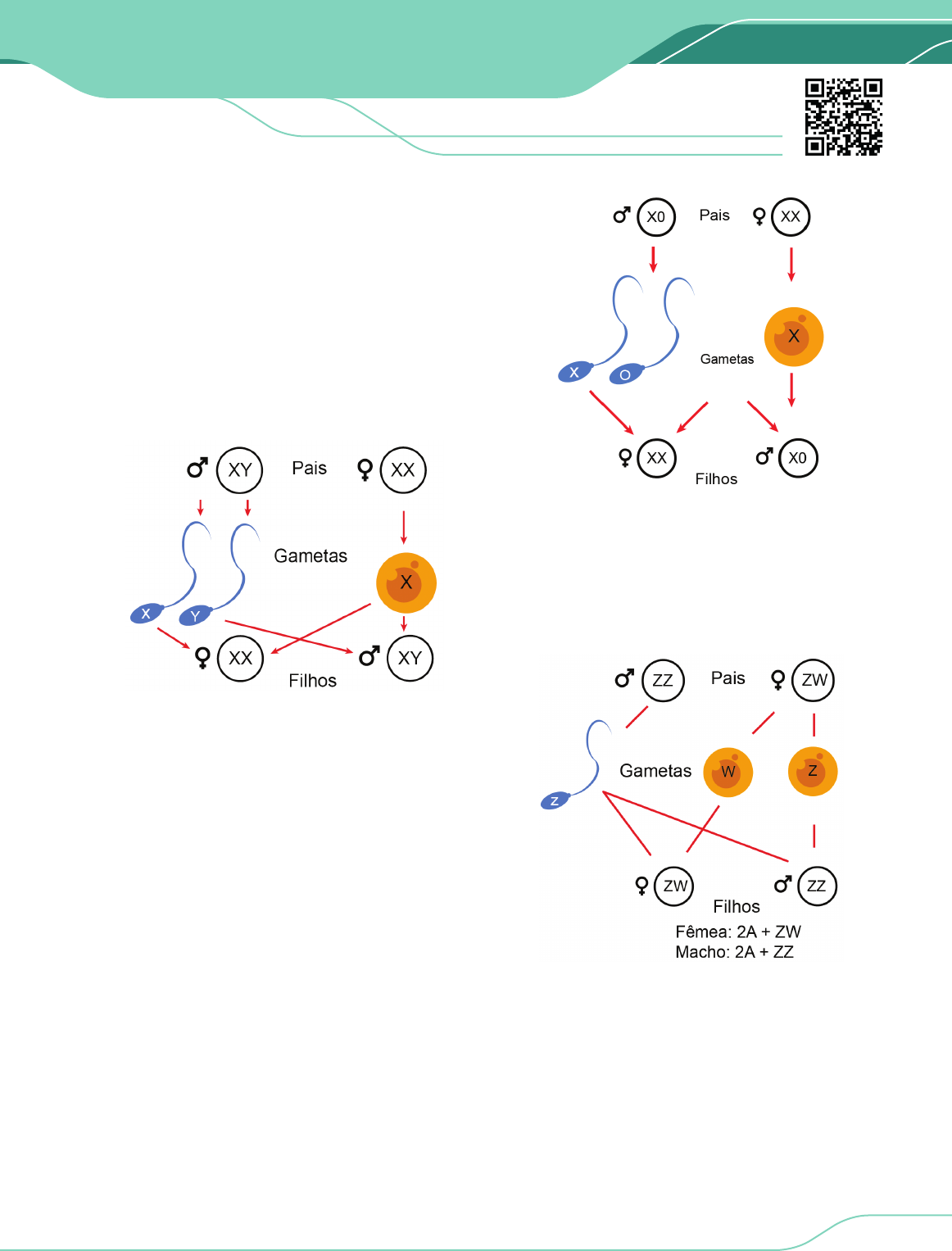 BIOLOGIA II PRÉ-VESTIBULAR 1PROENEM.COM.BR 19 HERANÇA GENÉTICA SEXUAL Em um cariótipo normal, encontramos dois grupos distintos de cromossomos: os autossômicos (autossomos) e os cromossomos sexuais. Assim, enquanto a manifestação de genes localizados em autossomos (herança autossômica) não é influenciada ou influencia o sexo biológico, a expressão de genes localizados em cromossomos sexuais varia em função do sexo biológico do indivíduo estudado. Em função dos cromossomas sexuais, existem três mecanismos para determinação do sexo nos animais. TIPO DROSÓFILA OU XY É o tipo em que os cromossomos sexuais da fêmea são iguais (XX). Nos machos, os cromossomos sexuais são desiguais (XY). Devido a esse fato, as fêmeas são deno minadas homogaméticas e os machos heterogaméticos. Este mesmo padrão determina o sexo biológico em humanos. O conjunto haploide de autossomos é designado pela letra A e, desta forma, o conjunto cromossômico dos seres humanos pode ser representado dos seguintes modos: • Mulher: 44 + XX = 46 • Homem 44 + XY = 46 TIPO PROTENOR OU X0 Neste sistema a determinação do sexo masculino ocorre pela ausência de um cromossomo-homólogo no que deveria ser um par de cromossomos sexuais. Assim, a determinação X0 simboliza que a presença de um único cromossomo X dirige a formação de um indivíduo do sexo masculino. As fêmeas, desta forma, tem sua formação determinada pela presença de um par de cromossomos sexuais iguais (XX). Este sistema é comum à maioria dos insetos. TIPO ABRAXAS OU ZW Neste tipo, ao invés de descrevermos os cromossomos sexuais como X e Y, chamamos um de Z e o outro de W para evitar confusão com outros grupos. Neste sistema, os cromossomos sexuais dos machos são iguais (ZZ) e os da fêmea são desiguais (ZW). Devido a esse fato, as fêmeas são denominadas heterogaméticas e os machos homogaméticos. PRÉ-VESTIBULARPROENEM.COM.BR2 BIOLOGIA II 19 HERANÇA GENÉTICA SEXUAL HERANÇA LIGADA AO SEXO (LIGADA AO X) No sistema de determinação sexual humano baseado nos cromossomos X e Y, a presença de genes no cromossomo X pode afetar a ambos os sexos biológicos, ainda que isto ocorra de maneiras diferentes. Os exemplos com os quais trabalharemos envolvem genes situados na região do X não homóloga ao Y e, portanto, aparecem em dose dupla na mulher e em dose simples no homem (hemizigose). Daltonismo A visão humana é devido às células nervosas em forma de bastonetes e cones. Os bastonetes regulam a visão em preto e branco e, os cones, a cromática. Os cones são de 3 tipos: sensíveis ao vermelho, ao verde e ao azul. As pessoas daltônicas são na maioria dicromáticas porque sobrepõem os espectros luminosos do vermelho e do verde, ainda que haja outros tipos de daltonismo. O daltonismo é determinado por uma herança recessiva ligada ao sexo e, como visto no quadro, é determinado por um alelo recessivo d, enquanto seu alelo dominante D determina visão normal. É importante notar que as mulheres, por possuírem dois cromossomos X, possuem maior chance de herdar um alelo dominante e, por isso, são menos frequentemente afetadas pelo daltonismo. Como homens apresentam apenas um cromossomo X, herdar um alelo recessivo d determina a manifestação do daltonismo, tornando este fenótipo mais frequente em homens. FENÓTIPOS GENÓTIPOS Mulher de visão normal XDXD Mulher de visão normal XDXd Mulher daltônica XdXd Homem de visão normal XDY Homem daltônico XdY Mulheres daltônicas (XdXd) sempre transmitem um alelo recessivo à sua prole, determinando que todos os seus homens sejam daltônicos (XdY), ainda que a determinação fenotípica de suas filhas mulheres dependa do outro alelo proveniente do ascendente paterno. Homens daltônicos, por sua vez, não transmitem seu alelo afetado aos filhos homens, uma vez que são responsáveis pela transmissão do cromossomo Y. Suas filhas mulheres, sempre herdarão o alelo afetado (Xd). Desta forma, estas filhas mulheres serão portadoras do daltonismo (XDXd) se receberem um alelo normal de suas mães ou daltônicas (XdXd) se receberem um alelo afetado de suas mães. Hemofilia Caracteriza-se pela dificuldade de coagulação do san gue quando está ocorrendo uma hemorragia. A hemofilia A, com determinação por herança recessiva ligada ao sexo, ocorre pela ineficiência na produção de uma proteína importante à coagulação sanguínea que é conhecida como fator VIII. Sua determinação genética é similar àquela estudada para o daltonismo e pode ser observada na tabela a seguir. FENÓTIPOS GENÓTIPOS Mulher normal XHXH Mulher normal XHXh Mulher hemofílica XhXh Homem normal XHY Homem hemofílico XhY HERANÇA HOLÂNDRICA OU RESTRITA AO SEXO É uma herança determinada por um gene que se localiza no cromossomo Y, numa região não homóloga ao X. Desta maneira, o caráter só aparece em indivíduos do sexo masculino. Tradicionalmente, a hipertricose, ou seja, presença de pelos no pavilhão auditivo dos homens, era citada como um exemplo de herança restrita ao sexo. No entanto, a evidência que a hipertricose deve-se a uma herança ligada ao Y está sendo considerada inconclusiva, pois, em algu mas famílias estudadas, os pais com hiperticose tiveram filhos homens com e sem pelos nas bordas das orelhas. Na herança restrita ao sexo verdadeira, como para o gene SRY (sex-determining region of Y chromossome) para todo homem afetado teremos sempre todos os seus filhos homens afetados e suas filhas mulheres, que não recebem o cromossomo Y, normais. HERANÇA INFLUENCIADA PELO SEXO Neste padrão hereditário, genes autossômicos manifestam-se diferen temente em machos e fêmeas, pois sofrem influência do sexo do seu portador, determinando a expressão de dominância ou recessividade. Um bom exemplo na espécie humana é o gene C para calvície que atua como dominante no homem e recessivo na mulher. O alelo recessivo c determina conservação normal dos cabelos. GENÓTIPOS FEN