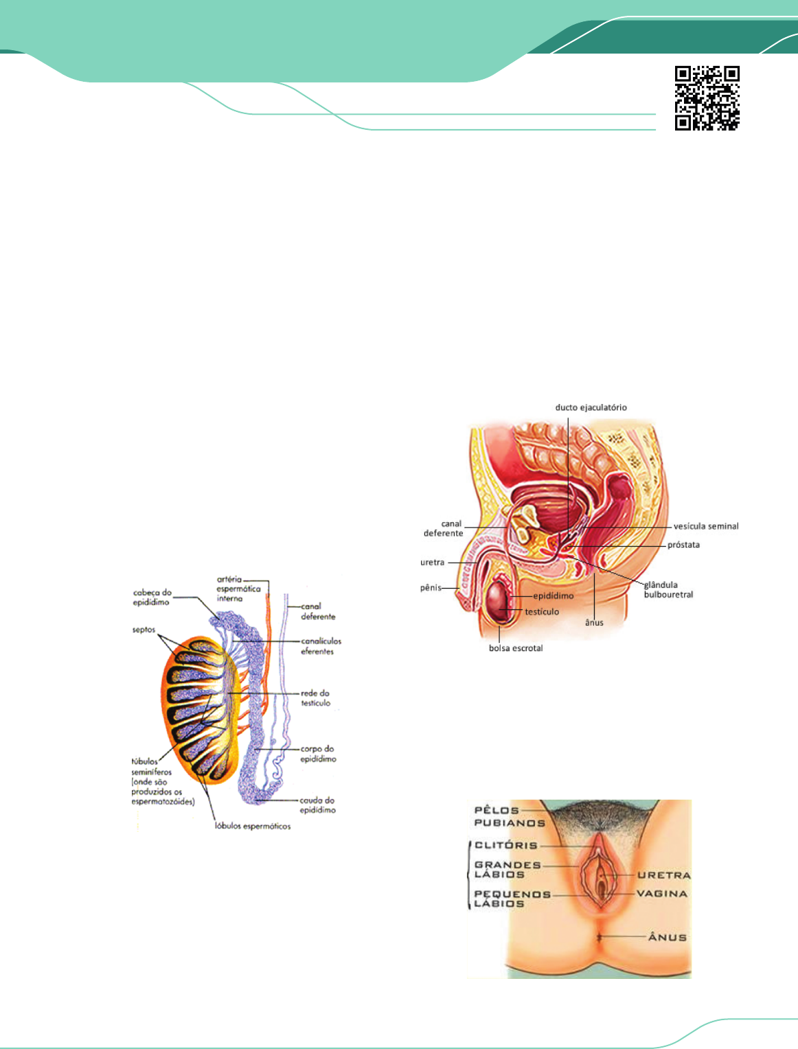 BIOLOGIA I PRÉ-VESTIBULAR 53PROENEM.COM.BR 31 SISTEMA REPRODUTOR HUMANO INTRODUÇÃO A reprodução sexuada depende da capacidade que um organismo possui de unir seu material genético ao de um parceiro da mesma espécie. Em humanos, está relação se estabelece através da produção de células sexuais (gametas) que são produzidas em órgãos específicos conhecidos como gônadas. Assim, os gametas masculinos (espermatozoides) depois de serem produzidos nas gônadas (testículos) precisam encontrar os ovócitos secundários – nome dado à fase que antecede um óvulo – que gerados nos ovários. SISTEMA REPRODUTOR MASCULINO As gônadas masculinas, ou testículos, ficam abrigadas em uma bolsa conhecida como escroto (bolsa ou saco escrotal). A sua localização externa à cavidade abdominal reduz a temperatura(2 a 3 graus) a qual os espermatozoides são submetidos, permitindo a sua correta produção nos túbulos seminíferos. Após algumas divisões celulares, os gametas masculinos seguem para o epidídimo para concluir sua etapa de diferenciação chamada de epermiogênese. No epidídimo, então, ocorre a especialização dos espermatozóides a partir de células conhecidas como espermátides e, lá, esses gametas permanecem armazenados até o momento da ejaculação. Além da produção de espermatozoides, os testículos também são responsáveis pela síntese e secreção do hormônio masculinizante. A testosterona, produzida a partir da puberdade, determina a manifestação das características sexuais secundárias masculinas abordadas no módulo anterior. Uma vez que haja estímulo sexual para a liberação das células sexuais, estas devem seguir o canal deferente até que este se conecte à uretra. O canal deferente é um tubo que parte do interior da bolsa escrotal, circunda a bexiga urinária no interior do abdômen e, neste trajeto, recebe secreções provenientes de três glândulas distintas: vesícula seminal, próstata e bulbouretral. As funções das secreções eliminadas por estas glândulas são listadas a seguir. • Vesícula seminal: nutre os espermatozoides com subs- tâncias ricas em energia como o açúcar frutose. • Próstata: equilibra o nível de acidez do canal vaginal (naturalmente ácido) após a ejaculação para que os espermatozoides mantenham sua viabilidade. • Bulbouretral: elimina sua secreção antes da ejaculação para que a uretra não contenha traços de urina durante o momento da ejaculação, aumentando a viabilidade dos espermatozoides. Depois de receber todas estas secreções exócrinas, os espermatozoides chegam à uretra, um canal que é comum aos sistemas excretor e reprodutor nos homens. Este ducto termina sua trajetória, iniciada no interior do abdômen, passando pelo pênis que atua como órgão copulador. A ereção deste órgão depende da irrigação sanguínea que flui através de três cilindros de tecido esponjoso e cavernoso que o compõem. Assim, é através do pênis ereto que o sêmen pode ser introduzido no interior do canal vaginal para que o próximo passo em direção à reprodução seja dado. SISTEMA REPRODUTOR FEMININO As características sexuais primárias femininas podem ser didaticamente compreendidas a partir de dois pontos de vista, um externo e um interno. Externamente podemos identificar dois pares de pregas de pele conhecidas como lábios vaginais, grandes e pequenos. Os grandes lábios delimitam a região denominada vulva que também inclui a abertura do canal vaginal, o clitóris e a saída da uretra. PRÉ-VESTIBULARPROENEM.COM.BR54 BIOLOGIA I 31 SISTEMA REPRODUTOR HUMANO Os lábios vaginais atuam como barreiras contra agentes infecciosos e protegem tanto a uretra quanto o canal vaginal, ainda que a primeira seja exclusiva do sistema excretor nas mulheres. O canal vaginal tanto funciona como um receptáculo para o pênis e para o sêmen, quanto atua como local de passagem para o bebê durante o momento do parto e como região através da qual é eliminada a menstruação. Por último, o clitóris é um ponto extremamente vascularizado e rico em terminações nervosas, sendo um local importante na determinação do prazer durante o ato sexual para a mulher. Externamente só é possível notar a terminação do clitóris (glande), sendo a sua maior parte interna à parede abdominal. O canal vaginal se continua internamente ao abdômen e termina em outra cavidade, o útero. Este é composto por três camadas: perimétrio, miométrio e endométrio. O perimétrio se localiza mais externamente à cavidade uterina (lúmen ou luz uterina), sendo composto por tecido conjuntivo. O miométrio, formado por tecido muscular, é intermediário e responsável pelas contrações uterinas durante a menstruação e o parto. Internamente, o endométrio prolifera durante o período menstrual e, caso não haja gravidez, descama e origina a menstruação ao término de aproximadamente vinte e oito dias. Em casos de gestação, o endométrio permanece espessado e funciona como local de ancoragem do embrião durante o processo de nidação. A partir do útero partem duas tubas uterinas (trompas da Falópio) que se comunicam com os ovários localizados em suas extremidades. Assim, uma vez que um ovócito secundário seja liberado durante a ovulação, as pontas das tubas uterinas (fímbrias) o puxam para o seu interior de forma que este seja conduzido a partir do movimento de cílios situados nas paredes destes canais. Em geral, é no primeiro terço das tubas uterinas – mais próximo aos ovários – que ocorre a fecundação, ainda que isto também possa acontecer em todo o caminho até o útero. Além de serem responsáveis pela produção dos gametas femininos, os ovários também atuam na produção de hormônios. Assim, estrogênio e progesterona trabalham de forma a regular o ciclo menstrual – período de aproximadamente vinte e oito dias que se inicia no primeiro dia de menstruação e perdura até a que a próx