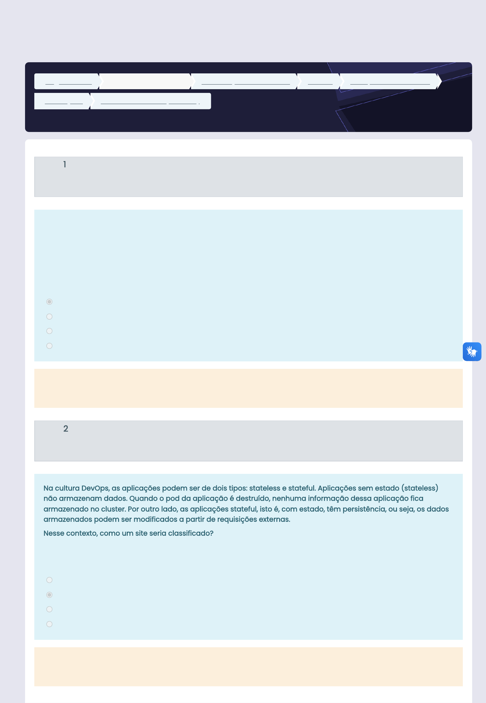 ... Página inicial Disciplinas e Espaços GRADUAÇÃO A DISTÂNCIA 2023-4 Devops - Módulo 04_A Avaliações P2 - Prova On-line (Acessar) Questão 1 Correto Atingiu 1,00 de 1,00 Questão 2 Correto Atingiu 1,00 de 1,00 A computação em nuvem e a cultura DevOps trabalham juntas, buscando melhorar os resultados das empresas e diminuir os custos. Um aspecto importante da nuvem são os modelos de implantação. Eles dizem respeito onde estão os recursos e quem tem acesso e controle aos mesmos. Nesse sentido, qual das alternativas a seguir representa os três modelos de implantação de computação em nuvem? Escolha uma opção: a. Pública, privada e híbrida. b. Aberta, protegida e híbrida. c. Aberta, privada e mista. d. Pública, privada e mista. Sua resposta está correta. A resposta correta é: Pública, privada e híbrida. Na cultura DevOps, as aplicações podem ser de dois tipos: stateless e stateful. Aplicações sem estado (stateless) não armazenam dados. Quando o pod da aplicação é destruído, nenhuma informação dessa aplicação fica armazenado no cluster. Por outro lado, as aplicações stateful, isto é, com estado, têm persistência, ou seja, os dados armazenados podem ser modificados a partir de requisições externas. Nesse contexto, como um site seria classificado? Escolha uma opção: a. Stateful. b. Stateless e stateful. c. Stateless com sincronização de dados. d. Stateless. Sua resposta está correta. A resposta correta é: Stateless e stateful. https://ava.candidomendes.edu.br/moodle/ https://ava.candidomendes.edu.br/moodle/course/index.php?categoryid=8 https://ava.candidomendes.edu.br/moodle/course/index.php?categoryid=167 https://ava.candidomendes.edu.br/moodle/course/view.php?id=13296 https://ava.candidomendes.edu.br/moodle/course/view.php?id=13296§ion=4 https://ava.candidomendes.edu.br/moodle/mod/quiz/view.php?id=439681 Questão 3 Correto Atingiu 1,00 de 1,00 Questão 4 Correto Atingiu 1,00 de 1,00 Os sistemas de controle de versão têm um conjunto de operações que facilitam a organização e o controle dos códigos-fonte implementados pelas equipes. Dentre elas, há uma responsável pela recuperação de uma versão específica do arquivo. Que operação é essa? Escolha uma opção: a. Diff. b. Commit. c. Checkout. d. Revert. Sua resposta está correta. A resposta correta é: Checkout. O software Docker é uma solução que provê compatibilidade entre bibliotecas, dependências e sistemas operacionais, a partir da execução de contêineres isolados. Sobre os contêineres Docker, leia a afirmação a seguir. Os contêineres Docker são baseados em um padrão aberto, ________. Assinale a alternativa que completa a frase corretamente: Escolha uma opção: a. permitindo que contêineres sejam executados em todas as principais distribuições do Linux, Sistemas Operacionais Microsoft e Mac. b. permitindo que os contêineres sejam executados apenas nas principais distribuições do Linux. c. permitindo que contêineres sejam executados nas distribuições do Linux baseadas em Debian, Sistemas Operacionais Microsoft e Mac. d. permitindo que os contêineres sejam executados em todos os Sistemas Operacionais apenas da Microsoft. Sua resposta está correta. A resposta correta é: permitindo que contêineres sejam executados em todas as principais distribuições do Linux, Sistemas Operacionais Microsoft e Mac. Questão 5 Correto Atingiu 1,00 de 1,00 Questão 6 Correto Atingiu 1,00 de 1,00 Questão 7 Completo Atingiu 2,00 de 2,00 Na arquitetura monolítica, todas as funções do software ficam contidas em um único artefato de software executável e são desenvolvidas e publicadas em conjunto. Quanto à arquitetura monolítica, marque a alternativa correta: Escolha uma opção: a. Sistemas pequenos conseguem ser rapidamente desenvolvidos. b. Sistemas de grande porte conseguem ser atualizados em produção de forma rápida. c. Não é possível desenvolver sistemas de qualidade com essa arquitetura. d. Sistemas se tornam mais fáceis de manter à medida que o produto cresce. Sua resposta está correta. A resposta correta é: Sistemas pequenos conseguem ser rapidamente desenvolvidos. Suponha que João esteja com problemas de qualidade em seu projeto no Jenkins. Ele precisa identificar por que seus testes estão instáveis, ou seja, às vezes passam, às vezes falham. Ele costuma acessar as builds manualmente para checar essas informações, gastando muito tempo. Qual dos plugins do Jenkins a seguir é recomendável para que use e identifique as causas e quando os testes começaram a falhar, de forma simplificada? Escolha uma opção: a. Monitoring. b. Test Results Analyser. c. JUnit. d. Bootstrapped-multi-test-result-report. Sua resposta está correta. A resposta correta é: Test Results Analyser. A evolução no desenvolvimento de software trouxe a necessidade de maior controle, principalmente do código- fonte. Isso se deve ao fato de organizar as solicitações corretivas, evoluir com novas funcionalidades e disponibilizar novas versões. O que o controle de versão possibilitou? Comentário: Questão 8 Completo Atingiu 2,00 de 2,00 O DevOps prevê um processo chamado fluxo de implantação (deployment pipeline), que agiliza e automatiza os meios de disponibilização de novas versões de software aos usuários. Quais são as quatro etapas desse processo? Comentário: