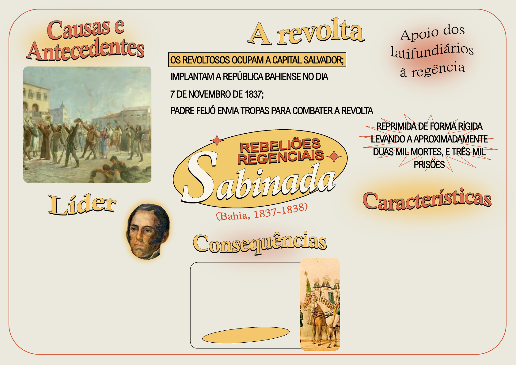 Derrota em 1838 1. LEVANTE ARMADO 2. NÃO FOI UM MOVIMENTO SEPARATISTA 3. REPÚBLICA BAHIENSE 4. IMPEDIMENTO DO PADRE DIOGO FEIJÓ 5. CONTRA A ABOLIÇÃO DA ESCRAVATURA 6. REVOLTA DE PEQUENA ESCALA 7. SENHORES DE ENGENHO + GOVERNO CENTRAL 8. A LIBERDADE DOS ESCRAVOS ESTAVA CONDICIONADA À ADESÃO À REVOLTA PERÍODO REGENCIAL MOMENTO DE INSTABILIDADE LUTA PELA AUTONOMIA CENTRALIZAÇÃO DO PODER BAHIA AGITADA POLITICAMENTE PROBLEMAS ECONÔMICOS ECONOMIA AÇUCAREIRA Francisco Sabino - DEU NOME À REVOLTA; - INSPIROU-SE NA REVOLUÇÃO FARROUPILHA; - JORNALISTA REVOLUCIONÁRIO BRASILEIRO; - DIVULGOU SEUS IDEAIS - APOIO POUPULAÇÃO - INTERESSES EMANCIPACIONISTAS E REPUBLICANOS. REPRESSÃO PELAS FORÇAS GOVERNAMENTAIS REVOLUÇÃO FARROUPILHA →FUGA ANISTIA - D. PEDRO II