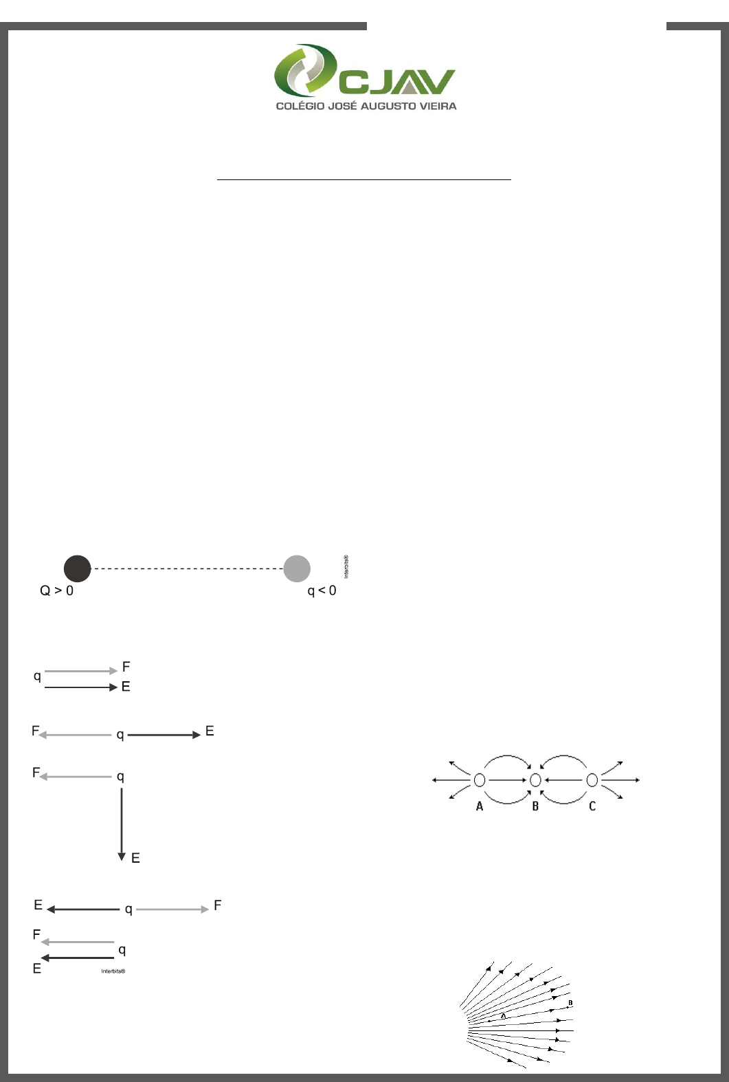 Aluno (a): ___________________________________________ Série: _____ Data: __/__/__ ATIVIDADE DE FÍSICA SOBRE CAMPO ELÉTRICO 1) A Gaiola de Faraday nada mais é do que uma blindagem eletrostática, ou seja, uma superfície condutora que envolve e delimita uma região do espaço. A respeito desse fenômeno, considere as seguintes afirmativas. I. Se o comprimento de onda de uma radiação incidente na gaiola for muito menor do que as aberturas da malha metálica, ela não conseguirá o efeito de blindagem. II. Se o formato da gaiola for perfeitamente esférico, o campo elétrico terá o seu valor máximo no ponto central da gaiola. III. Um celular totalmente envolto em um pedaço de papel alumínio não receberá chamadas, uma vez que está blindado das ondas eletromagnéticas que o atingem. IV. As cargas elétricas em uma Gaiola de Faraday se acumulam em sua superfície interna. Assinale a alternativa que apresenta apenas afirmativas corretas. a) I e II. b) I e III. c) II e III. d) III e IV. 2) Duas cargas elétricas puntiformes, Q e q, sendo Q positiva e q negativa, são mantidas a uma certa distância uma da outra, conforme mostra a figura. A força elétrica F, que a carga negativa q sofre, e o campo elétrico E, presente no ponto onde ela é fixada, estão corretamente representados por: A) B) C) D) E) 3) A tecnologia dos aparelhos eletroeletrônicos está baseada nos fenômenos de interação das partículas carregadas com campos elétricos e magnéticos. A figura representa as linhas de campo de um campo elétrico. Assim, analise as afirmativas: I. O campo é mais intenso na região A. II. O potencial elétrico é maior na região B. III. Uma partícula com carga negativa pode ser a fonte desse campo. Está(ão) correta(s): a) apenas I. b) apenas II. c) apenas III. d) apenas II e III. e) I, II e III. 4) Revistas de divulgação científica ajudam a população, de um modo geral, a se aproximar dos conhecimentos da Física. No entanto, muitas vezes alguns conceitos básicos precisam ser compreendidos para o entendimento das informações. Nesse texto, estão explicitados dois importantes conceitos elementares para a compreensão das informações dadas: o de campo elétrico e o de corrente elétrica. Assinale a alternativa que corretamente conceitua campo elétrico. a) O campo elétrico é uma grandeza vetorial definida como a razão entre a força elétrica e a carga elétrica. b) As linhas de força do campo elétrico convergem para a carga positiva e divergem da carga negativa. c) O campo elétrico é uma grandeza escalar definida como a razão entre a força elétrica e a carga elétrica. d) A intensidade do campo elétrico no interior de qualquer superfície condutora fechada depende da geometria desta superfície. e) O sentido do campo elétrico independe do sinal da carga Q, geradora do campo. 5) A figura a seguir representa a configuração de linhas de campo elétrico produzida por três cargas puntuais, todas com o mesmo módulo Q. Os sinais das cargas A, B e C são, respectivamente: a) negativo, positivo e negativo. b) negativo, negativo e positivo. c) positivo, positivo e positivo. d) negativo, negativo e negativo. e) positivo, negativo e positivo. 6) Na figura a seguir aparece a representação, por linhas de força, do campo elétrico numa certa região do espaço: Física – Profª. Gualberto a) DIGA onde a intensidade do campo elétrico é maior: nas proximidades do ponto A, ou nas proximidades do ponto B? JUSTIFIQUE sua resposta. b) Suponha que uma partícula carregada positivamente seja largada em repouso no ponto A. A tendência da partícula será se deslocar para a direita, para a esquerda, ou permanecer em repouso? JUSTIFIQUE sua resposta. 7) Uma carga Q = 2 x 10-6C gera no ponto P um campo elétrico, distante 0,5m. Sendo o meio o vácuo, onde K = 9 x 109 N.m2/C2. Determine: a) A intensidade do campo elétrico gerado pela carga Q; b) a força elétrica que age sobre uma carga de prova q=2µC, no ponto P. 8) Uma carga puntiforme positiva Q1 = 18 x 10-6C dista, no vácuo, 20 cm de uma carga puntiforme negativa Q2 = -8 x 10-6C, conforme a figura. Qual é a intensidade do vetor campo elétrico E criado por essas duas cargas no ponto P, sendo K0 = 9,0 x 109 N.m2/C2? 9) Uma partícula de carga elétrica q = 3 x 10-6C, colocada num ponto P localizado a 3 m de uma carga Q, no vácuo, sofre a ação de uma força de módulo F = 1,5 x 10-2N. Sendo K = 9 x 109 N.m2/C2. a) Qual o módulo do campo elétrico em P? b) Admitindo-se que esse campo elétrico se deve exclusivamente a Q, qual o valor de Q? 10) Uma carga elétrica de 5,0 x10-6 C é posta num ponto do espaço, onde fica sob a ação de uma força elétrica de 10 N, para o norte. Nesse referido ponto, o campo elétrico tem intensidade de: a) 2x10-6 N/C e dirige-se para o norte. b) 50 x10-6 N/C e dirige-se para o sul. c) 0,5 x10-6 N/C e dirige-se para o sul. d) 0,5 x10-6 N/C e dirige-se para o norte. e) 2 x10-6 N/C e dirige-se para o norte. 11. Considere a seguinte experiência: "Um cientista construiu uma grande gaiola metálica, isolou-a da Terra e entrou nela. Seu ajudante, então, eletrizou a gaiola, transferindo-lhe grande carga." Pode-se afirmar que: a) o cientista nada sofreu, pois o potencial da gaiola era menor que o de seu corpo. b) o cientista nada sofreu, pois o potencial de seu corpo era o mesmo que o da gaiola. c) mesmo que o cientista houvesse tocado no solo, nada sofreria, pois o potencial de seu corpo era o mesmo que o do solo. d) o cientista levou choque e provou com isso a existência da corrente elétrica. 12. Durante tempestade, um raio atinge um avião em vôo. Pode-se afirmar que a tripulação: a) não será atingida, pois aviões são obrigados a portar um pára-raios em sua fuselagem. b) será atingida em virtude de a fuselagem metálica ser boa condutora de eletricidade. c) será parcialmente atingida, pois a carga será homogeneamente distribuída na superfície interna do avião. d) não
