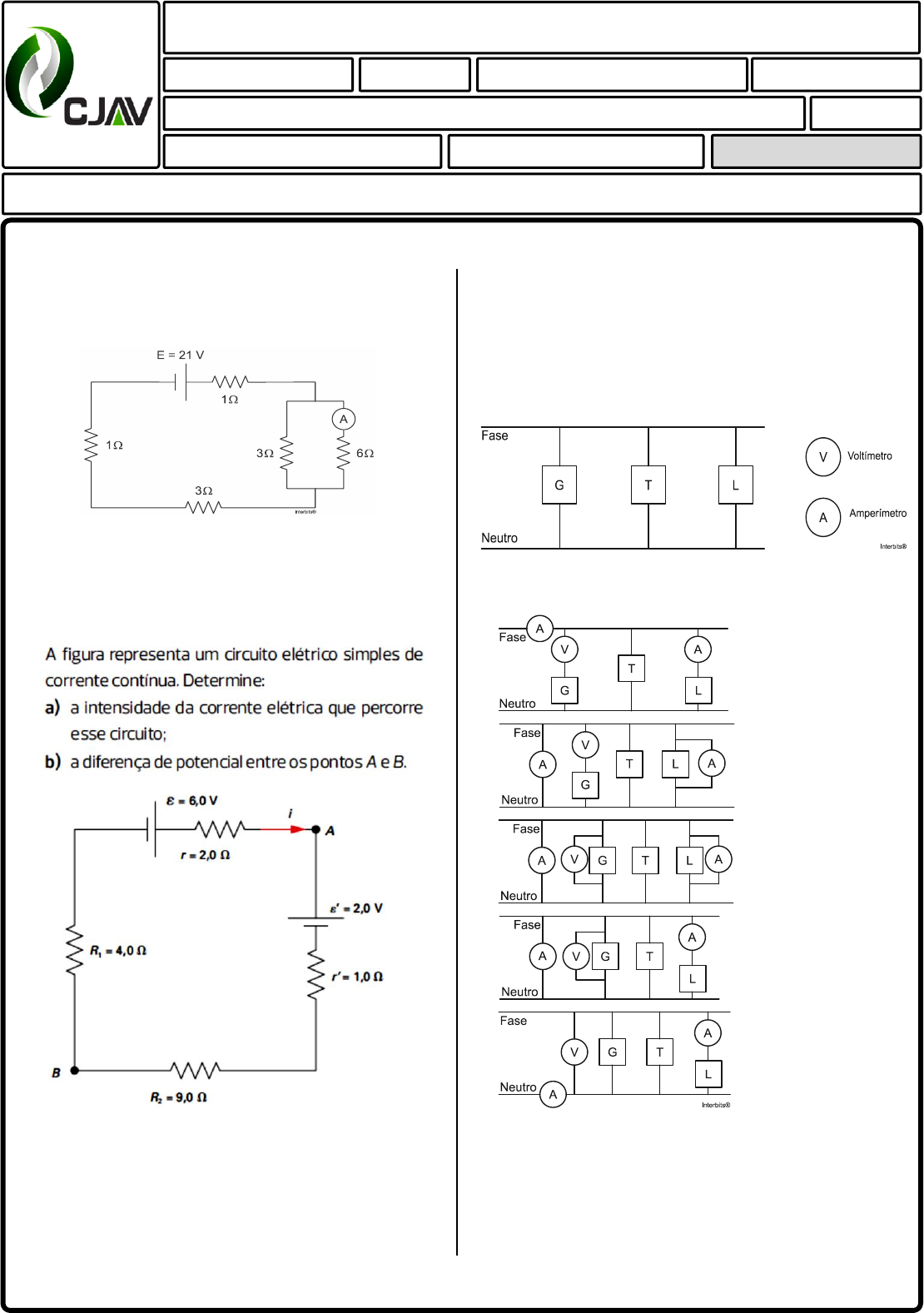COLÉGIO JOSÉ AUGUSTO VIEIRA CIDADE: LAGARTO DIA: MÊS: ANO: 2022 NOME: Nº SÉRIE: 2° ANO DO ENSINO MÉDIO PROFESSOR: GUALBERTO JOSÉ FÍSICA ATIVIDADE SOBRE MEDIDORES ELÉTRICOS E ASSOCIAÇÃO DE RESISTORES 1. O circuito elétrico representado no diagrama abaixo contém um gerador ideal de 21 Volts com resistência interna desprezível alimentando cinco resistores. Qual o valor da medida da intensidade da corrente elétrica, expressa em amperes, que percorre o amperímetro A conectado ao circuito elétrico representado? a) 0,5 A b) 1,0 A c) 1,5 A d) 2,0 A e) 2,5 A 2. 3. (Enem) Um eletricista analisa o diagrama de uma instalação elétrica residencial para planejar medições de tensão e corrente em uma cozinha. Nesse ambiente existem uma geladeira (G), uma tomada (T) e uma lâmpada (L), conforme a figura. O eletricista deseja medir a tensão elétrica aplicada à geladeira, a corrente total e a corrente na lâmpada. Para isso, ele dispõe de um voltímetro (V) e dois amperímetros (A). Para realizar essas medidas, o esquema da ligação desses instrumentos está representado em: a) b) c) d) e) 4. Calcule a corrente em ampères medida no amperímetro (A) do circuito apresentado na figura. a) 1,6 b) 3,3 c) 5,0 d) 8,3 e) 20,0 5. (Enem PPL) Um eletricista precisa medir a resistência elétrica de uma lâmpada. Ele dispõe de uma pilha, de uma lâmpada (L), de alguns fios e de dois aparelhos: um voltímetro (V), para medir a diferença de potencial entre dois pontos, e um amperímetro (A), para medir a corrente elétrica. O circuito elétrico montado pelo eletricista para medir essa resistência é: a) b) c) d) e) 6. Assinale a alternativa que explica corretamente o funcionamento dos elementos componentes de um circuito elétrico. a) A resistência interna do amperímetro deve ser muito pequena, de forma a não interferir no valor da corrente a ser medida. b) Os fusíveis são elementos de proteção, pois não deixam passar qualquer corrente que os atinja. c) Os resistores são elementos muito utilizados para economizar energia elétrica, pois produzem energia térmica. d) A capacidade de geração de energia por uma bateria termina quando sua resistência interna diminui, esgotando-a. e) Os receptores de um circuito elétrico convertem toda a energia elétrica recebida em energia térmica. 7. Voltímetros e amperímetros são os instrumentos mais usuais para medições elétricas. Evidentemente, para a obtenção de medidas corretas, esses instrumentos devem ser conectados de maneira adequada. Além disso, podem ser danificados se forem conectados de forma incorreta ao circuito. Suponha que se deseja medir a diferença de potencial a que está submetido o resistor R2 do circuito a seguir, bem como a corrente elétrica que o percorre. Assinale a figura que representa a correta conexão do voltímetro (V) e do amperímetro (A) ao circuito para a realização das medidas desejadas. a) b) c) d) e) 8. A montagem experimental representada na figura se destina ao estudo de um circuito elétrico simples. a) Usando símbolos convencionais para cada componente, represente esquematicamente esse circuito. b) Sabendo que R1 = 100 Ω e R2 = 200 Ω e que no suporte de pilhas são colocadas duas pilhas em série, de força eletromotriz 1,5 V cada, determine as leituras no amperímetro e no voltímetro quando a chave é fechada. (Admita que as resistências internas das pilhas, dos fios de ligação e dos medidores não interferem nessas leituras.) 9. Cinco alunos participaram de uma aula prática no Laboratório de Física. Cada aluno recebeu uma bateria, dois resistores, um voltímetro e um amperímetro. Os dois últimos instrumentos são considerados ideais. O objetivo da aula era montar um circuito que associasse os dois resistores em série à bateria; o voltímetro, indicando a diferença de potencial de um dos resistores e o amperímetro, indicando a corrente do circuito. Considerando os símbolos acima, acertou o aluno que montou o circuito indicado na opção: 10. A pilha de uma lanterna possui uma força eletromotriz de 1,5 V e resistência interna de 0,05 .Ω O valor da tensão elétrica nos polos dessa pilha quando ela fornece uma corrente elétrica de 1,0 A a um resistor ôhmico é de a) 1,45 V b) 1,30 V c) 1,25 V d) 1,15 V e) 1,00 V 11. Uma pilha de f.e.m. igual a 3,6 V tem uma carga inicial de 600 mA.h. Supondo que a diferença de potencial entre os polos da pilha permaneça constante até que a pilha esteja completamente descarregada, o tempo (em horas) que ela poderá fornecer energia à taxa constante de 1,8 W é de: a) 2,4 b) 1,2 c) 3,6 d) 7,2 12. O gráfico mostra valores dos potenciais elétricos em um circuito constituído por uma pilha real e duas lâmpadas idênticas de 0,75 V - 3 mA, conectadas por fios ideais. O valor da resistência interna da pilha, em Ù, e: a) 100. b) 120. c) 150. d) 180. e) 300. 13. Quatro lâmpadas de filamento, idênticas, são conectadas a duas pilhas obedecendo ao circuito elétrico. Inicialmente, as quatro lâmpadas encontram-se acesas. Se, em dado momento, somente a lâmpada 4L tiver seu filamento rompido, apagando-se, é correto concluir que. Admita que, se apenas uma dessas lâmpadas fosse ligada às duas pilhas, ela não se queimaria por sobrecarga. a) só 3L permanecerá acesa. b) só 1L e 2L permanecerão acesas. c) só 1L e 3L permanecerão acesas. d) as demais lâmpadas permanecerão acesas. e) nenhuma das lâmpadas permanecerá acesa. 14. Considere três resistores 1R 12 ,= 2R 6= e 3R 4 ,= associados conforme as figuras abaixo. A razão entre a resistência equivalente da associação I e a da associação II é a) 1 22. b) 22. c) 2. d) 1 11. e) 11. 15. Um circuito tem 3 resistores idênticos, dois deles colocados em paralelo entre si, e ligados em série com o terceiro resistor e com uma fonte de 12 V. A corrente que passa pela fonte é de 5,0 mA. Qual é a resistência de cada resistor, em k ? a) 0,60 b) 0,80 c) 1,2 d) 1,6 e) 2,4 16. Quat