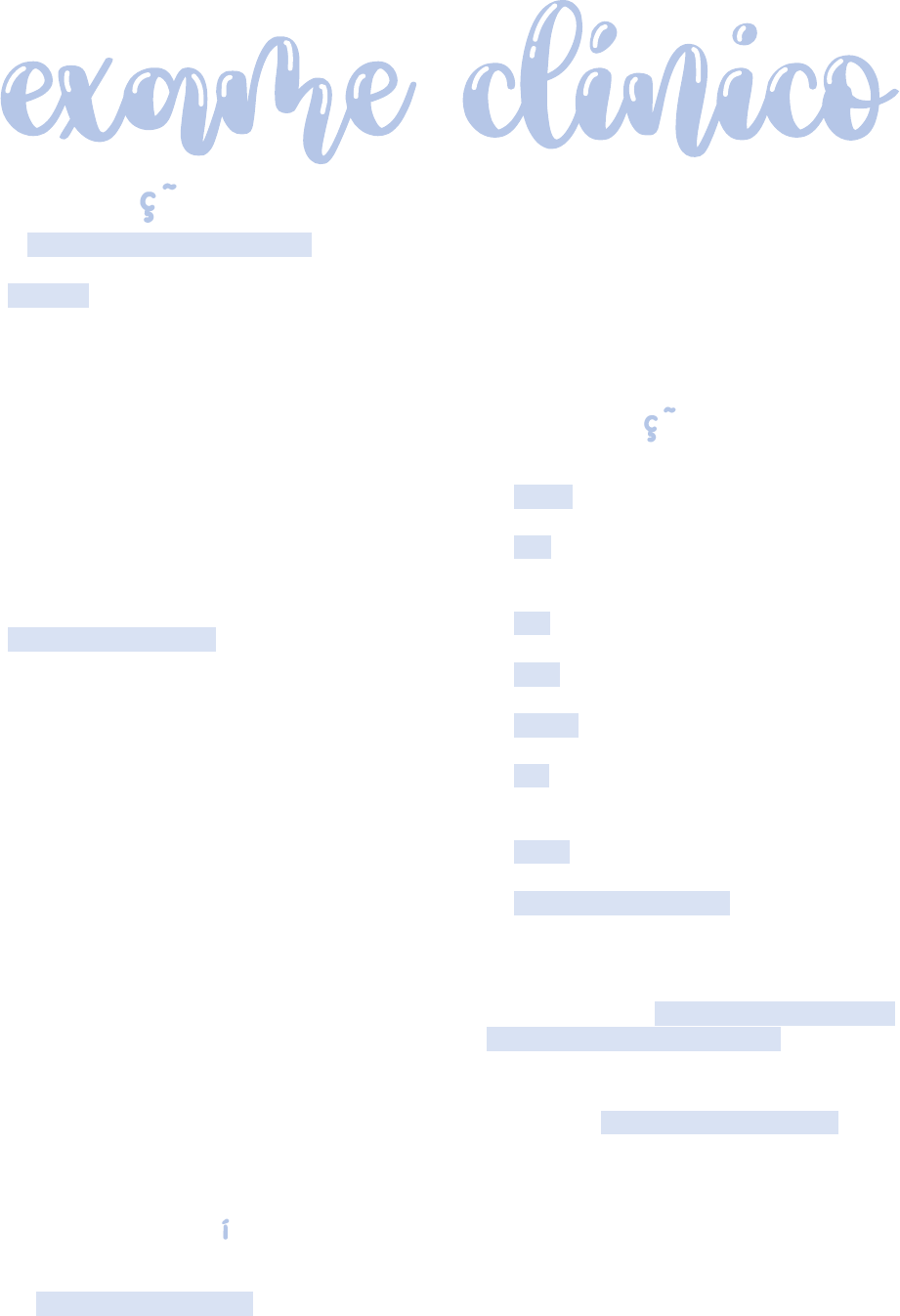 INTRODU ao O exame físico vem de antes de cristo (200 A..C). O responsável por dar uma base para semiologia foi Hipócrates e ele que mostrou a importância da: ò Inspeção; ò Palpação; ò Auscultação; “Ao exame, deve-se ver, sentir e ouvir tudo que é possível... E aprender, que, o que não entra pelos sentidos, o faz pela inteligência” Para dominar a semiologia é necessário os 3 Ps: ò Paciência; ò Perseverança; ò Prática. O aporte sensorial não é congênito, dessa forma treinar com animais sadios é o ideal para identificar possíveis alterações. Exame clínico O exame clínico é dividido em: ò Identificação do animal; ò Anamnese; ò Exame físico: geral (atitude, comportamento, nutrição, hidratação, parâmetros) e específico (sistemas envolvidos); ò Exames complementares; ò Diagnóstico; ò Prognóstico; ò Tratamento. A base do atendimento clínico consiste na anamnese e no exame físico bem-feito (85% do diagnostico). ò Anamnese: 50%; ò Exame físico: 35%; ò Exames complementares 15%. -Materiais bas cos Os materiais básicos necessários são: ò Material para contenção (corda, cabresto, fármacos); ò Papel e caneta (relatório de atendimento); ò Estetoscópio; ò Termômetro; ò Martelo e plexímetro; ò Luvas; ò Lanterna; ò Frascos para amostras; -identifica ão do animal Na identificação do animal (resenha) temos: ò Espécie: algumas enfermidades são mais comuns em determinadas espécies; ò Raça: raças mais puras são mais predispostas a desenvolverem doenças, enquanto os SRD possuem uma maior rusticidade; ò Sexo: existem enfermidades que acometem somente indivíduos de um mesmo sexo; ò Idade: diversas doenças acometem com maior frequência determinadas faixas etárias; ò Pelagem: animais de pelagem clara são mais susceptíveis a doenças; ò Peso: importante para o cálculo de medicamentos e para avaliar se o animal está acima ou abaixo do peso; ò Origem: algumas enfermidades são mais comuns em algumas regiões; ò Informações do proprietário. -Anamnese A anamnese é o principal recurso para obter informação para guiar o exame físico. Quando ela é bem feita, auxilia na identificação do sistema comprometido. Muitas vezes o informante pode ser falho. Desta forma, o tipo de informante influencia na anamnese, pois as vezes não é ele que passa a maior parte do tempo com o animal. Muitas vezes o proprietário mente ou omite informações; O que deve ser feito e o que não deve ser feito durante a anamnese: ò Não é um processo passivo: devemos tentar obter o máximo de informações possíveis; ò Não colocar o entrevistador em situação delicada; ò Não usar terminologia médica; ò Pergunte Quando? Como? Onde?; ò Obtenha os verdadeiros fatos. -Fonte e confiabilidade Anotar na ficha de exame o entrevistado (proprietário, tratador, filho, vizinho, etc). A confiabilidade da entrevista deve ser checada confortando as informações obtidas com as fornecidas pelo verdadeiro proprietário. -queixa principal Qual a manifestação imediata apresentada pelo animal (o que levou o proprietário a procurar o atendimento). A queixa principal não representa o distúrbio principal e pode ou não ter relação com o quadro atual do animal. Pode-se repetir expressões utilizadas pelo entrevistador. -Histórico da doença atual São alterações recentes na saúde do animal que levaram a procurar o veterinário. É importante seguir uma cronologia, deve-se sempre responder: ò O que? ò Quando? ò Como? ò Gradativo ou súbito? ò Sazonal? ò Mudou a alimentação? ò Foi medicado? (Qual medicamento? Resultado do medicamento?). -Comportamento dos órgãos A sequência recomendada é: ò 1. Sistema digestório; ò 2. Sistema cardiorrespiratório; ò 3. Sistema geniturinário; ò 4. Sistema nervoso; ò 5. Sistema locomotor; ò 6. Pele e anexos. -Hist ria m dica progressa Constitui a avaliação geral da saúde do animal, antes da ocorrência ou da manifestação da doença atual: ò Estado geral de saúde; ò Doenças prévias; ò Cirurgias anteriores; ò Imunizações; ò Vermifugações. -Hist ria ambiental e de manejo Tipo de solo e vegetação, topografia do local. Onde o animal passa a maior parte do dia, condições de higiene do local, produtos utilizados na limpeza, onde o animal come, disponibilidade de cochos, origem e disponibilidade da água. -Anamnese familiar ou rebanho Fornece informações sobre a saúde de todos os animais pertencentes àquela família ou rebanho, vivos ou mortos. Deve-se perguntar: ò Sobre a saúde atual dos animas; ò Se tem outro animal doente; ò Se algum animal morreu e a causa; ò Aspectos genéticos e hereditários; ò Histórico de doença dos familiares; ò Cruzamento entre familiares; ò Se entrou algum animal novo no rebanho; ò Se houve mudança na alimentação. -Exame f sico geral Para a realização do exame físico geral e específico, requer treinamento. -inspe ão Tem início antes da anamnese e deve-se realiza-lo em local iluminado. Investiga-se: ò Superfície corporal; ò Partes acessíveis das cavidades em contato com o exterior; O ideal é observar os animais com seus pares. Inicialmente observa-se a distância, pois anormalidades de postura e de comportamento são facilmente perceptíveis. Sempre fazer o comparativo do animal doente com os sadios. Não deve-se realizar a contenção antes de terminar a inspeção, pois a manipulação pode alterar o comportamento e mascarar alguma alteração. Os principais dados obtidos são: ò Nível de consciência (reação a estímulos): ausente (coma), normal (alerta), diminuído (apático), aumentado (excitado); ò Postura e locomoção: normal ou anormal. Observar o animal em repouso e, em seguida, em movimento; ò Escore de condição corporal: gado de leite 1-5, gado de corte e equino 1-9; ò Estado dos pelos e pele: pelos limpos, brilhantes ou eriçados, presença de ectoparasitas; ò Silhueta abdominal: normal, anorma