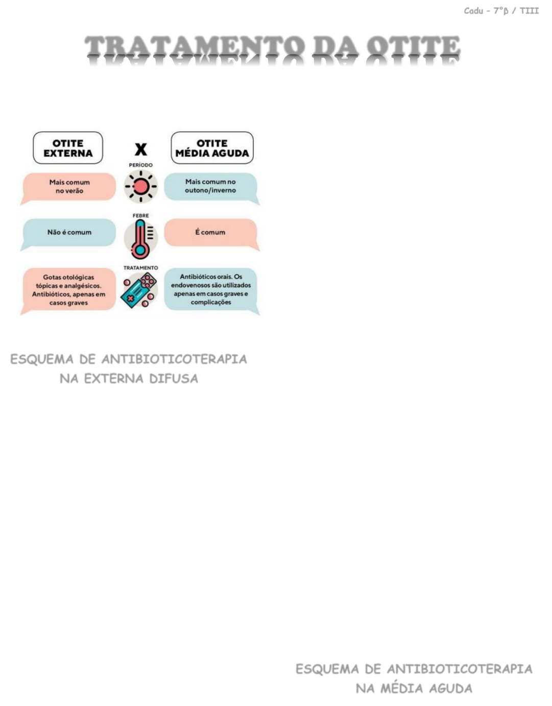 Cadu – 7°β / TIII • Analgesia e AI orais. ESQUEMA DE ANTIBIOTICOTERAPIA NA EXTERNA DIFUSA INDICAÇÕES • < 6 meses. • > 6 meses com doença grave. - Otalgia moderada – intensa > 48h ou Tax ≥ 39°C. • Bilateral. • Otorreia. • Complicações. TÓPICA • Gotas otológicas - Quinolonas. - Polimixinas. - Aminoglicosídeos. • Infecção no conduto auditivo externo, sem extensão para áreas vizinhas e sem complicações. • Associação com corticoide tópico para alívio da dor. • Limpeza prévia do conduto audito externo. - ESQUEMA PREFERENCIAL • Ciprofloxacino 0,2% + hidrocordisona 0,1% - 3 gotas na orelha afetada, 12 / 12h, 7 – 10 dias. - ESQUEMA ALTERNATIVO • Neomicina + polimixina B + hidrocortisona - 3 gotas na orelha afetada, 8 / 8h, 7 – 10 dias. ORAL - Quinolonas. • Quadro intenso e / ou complicado. - INDICAÇÕES • Falha do tratamento tópico. • Infecção também fora do conduto auditivo externo. • Impossibilidade de tratamento tópico. • Imunodepressão. - ESQUEMA • Ciprofloxacino - 500 – 750mg, 12 / 12h, 6 – 8 dias. ESQUEMA DE ANTIBIOTICOTERAPIA NA MÉDIA AGUDA 1ª ESCOLHA • Amoxicilina - 500mg, VO, 8 / 8h, 7 – 14 dias. - 875mg, VO, 12 / 12h, 7 – 14 dias. TRATAMENTO DA OTITE Cadu – 7°β / TIII • Amoxicilina + clavulanato - 500 / 125mg, VO, 8 / 8h, 7 – 14 dias. - 875 / 125mg, VO, 12 / 12h, 7 – 14 dias. ATERNATIVO • Cefuroxima - 250 – 500mg, VO, 12 / 12h, 7 – 14 dias. • Clindamicina - 300mg, VO, 6 / 6h ou 8 / 8h, 7 – 10 dias. SE ALERGIA A β – LACTÂMICO • Claritromicina - 500mg, VO, 1x / dia, 7 – 14 dias. • Doxiciclina - 100mg, VO, 12 / 12h, 7 – 14 dias. • Moxifloxacino - 400mg, VO, 1x / dia, 5 – 7 dias. • Levofloxacino - 500mg, VO, 1x / dia, 5 – 7 dias. - 750mg, VO, 1x / dia, 5 – 7 dias. • Sulfametoxazol + trimetropim - 800 / 160mg, VO, 12 / 12h, 5 – 7 dias. MANEJO