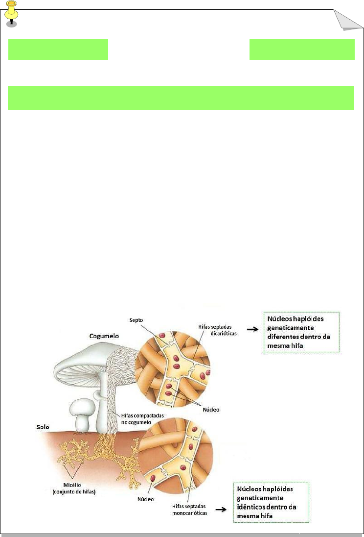 Fungos Características gerais •Seres eucariontes e heterótrofos, microscópicos ou macroscópicos, pluricelulares (formam filamentos chamados de hifas) ou unicelulares (leveduras). •Eucariontes. •Heterótrofos. •Apresentam parede celular formada por Quitina. •Apresentam uma reserva energética, o glicogênio. Micélio Hifas Podem ser: •Septadas: existe uma separação entre as células. •Cenocítica: não existe uma separação entre as células. Conjunto de hifas, apresenta o corpo de frutificação, local onde o fungo forma os esporos. Micélio vegetativo: É responsável pela absorção de nutrientes, cresce e penetra no substrato para se degradar para cumprir sua função. Tem um metabolismo alto. Suas hifas são muito capazes de absorver osmotroficamente substâncias dissolvidas no ambiente. Micélio reprodutivo: Esse micélio cresce em direção à superfície externa do meio e é responsável pela formação das estruturas reprodutivas (endosporitos). Tende a ser aéreo. Classificação •Ascomicetos: forma o corpo de frutificação chamado de Asco, formam os ascósporos (unicelulares e pluricelulares). •Basidiomicetos: formam bastonetes, dando origem aos basídios (conhecidos como cogumelos). •Deuteromicetos: fungos que não apresentam os processos de plasmogamia e cariogamia durante sua reprodução, formam os chamados conidiósporos. •Quitridiomicetos: fungos aquáticos, formam esporos flagelados. •Zigomicetos: fungos em grande parte terrestre, apresentam esporos sem flagelos. Reprodução •Após o contato de duas hifas haploides diferentes, ocorre a plasmogamia, que é a união da membrana plasmática das hifas em processo de reprodução gerando uma hifa dicariótica. •Origina-se a cariogamia (fusão dos dois núcleos) gerando um zigoto (2n) que crescendo se torna um esporo (n) formando uma nova hifa.