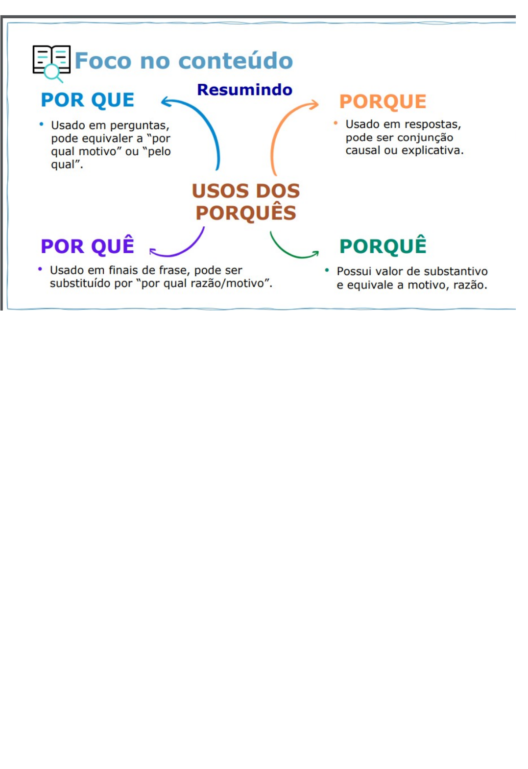 O uso dos porquês Quando usar porque? 1. Porque (junto e sem acento) é usado principalmente em respostas e em explicações. Indica a causa ou a explicação de alguma coisa. Porque pode ser substituído por: pois; visto que; uma vez que; por causa de que; dado que; Exemplos com porque: → Choro porque machuquei o pé. → Ela não foi à escola porque estava chovendo. Substituição do porque Choro pois machuquei o pé. Choro visto que machuquei o pé. Ela não foi à escola pois estava chovendo. Ela não foi à escola uma vez que estava chovendo. Porque é uma conjunção subordinativa causal ou explicativa, unindo duas orações que dependem uma da outra para ter sentido completo. Quando usar por que? Por que (separado e sem acento) pode ser usado para introduzir uma pergunta ou para estabelecer uma relação com um termo anterior da oração. Por que interrogativo Possuindo um caráter interrogativo, por que é usado para iniciar uma pergunta, podendo ser substituído por: por que motivo; por qual motivo; por que razão; por qual razão. Exemplos com por que (interrogativo) Por que você não foi dormir? Por que não posso sair com meus amigos? Substituição do por que (interrogativo) Por qual motivo você não foi dormir? Por qual razão você não foi dormir? Por qual motivo não posso sair com meus amigos? Por qual razão não posso sair com meus amigos? Com este uso, por que é formado pela preposição por seguida do pronome interrogativo que. Por que relativo Estabelecendo uma relação com um termo antecedente, por que é usado como elo de ligação entre duas orações, podendo ser substituído por: pelo qual; pela qual; pelos quais; pelas quais; por qual; por quais. Exemplos com por que (relativo) Não achei o caminho por que passei. As razões por que fui embora são pessoais. Substituição do por que (relativo) Não achei o caminho pelo qual passei. Não achei o caminho por qual passei. As razões pelas quais fui embora são pessoais. As razões por quais fui embora são pessoais. Com este uso, por que é formado pela preposição por seguida do pronome relativo que. Quando usar por quê? Por quê (separado e com acento) é usado em interrogações. Aparece sempre no final da frase, seguido de ponto de interrogação ou de um ponto final. Por quê pode ser substituído por: por qual motivo; por qual razão. Exemplos com por quê Você não comeu? Por quê? O menino foi embora e nem disse por quê. Substituição do por quê Você não comeu? Por qual motivo? Você não comeu? Por qual razão? O menino foi embora e nem disse por qual motivo. O menino foi embora e nem disse por qual razão. Por quê é formado pela preposição por seguida do pronome interrogativo tônico quê. Quando usar porquê? Porquê (junto e com acento) é usado para indicar o motivo, a causa ou a razão de algo. Aparece quase sempre junto de um artigo definido (o, os) ou indefinido (um, uns), podendo também aparecer junto de um pronome ou numeral. Porquê pode ser substituído por: o motivo; a causa; a razão. Exemplos com porquê Todos riam muito e ninguém me dizia o porquê. Gostaria de saber os porquês de ter sido mandada embora. Substituição do porquê Todos riam muito e ninguém me dizia o motivo. Todos riam muito e ninguém me dizia a razão. Gostaria de saber os motivos de ter sido mandada embora. Gostaria de saber as causas de ter sido mandada embora. Porquê é um substantivo masculino, podendo sofrer flexão em gênero: o porquê, os porquês. Dicas para o uso dos porquês Por que = Usado no início das perguntas. Por quê? = Usado no fim das perguntas. Porque = Usado nas respostas. O porquê = Usado como um substantivo. 1. Preencha os espaços, considerando o uso adequado dos termos: por que, por quê, porque e porquê. a. Queria saber por que eles discutiram. b. Você não lê jornais por quê? c. Por que o supermercado não abriu hoje? d. Eles não vieram à festa porque não foram convidados. e. Você sabe o porquê da briga? 2. Justifique o emprego dos termos em negrito. a. Por que será que ela não veio? Frase interrogativa direta b. Eu não posso contar porque preciso guardar segredo. Conjunção subordinada causal. Pode ser substituído por uma vez que. c. Queria saber o porquê do adiamento da prova de Inglês. Substantivo antecedido de artigo definido “o”, sinônimo de motivo.