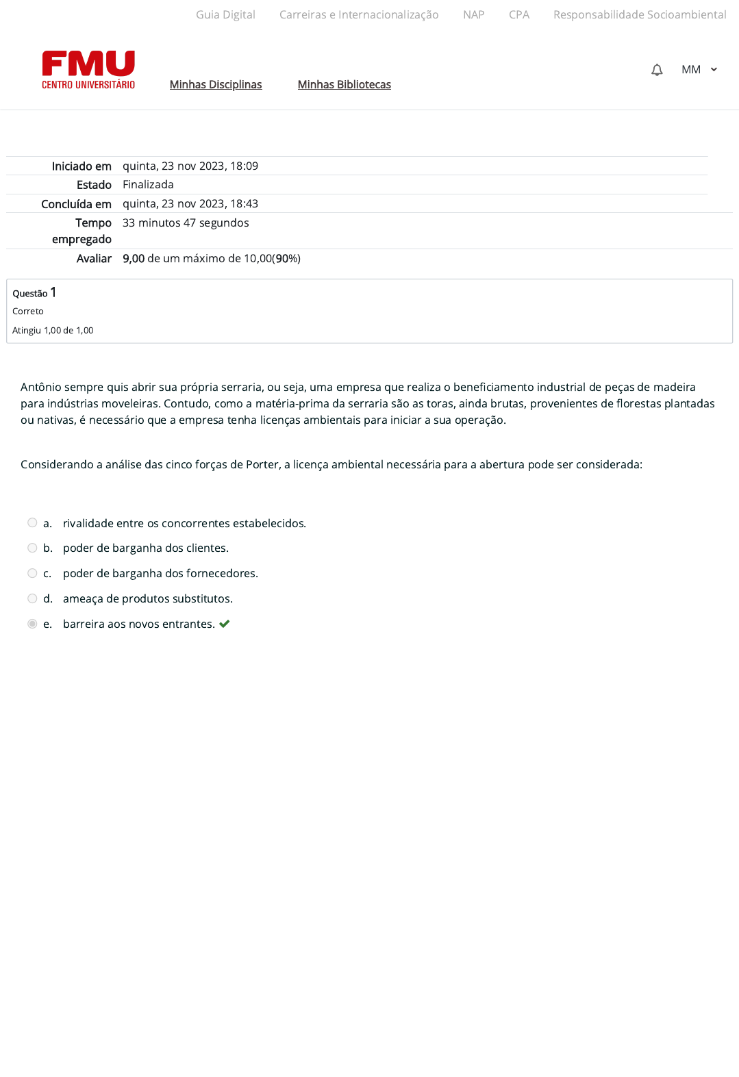 23/11/2023, 18:43 Atividade 3 (A3): Revisão da tentativa https://ambienteacademico.com.br/mod/quiz/review.php?attempt=3379009&cmid=1084770 1/7 Iniciado em quinta, 23 nov 2023, 18:09 Estado Finalizada Concluída em quinta, 23 nov 2023, 18:43 Tempo empregado 33 minutos 47 segundos Avaliar 9,00 de um máximo de 10,00(90%) Questão 1 Correto Atingiu 1,00 de 1,00 Antônio sempre quis abrir sua própria serraria, ou seja, uma empresa que realiza o bene�ciamento industrial de peças de madeira para indústrias moveleiras. Contudo, como a matéria-prima da serraria são as toras, ainda brutas, provenientes de �orestas plantadas ou nativas, é necessário que a empresa tenha licenças ambientais para iniciar a sua operação. Considerando a análise das cinco forças de Porter, a licença ambiental necessária para a abertura pode ser considerada: a. rivalidade entre os concorrentes estabelecidos. b. poder de barganha dos clientes. c. poder de barganha dos fornecedores. d. ameaça de produtos substitutos. e. barreira aos novos entrantes. Guia Digital Carreiras e Internacionalização NAP CPA Responsabilidade Socioambiental Minhas Disciplinas Minhas Bibliotecas MM https://codely-fmu-content.s3.amazonaws.com/Moodle/GuiaDigital/Guia+digital/index.html https://carreiras.fmu.br/ https://codely-fmu-content.s3.amazonaws.com/Moodle/NAP/inicial/nap/fmu/index.html https://codely-fmu-content.s3.amazonaws.com/Moodle/CPA/landing_CPA/index.html https://portal.fmu.br/sustentabilidade https://ambienteacademico.com.br/ https://ambienteacademico.com.br/ https://ambienteacademico.com.br/course/view.php?id=236 23/11/2023, 18:43 Atividade 3 (A3): Revisão da tentativa https://ambienteacademico.com.br/mod/quiz/review.php?attempt=3379009&cmid=1084770 2/7 Questão 2 Correto Atingiu 1,00 de 1,00 A ferramenta Análise das Cinco Forças Competitivas, criada por Michael Porter, é uma das mais conhecidas na literatura de gestão estratégica. Uma das forças dessa ferramenta é a Ameaça de novos entrantes. Para di�cultar essa entrada, podem existir barreiras aos novos entrantes. Em relação a essas barreiras, analise as a�rmativas a seguir. I. Mercados que exigem regulamentações rígidas dos governos, como requisitos legais e licenças, di�cultam a entrada de novos competidores, sendo um exemplo de barreira de entrada. II. A produção em larga escala é um exemplo de barreira aos novos entrantes, uma vez que o novo entrante terá di�culdade para produzir na mesma quantidade e com o mesmo valor das empresas já consolidadas no mercado. III. Um ramo que se caracteriza por uma operação complexa, demandando, do novo entrante, aprendizado de anos, como um restaurante de luxo, é um exemplo de barreira aos novos entrantes. IV. A necessidade de pouco capital é um exemplo de barreira aos novos entrantes, uma vez que, conforme a empresa cresce, ela poderá investir mais em seus produtos e serviços. Está correto o que se a�rma em: a. I, II, III e IV. b. I e IV, apenas. c. I, II e III. d. I e II, apenas. e. II e IV, apenas. Guia Digital Carreiras e Internacionalização NAP CPA Responsabilidade Socioambiental Minhas Disciplinas Minhas Bibliotecas MM https://codely-fmu-content.s3.amazonaws.com/Moodle/GuiaDigital/Guia+digital/index.html https://carreiras.fmu.br/ https://codely-fmu-content.s3.amazonaws.com/Moodle/NAP/inicial/nap/fmu/index.html https://codely-fmu-content.s3.amazonaws.com/Moodle/CPA/landing_CPA/index.html https://portal.fmu.br/sustentabilidade https://ambienteacademico.com.br/ https://ambienteacademico.com.br/ https://ambienteacademico.com.br/course/view.php?id=236 23/11/2023, 18:43 Atividade 3 (A3): Revisão da tentativa https://ambienteacademico.com.br/mod/quiz/review.php?attempt=3379009&cmid=1084770 3/7 Questão 3 Correto Atingiu 1,00 de 1,00 Um dos fatores que contribuem para delimitar o poder de barganha dos clientes ou compradores é o grau de concentração dos clientes, que se refere à quantidade de clientes dispostos a comprar da empresa. A partir do apresentado, analise as asserções a seguir e a relação proposta entre elas. I. Quanto maior a quantidade de clientes no mercado dispostos a comprar da empresa, maior poder de barganha os clientes terão. POIS II. Quanto mais clientes no mercado dispostos a comprar da empresa, maior chance os clientes terão de conseguir descontos e melhores preços, ou seja, uma melhor negociação com a empresa. A seguir, assinale a alternativa correta: a. A asserção I é uma proposição verdadeira, e a asserção II é uma proposição falsa. b. As asserções I e II são proposições verdadeiras, e a II é uma justi�cativa correta da I. c. As asserções I e II são proposições verdadeiras, mas a II não é uma justi�cativa correta da I. d. As asserções I e II são proposições falsas. e. A asserção I é uma proposição falsa, e a II é uma proposição verdadeira. Guia Digital Carreiras e Internacionalização NAP CPA Responsabilidade Socioambiental Minhas Disciplinas Minhas Bibliotecas MM https://codely-fmu-content.s3.amazonaws.com/Moodle/GuiaDigital/Guia+digital/index.html https://carreiras.fmu.br/ https://codely-fmu-content.s3.amazonaws.com/Moodle/NAP/inicial/nap/fmu/index.html https://codely-fmu-content.s3.amazonaws.com/Moodle/CPA/landing_CPA/index.html https://portal.fmu.br/sustentabilidade https://ambienteacademico.com.br/ https://ambienteacademico.com.br/ https://ambienteacademico.com.br/course/view.php?id=236 23/11/2023, 18:43 Atividade 3 (A3): Revisão da tentativa https://ambienteacademico.com.br/mod/quiz/review.php?attempt=3379009&cmid=1084770 4/7 Questão 4 Correto Atingiu 1,00 de 1,00 O poder de barganha dos fornecedores é inversamente proporcional à competitividade da empresa no mercado. Assim, temos: Maior poder de barganha do fornecedor > Menor vantagem competitiva da empresa. Menor poder de barganha do fornecedor > Maior vantagem competitiva da empresa. ROCHA, M. Marketing estratégico. São Paulo: Saraiva, 2015. A p