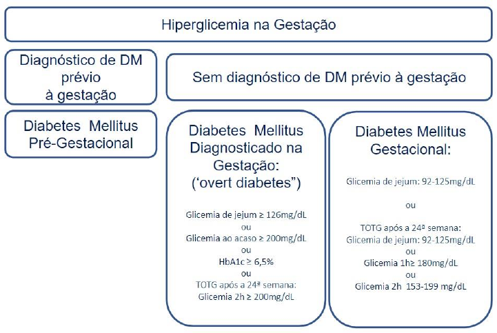 DIABETES MELLITUS GESTACIONAL (DMG) DMG: diabetes diagnosticado na gestação e origina-se da falta de reserva pancreática funcional para atender às demandas fisiológicas da gestação. Há dois tipos de hiperglicemia que podem ser identificadas na gestação: ➢ Diabete mellitus diagnosticado na gestação (DMDG) e ➢ Diabete mellitus gestacional (DMG). Diabetes Mellitus Gestacional (DMG): mulher com hiperglicemia detectada pela primeira vez durante a gravidez, com níveis glicêmicos sanguíneos que não atingem os critérios diagnósticos para DM fora do período gestacional. • DMG: estado transitório de intolerância aos carboidratos que se inicia no período gestacional, com gravidade variável, e que não preenche os critérios de DM franco Diabetes Mellitus diagnosticado na gestação (Overt Diabetes): mulher sem diagnóstico prévio de DM, com hiperglicemia detectada na gravidez e com níveis glicêmicos sanguíneos que atingem os critérios para a DM na ausência de gestação • DM franco: mulheres sem diagnóstico prévio de DM que evoluem com hiperglicemia em níveis que preenchem critérios para o diagnóstico de DM fora da gestação. Epidemiologia • A hiperglicemia é a complicação mais comum durante a gestação. • 18% das mulheres grávidas, assistidas no SUS, atinjam os critérios diagnósticos de DMG. Fisiopatologia A gestação é estado resistência à insulina • Essa condição, aliada à intensa mudança nos mecanismos de controle da glicemia, em função do consumo de glicose pelo embrião e feto, pode contribuir para ocorrência de alterações glicêmicas favorecendo o desenvolvimento de DM • Alguns hormônios produzidos pela placenta e outros aumentados pela gestação, tais como lactogênio placentário, cortisol e prolactina, podem promover redução da atuação da insulina em seus receptores e, consequentemente, um aumento da produção de insulina nas gestantes saudáveis. • Esse mecanismo, entretanto, pode não ser observado em gestantes que já estejam com sua capacidade de produção de insulina no limite. Essas mulheres têm insuficiente aumento de produção de insulina e, assim, podem desenvolver diabetes durante a gestação Fatores de risco No sexo feminino, o antecedente obstétrico de DMG é o principal fator de risco para o desenvolvimento de DM2 e síndrome metabólica ao longo da vida. Complicações O risco mais comumente associado ao DMG não tratado é o crescimento fetal excessivo • A macrossomia fetal ocorre porque a glicose, que cruza a placenta por mecanismo de difusão facilitada, passa em maior quantidade ao feto. • Como consequência, o feto desenvolve hiperglicemia e por ter um pâncreas normal desenvolve hiperinsulinemia. • Esta associação hiperglicemia-hiperinsulinemia estimula o crescimento fetal e a glicose em excesso é armazenada como gordura no feto causando a macrossomia, aumento da deposição de gordura no tórax-abdome, com consequente maior risco de distocia de ombro, que aumenta os riscos de tocotraumatismos e de intervenções cesarianas. • A hiperinsulinemia fetal parece também ser o fator etiológico do atraso na produção do surfactante pulmonar que leva ao aumento do desconforto respiratório As complicações neonatais mais graves são a síndrome do desconforto respiratório, a hipoglicemia e a hiperbilirrubinemia DIAGNÓSTICO A hiperglicemia na gestação deve ser investigada no início e na metade dela • Fatores clínicos de risco: A utilização de fatores clínicos de risco como forma de rastrear gestantes que devem ser submetidas a testes diagnósticos para DMG não é ideal, pois apresenta baixa sensibilidade. • Diagnóstico universal: deve-se proporcionar a todas as gestantes a possibilidade de diagnóstico de DMG. • Viabilidade financeira e disponibilidade técnica do teste proposto: o método diagnóstico a ser utilizado deve ser o melhor possível dentro da capacidade da região. • Teste com melhor sensibilidade/especificidade: TOTG As hemácias da gestante estão sob maior turnover, portanto a HbA1c não é um exame que participa formalmente do rastreio do DM na gestação. Cenários diagnósticos: • Diagnóstico de DMG em situação de viabilidade financeira e disponibilidade técnica TOTAL. • Diagnóstico de DMG em situação de viabilidade financeira e disponibilidade técnica PARCIAL. Situação de viabilidade financeira e disponibilidade técnica total Quando a situação financeira e a logística em torno da gestante não impuserem limitações diagnósticas, devemos realizar uma glicemia de jejum (GJ) até a 20ª semana de gestação. A partir da GJ, pode-se observar três desfechos: • GJ ≥ 126 mg/dL = DM prévio diagnosticado na gestação. • GJ 92 – 125 mg/dL = DMG. • GJ < 92 mg/dL = realização do TOTG com 75 g de glicose entre a 24ª e a 28ª semana de gravidez. Se o pré-natal for iniciado tardiamente, devemos observar a semana gestacional atual para definir a conduta diagnóstica: • Pré-natal iniciado entre a 20ª e a 28ª semana TOTG entre a 24ª e a 28ª semana. • Pré-natal iniciado após a 28ª semana TOTG o mais brevemente possível Consoante o valor do TOTG, as pacientes serão classificadas em três categorias: DM prévio diagnosticado na gestação. ✓ Jejum ≥ 126 mg/dL; ou ✓ Glicemia da 2ª hora ≥ 200 mg/dL. DMG ✓ Jejum 92 – 125 mg/dL; ou ✓ Glicemia da 1ª hora ≥ 180 mg/dL; ou ✓ Glicemia da 2ª hora 153 – 199 mg/dL. TOTG normal (níveis glicêmicos inferiores aos limiares diagnósticos de DMG). Situação de viabilidade financeira e disponibilidade técnica parcial Quando houver limitações logísticas ou financeiras à realização do TOTG, devemos realizar a GJ tão logo o acompanhamento pré-natal seja iniciado. ➢ GJ ≥ 126 mg/dL: DM prévio diagnosticado na gestação; ➢ GJ 92 e 125 mg/dL: DMG ➢ GJ < 92 mg/dL: repetir a GJ entre a 24ª e a 28ª semana para a conclusão do processo de rastre