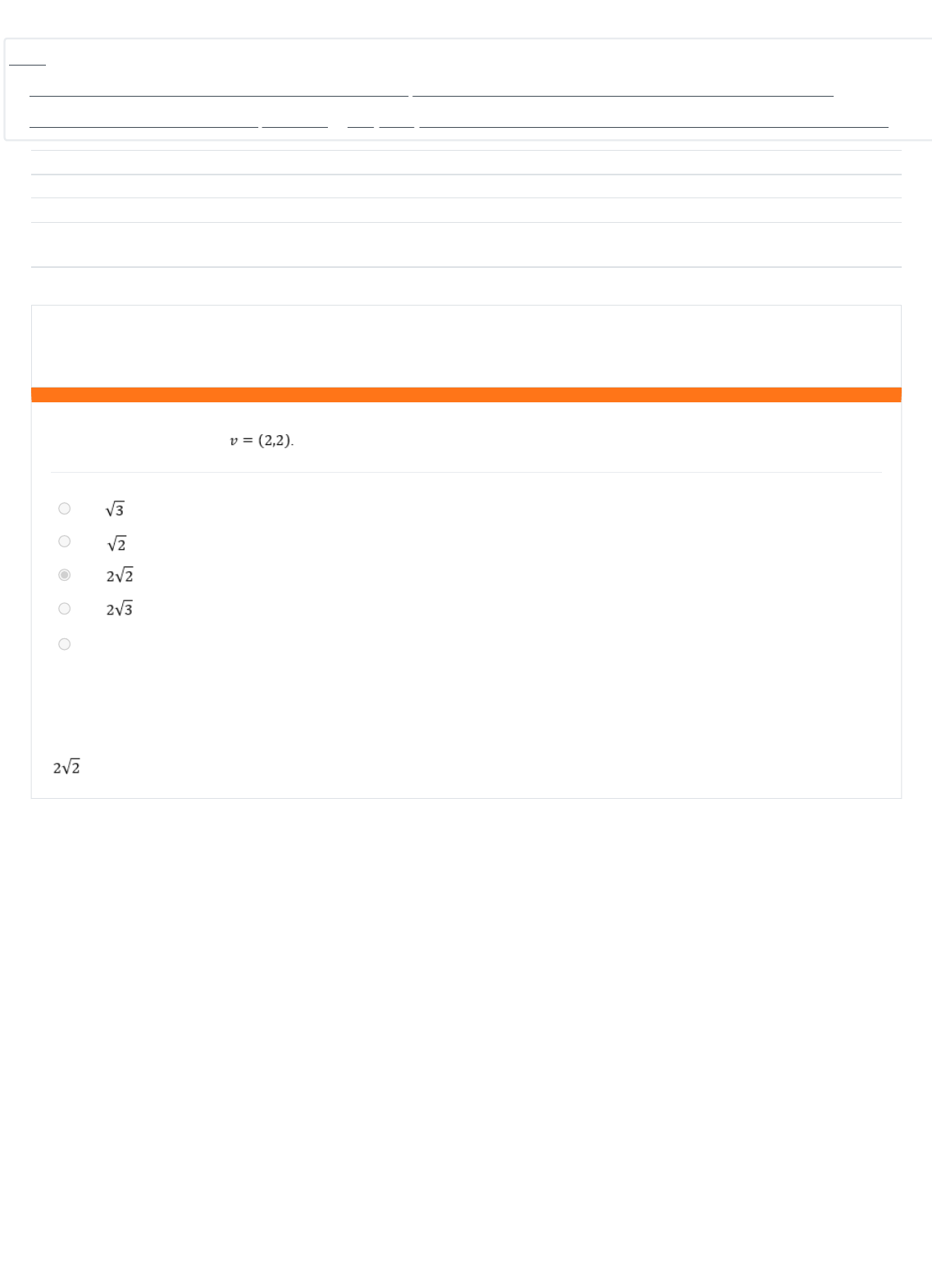 Iniciado em sábado, 6 mai 2023, 16:39 Estado Finalizada Concluída em sábado, 6 mai 2023, 17:41 Tempo empregado 1 hora 2 minutos Avaliar 0,50 de um máximo de 0,50(100%) Questão 1 Correto Atingiu 0,05 de 0,05 Determine a norma do vetor a. b. c. d. e. 2 Sua resposta está correta. A resposta correta é: Painel / Minhas Disciplinas / BACHARELADO EM ENGENHARIA DE CONTROLE E AUTOMAÇÃO - 2123 - GEOMETRIA ANALÍTICA E ÁLGEBRA LINEAR E VETORIAL / ATIVIDADE DE ESTUDO 01 - VALOR 0,5 PONTOS / CLIQUE AQUI PARA REALIZAR A ATIVIDADE DE ESTUDO 01 - PRAZO FINAL: 14/05/2023 https://www.eadunifatecie.com.br/course/view.php?id=15617 https://www.eadunifatecie.com.br/my/ https://www.eadunifatecie.com.br/course/view.php?id=15617 https://www.eadunifatecie.com.br/course/view.php?id=15617#section-5 https://www.eadunifatecie.com.br/mod/quiz/view.php?id=498672 Questão 2 Correto Atingiu 0,05 de 0,05 Questão 3 Correto Atingiu 0,05 de 0,05 a. b. c. d. e. Sua resposta está correta. A resposta correta é: a. b. c. d. e. Sua resposta está correta. A resposta correta é: Questão 4 Correto Atingiu 0,05 de 0,05 Questão 5 Correto Atingiu 0,05 de 0,05 a. b. c. d. e. Sua resposta está correta. A resposta correta é: a. y = -3 b. y = 1 c. y = 2 d. y = 3 e. y = -2 Sua resposta está correta. A resposta correta é: y = -3 Questão 6 Correto Atingiu 0,05 de 0,05 Questão 7 Correto Atingiu 0,05 de 0,05 Encontre a equação da parábola que tem foco em (-3,0) e a diretriz x = 5 . a. b. c. d. e. Sua resposta está correta. A resposta correta é: a. b. c. d. e. Sua resposta está correta. A resposta correta é: Questão 8 Correto Atingiu 0,05 de 0,05 Questão 9 Correto Atingiu 0,05 de 0,05 Utilizando a fórmula da distância entre dois pontos, , determine a distância entre os pontos a. 12 b. 14 c. 10 d. 9 e. 21 Sua resposta está correta. A resposta correta é: 9 Em relação a representação geométrica de plano cartesiano R , o que podemos afirmar? a. Identifica-se geometricamente um plano cartesiano, com dois círculos b. Identifica-se geometricamente um plano cartesiano, com duas retas orientadas, uma na vertical e outra na horizontal c. Identifica-se geometricamente um plano cartesiano, com três retas d. Identifica-se geometricamente um plano cartesiano, com duas retas paralelas e. Identifica-se geometricamente um plano cartesiano, com duas retas coincidentes 2 Sua resposta está correta. A resposta correta é: Identifica-se geometricamente um plano cartesiano, com duas retas orientadas, uma na vertical e outra na horizontal Questão 10 Correto Atingiu 0,05 de 0,05 Determine o ponto médio entre os pares ordenados a. b. c. d. e. Sua resposta está correta. A resposta correta é: ◄ ÁUDIO AULA 04 Seguir para... SLIDES AULA 05 ► https://www.eadunifatecie.com.br/mod/url/view.php?id=498671&forceview=1 https://www.eadunifatecie.com.br/mod/resource/view.php?id=498674&forceview=1