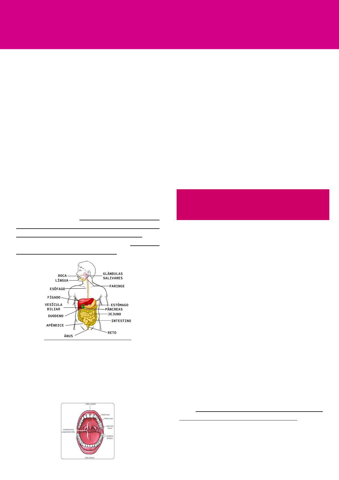 Estudo dirigido SISTEMA DIGESTÓRIO As funções do sistema digestório são de preensão, mastigação, transformação química, absorção dos alimentos e a expulsão dos resíduos (eliminado sob a forma de fezes). É reduzido a sua forma mais simples para ser absorvido A moti l idade do sistema digestório é denominada peristalse (movimento de ondas de contração por várias distâncias, pelo qual o canal alimentar e os demais tubos do sistema digestório propulsionam o seu conteúdo) DIVISÃO DO SISTEMA DIGESTÓRIO A grande divisão do sistema digestório compreende o canal alimentar (órgãos situados na cabeça, pescoço, no tórax, no abdome e na pelve) cavidade da boca, fauces, faringe, estômago, intestinos (delgado e grosso), e o reto, que se abre no ânus e os órgãos anexos que compreende as glândulas salivares, o fígado, e o pâncreas. CAVIDADE ORAL A cavidade oral compreende a cavidade oral, os dentes, a gengiva, a língua, o palato e a região das tonsilas palatinas. A cavidade oral é o local é onde o alimento é ingerido e preparado para digestão no estômago e no intestino delgado. Os dentes têm a função de triturar o alimento, que junto com a saliva proveniente das glândulas salivares, formará um bolo alimentar macio. A deglutição é iniciada voluntariamente na cavidade oral, onde o bolo alimentar é empurrado para a faringe através da atividade sincronizada da língua e do palato mole, onde ocorre a fase involuntária (automática da deglutição) A cavidade oral pode ser dividida em duas partes: o vestíbulo da boca e a cavidade da própria boca O vestíbulo da boca é o espaço semelhante a uma fenda entre os dentes e a gengiva e os lábios e as bochechas. Ele se comunica com o exterior através da rima (abertura) da boca. LIMITES DA CAVIDADE ORAL Anterior: Fissura oral Posterior: Fauce Superior: Arcada dentária do maxilar e palato Inferior: Arcada dentária da mandíbula, língua Lateral: bochechas LÁBIOS Os lábios são pregas musculofibrosas móveis que circundam a boca, estendendo-se dos sulcos nasolabiais e narinas lateral e superiormente até o sulco mentolabial. Usados para apreender o alimento, sugar líquidos, manter o alimento fora do vestíbulo da boca, produzir a fala e a osculação (beijo) Anatomia CAVIDADE ORAL Talia Cristine Músculo: m. orbicular da boca Artérias: labial superior e inferior (ramo das artérias faciais, que anastomosam entre si nos lábios para formar um anel arterial) O lábio superior é irrigado por ramos labiais superiores das artérias facial e infraorbital. O lábio inferior é vascularizado por ramos labiais inferiores das artérias facial e mentual. Nervos: O lábio superior é suprido pelos ramos labia is super iores dos nervos infraorbitais (do NC V2) e o lábio inferior é suprido pelos ramos labiais inferiores dos nervos mentuais (do NC V3) Linfonodos: A linfa do lábio superior e das partes laterais do lábio inferior segue para os linfonodos submandibulares, e a parte medial do lábio inferior segue para os linfonodos submentuais. Frênulos dos lábios São pregas de margem livre da túnica mucosa na linha mediana, que se estendem da gengiva vestibular até a túnica mucosa dos lábios superior e inferior (o que se estende até o lábio superior é maior) BOCHECAS Paredes móveis da cavidade oral. A face externa das bochechas constitui a região bucal, limitada anteriormente: região oral e mentual, superiormente: região zigomática, posteriormente: região parotideomassetérica, inferiormente: margem inferior da mandíbula. Proeminência da bochecha: junção das regiões zigomática e bucal. Contorno da parte superolateral da face: osso zigomático subjacente á proeminência e o arco zigomático. Músculo: mm. bucinadores Artérias: ramos bucais da artéria maxilar Nervo: ramos bucais do nervo mandibular GENGIVA São formadas por tecido fibroso coberto por túnica mucosa, está firmemente presa aos processos alveolares da mandíbula e da maxila e aos colos dos dentes. Gengiva adjacentes a língua: gengiva lingual superior e inferior Gengiva adjacente aos lábios e bochechas: gengivas maxilar e mandibular (labial ou bucal) DENTES Sua principal função é cortar, reduzir e misturar o alimento a saliva, ajuda a própria sustentação nos alvéolos dentais, auxilia o desenvolvimento e proteção dos tecidos que o sustentam, participa da articulação. Os dentes estão inseridos nos alvéolos dentais (processos alveolares da maxila e parte alveolar da mandíbula), ele identificado como decíduo (primário) ou permanente (secundário), os dentes em desenvolvimento situam-se nos arcos alveolares como brotos dentais Características dos dentes: incisivos (margens cortantes finas), caninos (cones p r o e m i n e n t e s ú n i c o s ) p r é - m o l a r e s (bicúspides) e molares (três ou mais cúspides) As raízes dos dentes são unidas ao osso do alvéolo pela articulação fibrosa sindesmose dentoalveolar ou gonfose Artérias: artérias alveolares superior e inferior, ramos da artéria maxilar (suprem os dentes maxilares e mandibulares) Veias: Veias alveolares (acompanham as artérias) Linfonodos: linfonodos submandibulares Nervos: nervo alveolar superior (NC V2) e inferior (NC V3) dão origem aos plexos dentais que sup rem os den tes max i l a res e mandibulares PALATO Forma o teto curvo da boca e o assoalho das cavidades nasais. Separa a cavidade oral da cavidade nasal. A face superior (nasal) é coberto por túnica mucosa respiratório e a face inferior (oral) é coberta por túnica mucosa oral, densamente povoada por glândulas. Tem duas regiões: palato duro e palato mole PALATO DURO É um espaço côncavo (espaço ocupado principalmente pela língua quando está em repouso). Dois terços anteriores Ossos que formam o palato duro Processo palatino da maxila e lâminas horizontais do osso palatino A fossa incisiva é uma depressão na linha mediana do palato ósseo posterior aos dentes incisivos 