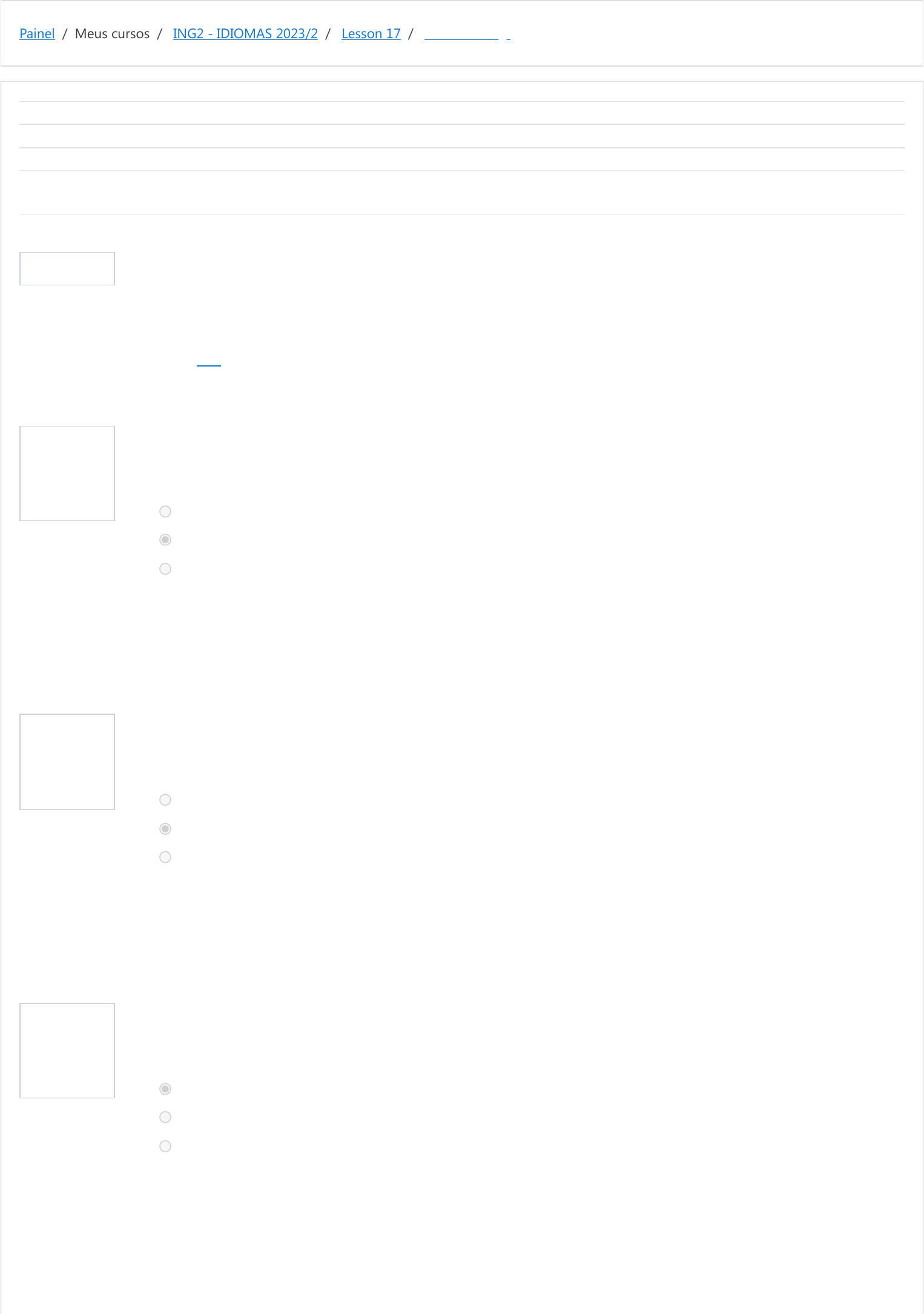 Painel / Meus cursos / ING2 - IDIOMAS 2023/2 / Lesson 17 / Just Checking! Informação Questão 1 Correto Atingiu 2,50 de 2,50 Questão 2 Correto Atingiu 2,50 de 2,50 Questão 3 Correto Atingiu 2,50 de 2,50 Iniciado em domingo, 3 dez 2023, 17:32 Estado Finalizada Concluída em domingo, 3 dez 2023, 17:33 Tempo empregado 1 minuto 9 segundos Avaliar 10,00 de um máximo de 10,00(100%) In this lesson you could read a discussion between Sarah and Carlton when Amelie's motorbike broke down. Check the option that best describes what you have studied. According to Sarah's opinion she believes... Escolha uma opção: ... Carton should try to fix the motorbike. ... Carton is unable to fix the motorbike. ... Carton is able to fix the motorbike. Sua resposta está correta. A resposta correta é: ... Carton is unable to fix the motorbike. After being aware of Sarah's opinion Carlton... Escolha uma opção: ... wants to check if she trusts him. ... wants to check if she is impatient. ... wants to check if she is ok with the situation. Sua resposta está correta. A resposta correta é: ... wants to check if she is impatient. According to the third line in the dialogue, Sarah is... Escolha uma opção: ... asking Carlton about his experiences with motorbikes. ... giving Carlton information about the motorbike. ... checking Carlton's ability to ride a motorbike. Sua resposta está correta. A resposta correta é: ... asking Carlton about his experiences with motorbikes. https://moodle.ifsul.edu.br/novohamburgo/my/ https://moodle.ifsul.edu.br/novohamburgo/course/view.php?id=357 https://moodle.ifsul.edu.br/novohamburgo/course/view.php?id=357#section-26 https://moodle.ifsul.edu.br/novohamburgo/mod/quiz/view.php?id=56953 https://moodle.ifsul.edu.br/novohamburgo/mod/url/view.php?id=56844 Questão 4 Correto Atingiu 2,50 de 2,50 When Carlton says: "Chill out, Sarah. I know I can do it." He sounds... Escolha uma opção: ... confident. ... rude. ... confused. Sua resposta está correta. A resposta correta é: ... confident. ◄ Checking and asking for information (apostila) Seguir para... Fitting Tag-Question ► https://moodle.ifsul.edu.br/novohamburgo/mod/resource/view.php?id=56951&forceview=1 https://moodle.ifsul.edu.br/novohamburgo/mod/quiz/view.php?id=56954&forceview=1