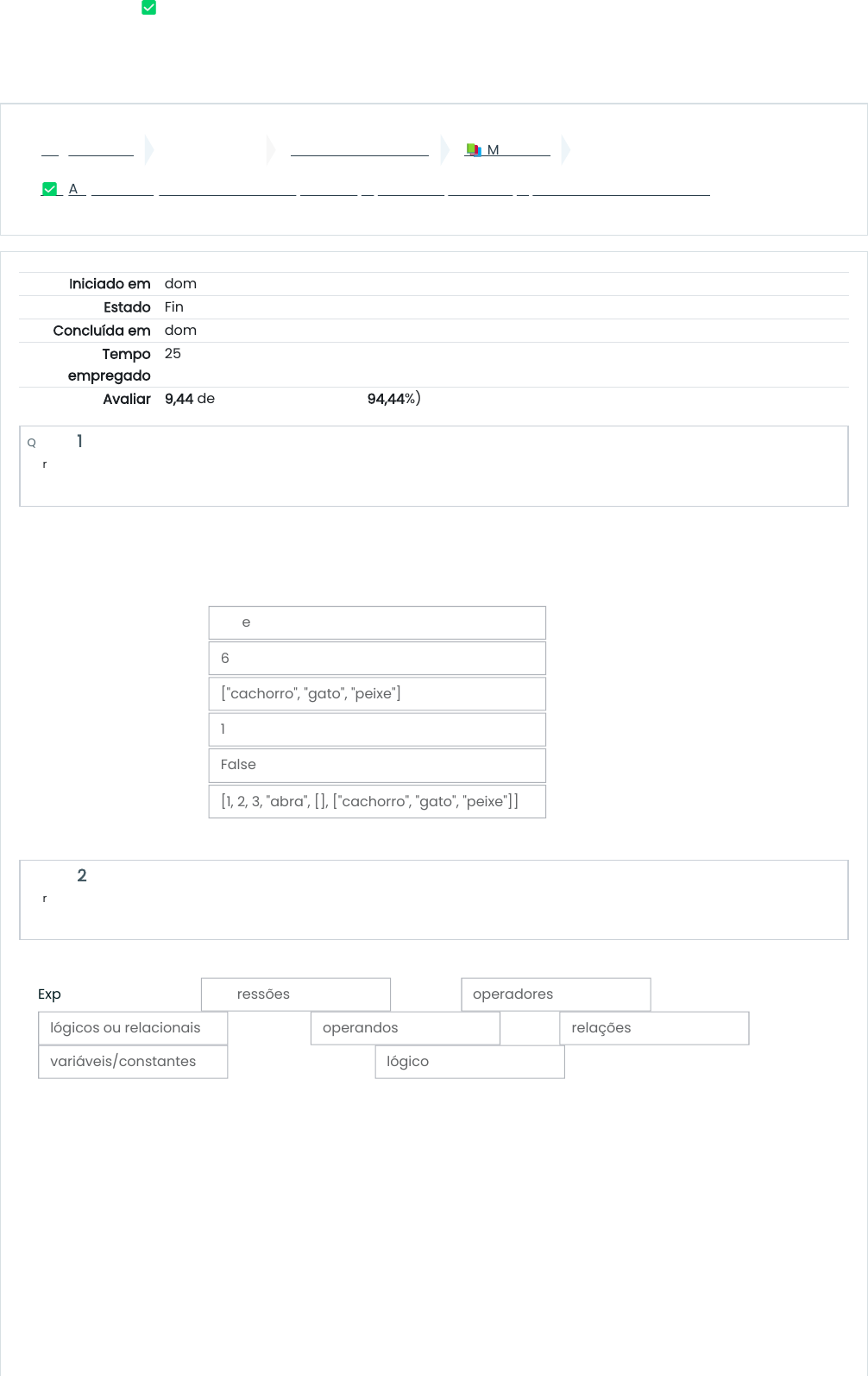 19/03/23, 19:22 ✅ [A2] – Avaliação do Módulo 2 – Expressões, operadores, variáveis, tipos e estruturas de dados: Revisão da tentativa https://ava.ufms.br/mod/quiz/review.php?attempt=564614&cmid=570005 1/4 Página inicial Meus cursos 32010001808-2023-1 📚 Módulo 2 ✅ [A2] – Avaliação do Módulo 2 – Expressões, operadores, variáveis, tipos e estruturas de dados Iniciado em domingo, 19 mar 2023, 17:56 Estado Finalizada Concluída em domingo, 19 mar 2023, 18:22 Tempo empregado 25 minutos 39 segundos Avaliar 9,44 de um máximo de 10,00(94,44%) Questão 1 Correto Atingiu 1,00 de 1,00 Questão 2 Correto Atingiu 1,00 de 1,00 Relacione as operações à esquerda, feitas com a lista minhalista = [1, 2, 3, "abra", [], ["cachorro", "gato", "peixe"]] com os seus respectivos resultados, à direita, de acordo com o significado dos operadores utilizados. "abra" in minhalista len(minhalista) minhalista[-1] minhalista[0] "cachorro" in minhalista minhalista * 1 True 6 ["cachorro", "gato", "peixe"] 1 False [1, 2, 3, "abra", [], ["cachorro", "gato", "peixe"]] Expressões lógicas são cujos são do tipo e cujos são ou também do tipo . expressões operadores lógicos ou relacionais operandos relações variáveis/constantes lógico https://ava.ufms.br/ https://ava.ufms.br/course/view.php?id=44467 https://ava.ufms.br/course/view.php?id=44467#section-3 https://ava.ufms.br/mod/quiz/view.php?id=570005 19/03/23, 19:22 ✅ [A2] – Avaliação do Módulo 2 – Expressões, operadores, variáveis, tipos e estruturas de dados: Revisão da tentativa https://ava.ufms.br/mod/quiz/review.php?attempt=564614&cmid=570005 2/4 Questão 3 Correto Atingiu 1,00 de 1,00 Questão 4 Correto Atingiu 1,00 de 1,00 Questão 5 Correto Atingiu 1,00 de 1,00 Questão 6 Correto Atingiu 1,00 de 1,00 Sobre as variáveis do tipo string em Python, é correto afirmar que: Escolha uma ou mais: a. Dada uma string, é possível verificar se ela possui um dado caractere usando o operador in. b. São usadas para manipular números c. Uma string pode incluir espaços em branco, pontuação e símbolos diferentes d. Dadas duas strings, é possível concatená-las usando o operador * e. Uma string é criada como uma sequência de caracteres envolvida por aspas Relacione as atribuições com os seus respectivos tipos conforme a definição de listas, tuplas e matrizes. oquesou1 = [1, 2, 3, 4, 5, 6] oquesou3 = (1, 2, 3, 4, 5, 6) oquesou2 = [[1, 2], [3, 4], [5, 6]] lista com seis elementos tupla com seis elementos matriz com 3 linhas e duas colunas Dada a matriz M = [[1, 2, 3], [4, 5, 6], [7, 8, 9]] definida em Python, é correto afirmar que: Escolha uma ou mais: a. O valor de M[0][0] = 0 b. O valor de M[0][0] = 1 c. A posição [3][3] é uma posição inválida da matriz M d. A matriz M possui 3 linhas e 3 colunas e. A matriz M possui 1 linha e 3 colunas Em Python, uma lista é uma sequência de objetos, de diferentes tipos, separados por ponto e vírgula e envoltos por colchetes. Escolha uma opção: Verdadeiro Falso 19/03/23, 19:22 ✅ [A2] – Avaliação do Módulo 2 – Expressões, operadores, variáveis, tipos e estruturas de dados: Revisão da tentativa https://ava.ufms.br/mod/quiz/review.php?attempt=564614&cmid=570005 3/4 Questão 7 Correto Atingiu 1,00 de 1,00 Questão 8 Correto Atingiu 1,00 de 1,00 Questão 9 Correto Atingiu 1,00 de 1,00 Questão 10 Parcialmente correto Atingiu 0,44 de 1,00 O valor da expressão aritmética 343 // 3 executada pelo Python é: a. 9 b. 114,33 c. 115 d. 114 e. 10 O valor da expressão aritmética 2 - 4 * 7 / 3 + 8 - 9 + 0 quando resolvida pelo Python é um valor inteiro. Escolha uma opção: Verdadeiro Falso Relacione os símbolos com a operação aritmética que eles representam na linguagem Python. Multiplicação Divisão inteira Resto de uma divisão Divisão fracionária Soma Subtração * // % / + - 1 + 3 * 2 - 4 / 5 Ordene os itens a seguir de forma que o resultado da expressão aritmética resultante seja igual a 6.0 quando executada pelo Python. Atividade anterior 19/03/23, 19:22 ✅ [A2] – Avaliação do Módulo 2 – Expressões, operadores, variáveis, tipos e estruturas de dados: Revisão da tentativa https://ava.ufms.br/mod/quiz/review.php?attempt=564614&cmid=570005 4/4 ◄ 📍 [Checkout de Presença] Módulo 2 – Expressões, operadores, variáveis, tipos e estruturas de dados Seguir para... Próxima atividade ▶ [Videoaula] Apresentação do Módulo 3 ► Manter contato Suporte Técnico ao Usuário https://suporteagetic.ufms.br (67) 3345-7613 suporte.agead@ufms.br https://ava.ufms.br/mod/assign/view.php?id=570003&forceview=1 https://ava.ufms.br/mod/url/view.php?id=570006&forceview=1 https://suporteagetic.ufms.br/ tel:(67) 3345-7613 mailto:suporte.agead@ufms.br https://api.whatsapp.com/send?phone=556733457613