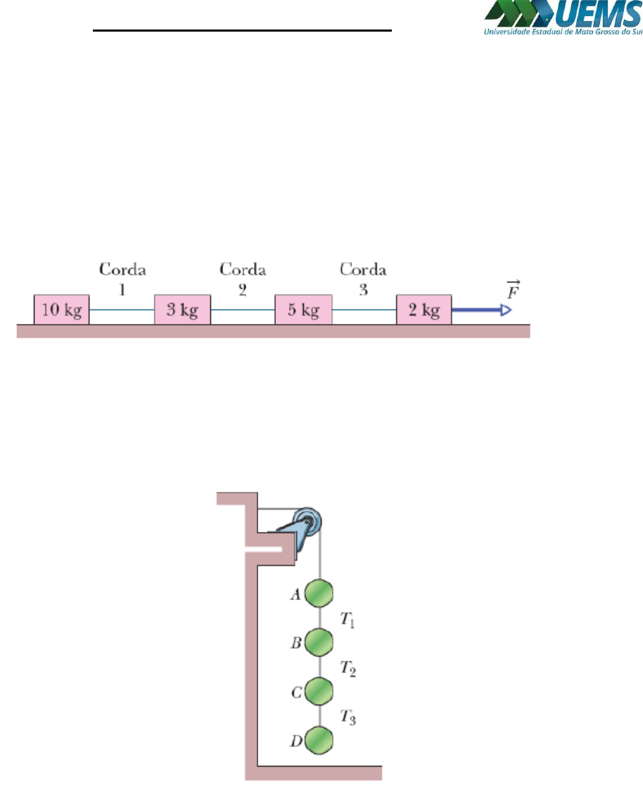 Física I – Prof. Thiago Lista 5: Leis de Newton (planos horizontais e inclinados) 1) A figura a seguir mostra um conjunto de quatro blocos sendo puxados por uma força F em um piso sem atrito. Determine a aceleração do sistema e as trações nos fios. 2) A figura mostra um arranjo no qual quatro discos estão suspensos por cordas. A mais comprida, no alto, passa por uma polia sem atrito e exerce uma força de 98 N sobre a parede à qual está presa. As trações nas cordas são: T1 = 60 N, T2 = 50 N, T3 = 10 N. Determine a massa de cada um dos discos. 3) Dois blocos A e B, de massas respectivamente iguais a 2 Kg e 3Kg, estão apoiados numa superfície horizontal perfeitamente lisa. Uma força horizontal de intensidade 10N é aplicada no bloco A. Determine a aceleração do conjunto e a intensidade da força que o corpo A aplica no corpo B. 4) Três corpos de massas Ma = 1Kg, Mb = 3Kg e Mc = 6Kg estão apoiados numa superfície horizontal perfeitamente lisa. A força horizontal F, de intensidade constante 5N, é aplicada ao primeiro bloco A. Determine: a) A aceleração do conjunto b) A intensidade da força que A exerce em B c) A intensidade da força que B exerce em C 5) Os corpos A e B da figura têm massas respectivamente iguais a Ma = 6 Kg e mB = 2Kg. O plano de apoio é perfeitamente liso e o fio é inextensível e de peso desprezível. Não há atrito entre o fio e a polia. Determine a aceleração do conjunto e a tração no fio. 6) Quatro blocos (M, N, O e P) deslizam sobre uma superfície horizontal, empurrados por uma força F, conforme esquema a seguir: A força de atrito entre os blocos é desprezível e a massa de cada bloco vale 3kg. Sabendo-se que a aceleração escalar dos blocos vale 2m/s2, qual a força do bloco M sobre o bloco N? 7) Na figura a seguir, a massa do bloco é 9 Kg e o ângulo com o eixo horizontal é 30°. Determine a tração na corda, a força normal que age sobre o bloco e a aceleração do bloco se a corda for cortada. 8) A figura a seguir mostra um corpo de massa m1 = 2Kg apoiado em um plano inclinado e amarrado a uma corda, que passa por uma roldana e sustenta outro corpo (m2), de massa 3kg. Se este corpo m2 move-se para baixo com uma aceleração de 4m/s2, determine a tração na corda. 9) Um corpo de massa m desliza em um plano inclinado perfeitamente liso, que forma um ângulo θ com o eixo horizontal. Considere a aceleração da gravidade como g. Expresse a aceleração deste corpo em função das grandezas citadas quando: a) Ele é solto do alto da rampa. b) Ele é lançado da parte inferior para a parte superior com uma velocidade v0. 10) No arranjo experimental da figura, os corpos A e B tem massas iguais a 10 Kg. O plano inclinado é perfeitamente liso. O fio é inextensível e passa sem atrito pela polia de massa desprezível. Determine a aceleração do sistema e a tração no fio. 11) Sejam a1 e a3 os módulos das acelerações dos blocos de massas M1 e M3 respectivamente. Encontre a relação entre a1 e a3, sabendo que M1 = M3 = M2/2. Despreze todos os atritos. 12) Num local onde a aceleração gravitacional vale 10m/s2, dispõe-se o conjunto abaixo, no qual o atrito é desprezível, a polia e o fio são ideais. Nestas condições, determine a intensidade da força que o bloco A exerce no bloco B.