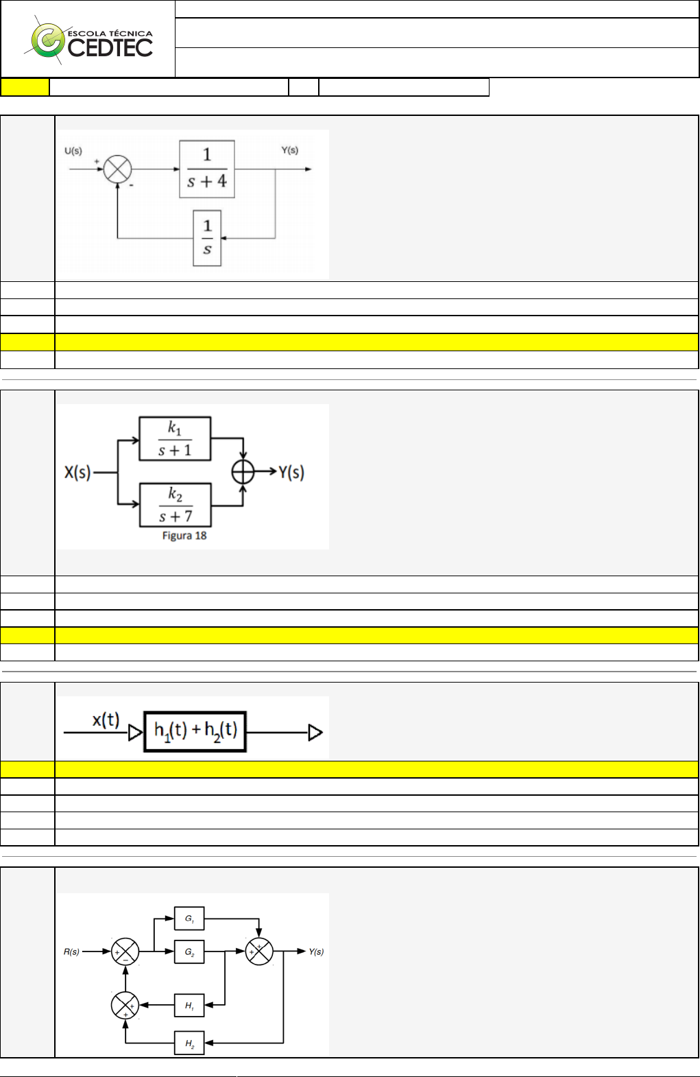 01/04/2023 17:54:32 1/2 REVISÃO DE SIMULADO Nome: ABNER ENDRYE PIMENTEL DE ALMEIDA Disciplina: Controle de Processos Respostas corretas são marcadas em amarelo X Respostas marcardas por você. Questão 001 A função de transferência equivalente ao diagrama de blocos apresentado ao lado encontra-se em: A) G(s)=1/(s+4). s B) G(s)=s/(s+4) C) G(s)=1/(s2+12s+1) X D) G(s)=s/(s2+4s+1) E) G(s)=1/(s2+12s+4) Questão 002 Observe a Figura Sabendo-se que a função de transferência equivalente é dada por: H(s)=(6s+18) /(s2+8s+7), é correto afirmar que as constantes k1 e k2 são, respectivamente: A) k1 = 7 e k2 = 2 B) k1 = 4 e k2 = 2 X C) k1 = 2 e k2 = 7 D) k1 = 2 e k2 = 4 E) k1 = 2 e k2 = 6 Questão 003 A figura abaixo apresenta um diagrama em blocos de um sistema linear invariante no tempo. X A) [h1(t) + h2(t)] *x(t) B) [h1(t) - h2(t)] *x(t) C) [h1(t)/h2(t)] *x(t) D) h1(t)*h2(t)*x(t) E) [h1(t) + h2(t)] /x(t) Questão 004 Assinale a alternativa que apresenta CORRETAMENTE a equação de função de transferência simplificada de um sistema linear representado através do diagrama de blocos mostrado na figura: 01/04/2023 17:54:32 2/2 A) Y(s) / R(s) = (G1 + G2) / (1 - H1.H2 +H2. (G1+G2)) X B) Y(s) / R(s) = (G1 + G2) / (1 + H1.G2 +H2. (G1+G2)) C) Y(s) / R(s) = 1 / (1 + H1.G1 +H2. (G1+G2)) D) Y(s) / R(s) = 1 / (1 + H1.G2 +H2. (G1+G2)) E) Y(s) / R(s) = (G1. G2) / (1 + H1.G2 +H2. (G1+G2))