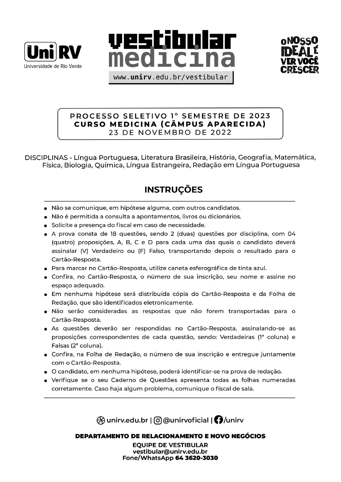 1 2 LÍNGUA PORTUGUESA Leia o texto abaixo e responda às questões 01 e 02. O espaço secreto A menininha vivia numa solidão imensa. Seus pais não permitiam que ela tivesse amigos. “Bastam os parentes”, diziam. As janelas da casa eram protegidas do exterior por persianas abaixadas que criavam um espaço interior de sombras. Pelas frestas das persianas, ela olhava o mundo luminoso que vivia lá fora. Sua casa não era sua casa. Não havia nela espaço para sua solidão. A solidão da criança é aquele mundo em que ela está protegida da vigilância adulta. Da minha infância tenho memórias felizes dos meus espaços solitários, espaços da minha liberdade. Há os grandes espaços solitários, a criança correndo livre, longe dos olhos adultos. Vejo-me soltando pipa... E há os pequenos espaços solitários, os espaços aconchegantes. As crianças gostam de fazer cabaninhas, sonham com uma casa no alto de uma árvore, onde os adultos não chegam. Pois essa menininha descobriu o seu espaço, espaço que era só dela, ninguém mais sabia, ninguém entrava nele: era um taco de assoalho solto no fim de um corredor. Quando ela levantava o taco, ele se transformava na caverna de Ali Babá, cheia de tesouros. Ali a menininha guardava pedrinhas coloridas. Não importava o valor das pedrinhas. Importava que elas eram o seu tesouro, as suas joias... Naquele espaço ninguém mais entrava. Só ela... Uma terapeuta contou-me de um paciente seu, um menino esquizofrênico. Ele tinha uma caixa onde guardava os seus tesouros. Numa sessão de terapia, ele e ela fizeram um jogo num papel. Ele achou o jogo maravilhoso. Guardou-o no seu cofre. Na sessão seguinte, ela lhe perguntou sobre o jogo. Ele respondeu: “Jogou fora” e não soube dar maiores explicações. Como ele só falava na terceira pessoa, ela entendeu o “Jogou fora” como “Joguei fora”. Conversando com a mãe do menino, ela perguntou: “O que o Joãozinho fez com o jogo que fizemos?”. Ela queria compreender as razões do comportamento do menino. A mãe não entendeu. A terapeuta explicou: “Ele havia guardado o jogo naquela caixa...”. “Ah!”, sorriu a mãe, “aquela caixa de tranqueiras bobas e sujas? Limpei a caixa. Joguei tudo fora...” Pobre mãe! Ela não sabia que havia jogado fora pedaços preciosos da alma do seu filho. Crianças na noite. Dez e meia da noite. Cruzamento da rua Benjamin Constant com a avenida Júlio de Mesquita. Duas crianças, um menino e uma menina. Entre sete e oito anos de idade. Vendiam balas de goma com olhos tristes. Minha vontade era levá-los para minha casa, servir-lhes uma sopa, tomar conta deles. Não fiz nada disso. O sinal ficou verde e acelerei o carro. Mas as duas crianças dormiram comigo, acordaram comigo e ainda estão comigo. ALVES, Rubem. Ostra feliz não faz pérola. Planeta. Edição do Kindle. QUESTÃO 1 Assinale V (verdadeiro) ou F (falso) para as alternativas de acordo com o texto: a) ( ) O autor aborda elementos do universo infantil em um texto que mistura memórias, narrativa e impressões pessoais. b) ( ) Os pais da menininha mencionada no início do texto, movidos por uma genuína preocupação com a solidão da filha, tentam protegê-la dos perigos externos. c) ( ) O autor afirma que a solidão das crianças é resultado de um desejo de fugir da vigilância dos adultos. d) ( ) O trecho “ela está protegida da vigilância adulta” tem o mesmo significado de “ela está protegida pela vigilância adulta”. 3 QUESTÃO 2 Assinale V (verdadeiro) ou F (falso) para as alternativas de acordo com o texto: a) ( ) O autor tem uma visão positiva dos espaços solitários das crianças, mas entende que os pequenos espaços solitários trazem riscos à segurança das crianças, pois são inalcançáveis para os adultos. b) ( ) O trecho “Vejo-me soltando pipa…” tem relação com os grandes espaços solitários e liberdade física. Já o termo “cabaninhas” correlaciona-se aos pequenos espaços solitários. c) ( ) O autor não critica a mãe do menino esquizofrênico por jogar fora “a caixa de tranqueiras”. Ele demonstra compaixão pela mulher por sua ignorância quanto ao universo emocional do próprio filho. d) ( ) No trecho “Mas as duas crianças dormiram comigo, acordaram comigo e ainda estão comigo”, a repetição do termo “comigo” revela a força do impacto que as crianças tiveram sobre o autor. LITERATURA QUESTÃO 3 A respeito de Memórias de um sargento de milícias, escrito por Manuel Antônio de Almeida, assinale V (verdadeiro) ou F (falso) para as alternativas. a) ( ) O termo “memórias”, presente no título do romance, indica que a história é narrada em primeira pessoa pelo protagonista Leonardo. b) ( ) O romance tem um narrador onisciente em terceira pessoa que tece comentários ao longo dos acontecimentos. c) ( ) O termo “memórias” no título faz referência ao passado e às histórias que se passaram com o protagonista da obra. d) ( ) O livro discorre sobre costumes sociais e culturais brasileiros da época de Dom João VI no Brasil, como se pode perceber por expressões como “no tempo do rei”, “daquele tempo” e “naqueles devotos tempos”. QUESTÃO 4 Sobre os personagens em Ciranda de Pedra, escrito por Lygia Fagundes Telles, assinale V (verdadeiro) ou F (falso) para as alternativas. a) ( ) Virgínia é filha biológica de Laura e Natércio. Após o divórcio dos pais, ela vai viver com a mãe e o padrasto, Daniel. b) ( ) Otávia é irmã de Virgínia. Com personalidade marcante, ela confronta o padrão romântico de relacionamento. c) ( ) Frau Herta é uma alemã que trabalha como governanta da casa de Natércio. Entre as três irmãs, ela nutre uma preferência por Virgínia, desde o nascimento da menina. d) ( ) Daniel é o homem por quem Laura abandona o casamento. Contudo, Daniel se torna responsável pela morte de Laura. 4 HISTÓRIA QUESTÃO 5 Dentre os conflitos no Brasil imperial, a Revolução Praieira, mov