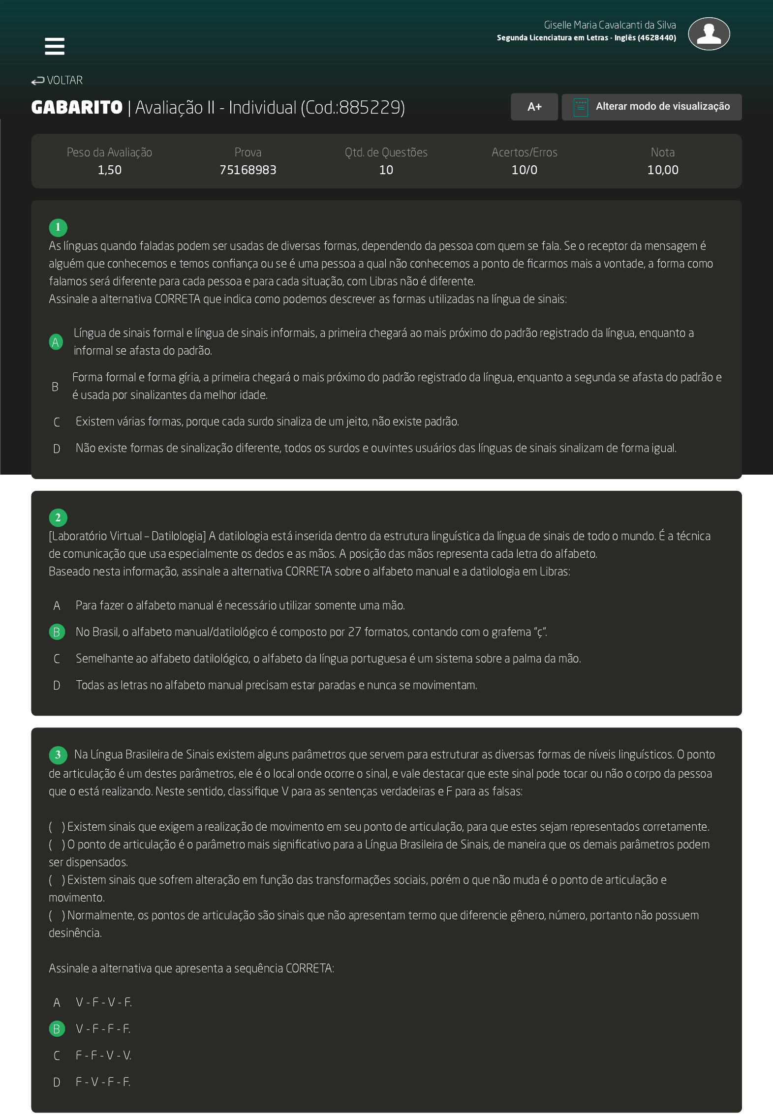 08/12/23, 15:45 AVA https://ava2.uniasselvi.com.br/subject/grades-and-tests/answer-book/eyJ0ZXN0Ijp7InRlc3RDb2RlIjoiODg1MjI5IiwiZGVzY3JpcHRpb24iOiJBdmFsaWHDp8OjbyBJSSAtIEluZGl2aWR1YWwiLCJwYXJhbWV0ZXIiOjU0… 1/4 GABARITO | Avaliação II - Individual (Cod.:885229) Peso da Avaliação 1,50 Prova 75168983 Qtd. de Questões 10 Acertos/Erros 10/0 Nota 10,00 As línguas quando faladas podem ser usadas de diversas formas, dependendo da pessoa com quem se fala. Se o receptor da mensagem é alguém que conhecemos e temos confiança ou se é uma pessoa a qual não conhecemos a ponto de ficarmos mais a vontade, a forma como falamos será diferente para cada pessoa e para cada situação, com Libras não é diferente. Assinale a alternativa CORRETA que indica como podemos descrever as formas utilizadas na língua de sinais: A Língua de sinais formal e língua de sinais informais, a primeira chegará ao mais próximo do padrão registrado da língua, enquanto a informal se afasta do padrão. B Forma formal e forma gíria, a primeira chegará o mais próximo do padrão registrado da língua, enquanto a segunda se afasta do padrão e é usada por sinalizantes da melhor idade. C Existem várias formas, porque cada surdo sinaliza de um jeito, não existe padrão. D Não existe formas de sinalização diferente, todos os surdos e ouvintes usuários das línguas de sinais sinalizam de forma igual. [Laboratório Virtual – Datilologia] A datilologia está inserida dentro da estrutura linguística da língua de sinais de todo o mundo. É a técnica de comunicação que usa especialmente os dedos e as mãos. A posição das mãos representa cada letra do alfabeto. Baseado nesta informação, assinale a alternativa CORRETA sobre o alfabeto manual e a datilologia em Libras: A Para fazer o alfabeto manual é necessário utilizar somente uma mão. B No Brasil, o alfabeto manual/datilológico é composto por 27 formatos, contando com o grafema “ç”. C Semelhante ao alfabeto datilológico, o alfabeto da língua portuguesa é um sistema sobre a palma da mão. D Todas as letras no alfabeto manual precisam estar paradas e nunca se movimentam. Na Língua Brasileira de Sinais existem alguns parâmetros que servem para estruturar as diversas formas de níveis linguísticos. O ponto de articulação é um destes parâmetros, ele é o local onde ocorre o sinal, e vale destacar que este sinal pode tocar ou não o corpo da pessoa que o está realizando. Neste sentido, classifique V para as sentenças verdadeiras e F para as falsas: ( ) Existem sinais que exigem a realização de movimento em seu ponto de articulação, para que estes sejam representados corretamente. ( ) O ponto de articulação é o parâmetro mais significativo para a Língua Brasileira de Sinais, de maneira que os demais parâmetros podem ser dispensados. ( ) Existem sinais que sofrem alteração em função das transformações sociais, porém o que não muda é o ponto de articulação e movimento. ( ) Normalmente, os pontos de articulação são sinais que não apresentam termo que diferencie gênero, número, portanto não possuem desinência. Assinale a alternativa que apresenta a sequência CORRETA: A V - F - V - F. B V - F - F - F. C F - F - V - V. D F - V - F - F. VOLTAR A+ Alterar modo de visualização 1 2 3 Giselle Maria Cavalcanti da Silva Segunda Licenciatura em Letras - Inglês (4628440) 08/12/23, 15:45 AVA https://ava2.uniasselvi.com.br/subject/grades-and-tests/answer-book/eyJ0ZXN0Ijp7InRlc3RDb2RlIjoiODg1MjI5IiwiZGVzY3JpcHRpb24iOiJBdmFsaWHDp8OjbyBJSSAtIEluZGl2aWR1YWwiLCJwYXJhbWV0ZXIiOjU0… 2/4 Assim como na Língua Portuguesa, temos palavras diferentes para nos referir ao mesmo objeto, chamadas de ambiguidade, que é a característica das expressões linguísticas que apresentam mais de um sentido/significado para aquela palavra. Normalmente quando isso acontece, precisa de um contexto para ser compreendida, isto é, possui ambiguidade. Estamos diante de um dos seguintes fenômenos: homonímia e polissemia. Sobre os sinais polissêmicos, assinale a alternativa CORRETA: A Ocorrem quando os sentidos da palavra ambígua não são relacionados, ou seja, os sinais que, embora apresentem parâmetros idênticos em Libras, não estabelecem qualquer tipo de relação semântica entre si. B Estão relacionados à ambiguidade semântica, possuem dois ou mais significados, de acordo com o contexto. C Vício de linguagem usando palavras sinônimas. D Como vimos no exemplo, em LIBRAS a palavra/sinal Bahia pode referir-se a uma pessoa, a uma loja, a um time de futebol ou à cidade, pois existe uma relação homônima entre o sinal/palavra Bahia (substantivo simples, próprio, primitivo) e o sinal/palavras Jeito/maneira da pessoa (substantivo e advérbio de modo). A língua existe como um código linguístico usado por uma sociedade, assim ela é totalmente social. Existem vários fatores que influenciam na maneira como falamos: idade, sexo, grau de escolaridade, profissão, onde moramos etc. As línguas de sinais estão dentro de todos esses contextos, pois os sinais foram surgindo de forma natural. Já a linguagem é aplicada não apenas nas línguas faladas, mas também em outras. Diante disso, assinale a alternativa CORRETA: A No caso dos ouvintes a audição é vista como um canal de extrema importância para a linguagem, por isso, pode-se dizer que a perda auditiva/surdez não interfere no processo de quando a criança surda vai adquirir sua linguagem. B Ocorre através de canais cognitivos, e no meio em que vivemos. C No sistema de linguagem, seja oral ou escrita. D Em todos os sistemas de comunicação, sejam eles artificiais ou naturais. Ela acontece através de canais sensoriais, e no meio em que vivemos. A datilologia entra no aspecto fonológico na Libras e tem sido resultado de pesquisas de ouvintes no sentido de ensinar o surdo a falar. A maior parte das comunidades surdas de todo o mundo a utilizam em suas respectivas Línguas de Sin