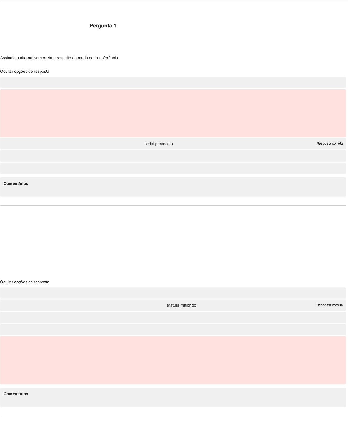 Conteúdo do exercício Ocultar opções de resposta Comentários Ocultar opções de resposta Comentários Pergunta 1 Assinale a alternativa correta a respeito do modo de transferência de calor: radiação. A absorção ocorre quando a radiação incide um determinado material e esse material provoca o redirecionamento do raio para fora da superfície. Incorreta: A reflexão acontece quando a radiação interage com o sólido que entrou em contato, implicando num aumento de energia interna. Resposta corretaA reflexão ocorre quando a radiação incide um determinado material e esse material provoca o redirecionamento do raio para fora da superfície. A transmissão acontece quando a radiação interage com o sólido que entrou em contato, implicando num aumento de energia interna. A absorção é um processo que refere à radiação atravessando o meio, assim como ocorre quando temos uma poça d’água no chão e observamos o sol atravessando essa poça. Resposta correta: A reflexão ocorre quando a radiação incide um determinado material e esse material provoca o redirecionamento do raio para fora da superfície. Pergunta 2 Assinale a alternativa correta com base em seu conhecimento do Ciclo de Ar-Padrão Brayton Os principais equipamentos que compõem o ciclo de ar-padrão de turbina a gás modelado de acordo as condições do ciclo de Brayton são: Compressor, trocador de calor e bomba. Resposta corretaNo o ciclo de ar-padrão, o ar que entrou no início irá retornar para a vizinhança com a temperatura maior do que a da vizinhança. O aumento de temperatura no ciclo acontece por combustão. No ciclo de ar-padrão, o ar entra na turbina a partir da vizinhança Incorreta: O aumento de temperatura no ciclo acontece por transferência de calor de uma fonte interna ao processo para o fluido de trabalho. Essa fonte pode ser o vaporizador, por exemplo. Resposta correta: No o ciclo de ar-padrão, o ar que entrou no início irá retornar para a vizinhança com a temperatura maior do que a da vizinhança. Ocultar opções de resposta Comentários Ocultar opções de resposta Comentários Pergunta 3 Assinale a alternativa correta a respeito do modo de transferência de calor: condução. Resposta correta A condução pode ser vista como a transferência de energia das partículas mais energéticas para as menos energéticas de uma substância devido às interações entre partículas. A taxa do qual o calor é transferido por condução, qk, é inversamente proporcional ao gradiente de temperatura dT/dx vezes a área A, por meio da qual o calor é transferido. Incorreta: Podemos citar, como exemplo de condução, a transferência de calor que acontece nos raios solares até chegar ao nosso Planeta Terra. Sempre que houver um gradiente de temperatura em meio sólido, o calor irá fluir da região que apresentar menor temperatura para a região de maior temperatura A taxa real de fluxo de calor irá depender de uma propriedade física do meio chamada de viscosidade. Resposta correta: A condução pode ser vista como a transferência de energia das partículas mais energéticas para as menos energéticas de uma substância devido às interações entre partículas. Pergunta 4 Determine a densidade, a gravidade específica e a massa de ar numa sala cujas dimensões são: (1 x 3 x 6) m, a 100 kPa e a 25 °C. Para o gás do ar, considere R = 0,297 kPa.m³/(kg.K). Resposta corretaDensidade = 1,17 kg/m³ Gravidade Específica = 0,00117 e massa = 21,06 kg. Densidade = 1,17 kg/m³ Gravidade Específica = 0,117 e massa = 21,06 kg. Densidade = 11,70 kg/m³ Gravidade Específica = 0,00117 e massa = 2,106 kg. Densidade = 1,17 kg/m³ Gravidade Específica = 0,00117 kg/m³ e massa = 21,06 kg. Incorreta: Densidade = 21,06 kg/m³ Gravidade Específica = 0,00117 e massa = 1,17 kg. Resposta correta: Densidade = 1,17 kg/m³ Gravidade Específica = 0,00117 e massa = 21,06 kg. Pergunta 5 Ocultar opções de resposta Comentários Ocultar opções de resposta Observe que a figura abaixo representa um ciclo de Rankine e cada equipamento que compõe o ciclo recebeu uma numeração. Assinale a alternativa que relacione corretamente a numeração com o nome do equipamento em questão. 1: Condensador / 2: Turbina / 3: Condensador / 4: Bomba. 1: Caldeira / 2: Turbina / 3: Caldeira / 4: Bomba. Incorreta: 1: Turbina / 2: Condensador / 3: Bomba / 4: Caldeira. Resposta correta1: Caldeira / 2: Turbina / 3: Condensador / 4: Bomba. 1: Condensador / 2: Turbina / 3: Caldeira / 4: Bomba. Resposta correta: 1: Caldeira / 2: Turbina / 3: Condensador / 4: Bomba. Pergunta 6 O ar que entra no difusor mostrado na Figura abaixo, com velocidade de 200 m/s, determine a velocidade do som. Propriedades: A constante de gás do ar é R = 0,287 kJ/kg e sua razão de calor específico (k) a 30° é de 1,4. 349 m/s 34,9m/s 0,573 m/s Comentários Ocultar opções de resposta Comentários Ocultar opções de resposta 0,573 m/s² Resposta correta Correta: 349 m/s² 349 m/s Pergunta 7 Em um ciclo de Ar-Padrão Brayton, ao ignoramos a irreversibilidade associada à circulação do ar, ignorarmos as perdas de carga por atrito e considerando que o ar escoa à pressão constante por meio dos trocadores de calor, além de considerarmos que não existe perda de calor por meio da transferência de calor, tornando os processos da turbina e do compressor isentrópicos, teremos então um ciclo Ideal. Com base nas figuras a seguir e seu conhecimento do assunto, assinale a única alternativa verdadeira. A área do diagrama p-s pode ser interpretada como o calor produzido pelo sistema. No driagrama p-s a área 3-4-b-a-3 representa o trabalho que é transmitido ao compressor por unidade de massa. A área do diagrama T-s pode ser interpretada como o trabalho produzido pelo sistema. Resposta correta Correta: No diagrama T-s a área 2-3-a-b-2 nos fornece o calor adicionado por unidade de massa No diagrama p-s, a área 1-2-a-b-1 nos fornece o trabalho produzido pela 