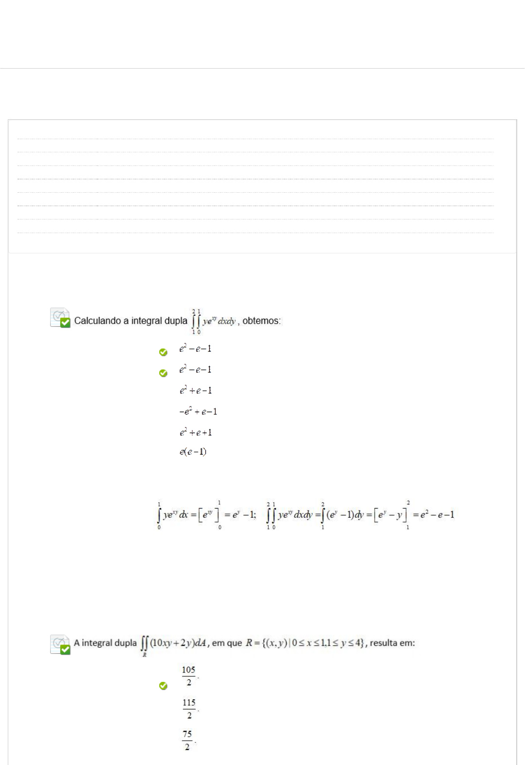 12/12/2023, 19:40 Revisar envio do teste: QUESTIONÁRIO UNIDADE II – ... https://ava.ead.unip.br/webapps/assessment/review/review.jsp?attempt_id=_101195625_1&course_id=_313956_1&content_id=_3681034_1&ret… 1/6 Revisar envio do teste: QUESTIONÁRIO UNIDADE II CÁLCULO DIFERENCIAL E INTEGRAL DE VÁRIAS VARIÁVEIS 7211-60_15402_D_20232 CONTEÚDO Usuário leandro.vieira16 @aluno.unip.br Curso CÁLCULO DIFERENCIAL E INTEGRAL DE VÁRIAS VARIÁVEIS Teste QUESTIONÁRIO UNIDADE II Iniciado 12/12/23 20:32 Enviado 12/12/23 20:39 Status Completada Resultado da tentativa 3 em 3 pontos Tempo decorrido 7 minutos Resultados exibidos Todas as respostas, Respostas enviadas, Respostas corretas, Comentários, Perguntas respondidas incorretamente Pergunta 1 Resposta Selecionada: a. Respostas: a. b. c. d. e. Comentário da resposta: . . . . . . Resposta: A Comentário: integramos primeiro em x, substituindo os limites para x, e a seguir integramos em y, substituindo os limites para y: Pergunta 2 Resposta Selecionada: c. Respostas: a. b. UNIP EAD BIBLIOTECAS MURAL DO ALUNO TUTORIAIS LABORATÓRIOSCONTEÚDOS ACADÊMICOS 0,3 em 0,3 pontos 0,3 em 0,3 pontos http://company.blackboard.com/ https://ava.ead.unip.br/webapps/blackboard/execute/courseMain?course_id=_313956_1 https://ava.ead.unip.br/webapps/blackboard/content/listContent.jsp?course_id=_313956_1&content_id=_3679967_1&mode=reset https://ava.ead.unip.br/webapps/portal/execute/tabs/tabAction?tab_tab_group_id=_10_1 https://ava.ead.unip.br/webapps/portal/execute/tabs/tabAction?tab_tab_group_id=_27_1 https://ava.ead.unip.br/webapps/portal/execute/tabs/tabAction?tab_tab_group_id=_47_1 https://ava.ead.unip.br/webapps/portal/execute/tabs/tabAction?tab_tab_group_id=_29_1 https://ava.ead.unip.br/webapps/portal/execute/tabs/tabAction?tab_tab_group_id=_64_1 https://ava.ead.unip.br/webapps/portal/execute/tabs/tabAction?tab_tab_group_id=_25_1 https://ava.ead.unip.br/webapps/login/?action=logout 12/12/2023, 19:40 Revisar envio do teste: QUESTIONÁRIO UNIDADE II – ... https://ava.ead.unip.br/webapps/assessment/review/review.jsp?attempt_id=_101195625_1&course_id=_313956_1&content_id=_3681034_1&ret… 2/6 c. d. e. Comentário da resposta: Resposta: C Comentário: fazemos , por exemplo, e procedemos à integração substituindo os limites apropriados: Pergunta 3 Resposta Selecionada: b. Respostas: a. b. c. d. e. Comentário da resposta: Resposta: B Comentário: integramos primeiro em y, de x2 a 1, e depois em x, de 0 a 1: Pergunta 4 0,3 em 0,3 pontos 0,3 em 0,3 pontos 12/12/2023, 19:40 Revisar envio do teste: QUESTIONÁRIO UNIDADE II – ... https://ava.ead.unip.br/webapps/assessment/review/review.jsp?attempt_id=_101195625_1&course_id=_313956_1&content_id=_3681034_1&ret… 3/6 Resposta Selecionada: c. Respostas: a. b. c. d. e. Comentário da resposta: Pergunta 5 Resposta Selecionada: c. Respostas: a. b. c. d. e. Comentário da resposta: 388,11. 377,43. 237,61. 388,11. 438,37. 359,14. Resposta: C Comentário: efetuamos a integral dupla da função z entre as curvas dadas: Pergunta 6 Resposta Selecionada: b. 32. 0,3 em 0,3 pontos 0,3 em 0,3 pontos 12/12/2023, 19:40 Revisar envio do teste: QUESTIONÁRIO UNIDADE II – ... https://ava.ead.unip.br/webapps/assessment/review/review.jsp?attempt_id=_101195625_1&course_id=_313956_1&content_id=_3681034_1&ret… 4/6 Respostas: a. b. c. d. e. Comentário da resposta: 16. 32. 36. 48. 60. Resposta: B Pergunta 7 Resposta Selecionada: a. Respostas: a. b. c. d. e. Comentário da resposta: Resposta: A Comentário: substituímos x, y e dydx por seus correspondentes em coordenadas polares: Pergunta 8 Resposta Selecionada: e. Respostas: a. 0,3 em 0,3 pontos 0,3 em 0,3 pontos 12/12/2023, 19:40 Revisar envio do teste: QUESTIONÁRIO UNIDADE II – ... https://ava.ead.unip.br/webapps/assessment/review/review.jsp?attempt_id=_101195625_1&course_id=_313956_1&content_id=_3681034_1&ret… 5/6 b. c. d. e. Comentário da resposta: Pergunta 9 Resposta Selecionada: e. Respostas: a. b. c. d. e. Comentário da resposta: Pergunta 10 Resposta Selecionada: c. Respostas: a. b. 0,3 em 0,3 pontos 0,3 em 0,3 pontos 12/12/2023, 19:40 Revisar envio do teste: QUESTIONÁRIO UNIDADE II – ... https://ava.ead.unip.br/webapps/assessment/review/review.jsp?attempt_id=_101195625_1&course_id=_313956_1&content_id=_3681034_1&ret… 6/6 Terça-feira, 12 de Dezembro de 2023 20h39min17s GMT-03:00 c. d. e. Comentário da resposta: ← OK