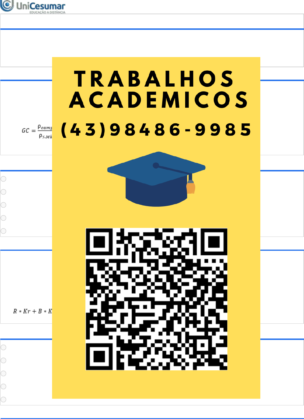 06/12/2023, 16:22 Unicesumar - Ensino a Distância about:blank 1/3 ATIVIDADE 4 - ESTRADAS E RODOVIAS - 54/2023 Período:27/11/2023 08:00 a 15/12/2023 23:59 (Horário de Brasília) Status:ABERTO Nota máxima:0,50 Gabarito:Gabarito será liberado no dia 16/12/2023 00:00 (Horário de Brasília) Nota obtida: 1ª QUESTÃO Sabendo que o Grau de Compactação (GC) requerido em um determinado projeto de terraplenagem é de 95%, e que a densidade aparente seca máxima de um solo (ρ ) é de 2300 kg/m³, utilize a equação a seguir e determine qual deve ser a densidade mínima (ρ ) que o material deve atingir para o grau de compactação de 95%: ALTERNATIVAS 1325 kg/m³. 2185 kg/m³. 3194 kg/m³. 4205 kg/m³. 5822 kg/m³. 2ª QUESTÃO No dimensionamento de um pavimento asfáltico flexível, devemos encontrar a espessura de cada uma das camadas. Sabendo que o revestimento asfáltico (R) adotado tem espessura de 6 cm, o coeficiente estrutural do material no revestimento (Kr) é de 1,7, o coeficiente estrutural do material na base (Kb) é de 1,4 e que o valor de H20 relativo ao CBR de 20% é igual a 23 cm, calcule e assinale a alternativa correta que representa a espessura mínima da base (B), em centímetros, utilizando a inequação a seguir: ALTERNATIVAS 9,14 cm. 10,43 cm. 13,28 cm. 14,30 cm. 17,21 cm. 3ª QUESTÃO s.máx campo 06/12/2023, 16:22 Unicesumar - Ensino a Distância about:blank 2/3 Os pavimentos devem suportar os carregamentos do tráfego e resistir às solicitações, sem gerar deformações permanentes e sem alterar suas características projetuais, assim os usuários terão segurança e o veículo terá um custo operacional melhor. Com relação as funções dos pavimentos e com base no conhecimento adquirido durante as aulas, analise as afirmações a seguir: I. Gerar desconforto e segurança aos usuários. II. Resistir aos carregamentos verticais dos veículos e transmiti-los ao subleito. III. Resistir às cargas cinéticas horizontais sem ocorrer desagregação. IV. Resistir às ações climáticas, como mudança de temperatura e umidade. É correto o que se afirma em: ALTERNATIVAS I e III, apenas. I e IV, apenas. I, II e III, apenas. II, III e IV, apenas. I, II, III e IV. 4ª QUESTÃO Os materiais que podem ser utilizados para a execução das camadas de base e sub-base são diversos, eles precisam apresentar uma certa resistência e, em alguns casos, são desejadas características complementares. Esses tipos de processos são denominados de estabilizações. Com base no conteúdo adquirido em aula e no livro, assinale a alternativa que representa os principais tipos de estabilizações das camadas de base e sub-base: ALTERNATIVAS Estabilizações Solúvel, Granulométrica, Cimentícia ou Aditiva. Estabilizações Mecânicas, Granulométrica, Solvente ou Alcatrão. Estabilizações Mecânicas, Devolutiva, Cimentícia ou Betuminosa. Estabilizações Analógica, Compactada, Cimentícia ou Betuminosa. Estabilizações Mecânicas, Granulométricas, Cimentícia ou Betuminosa. 5ª QUESTÃO 06/12/2023, 16:22 Unicesumar - Ensino a Distância about:blank 3/3 As chamadas panelas são os buracos presentes na superfície do pavimento. Quando não são feitas as corretas manutenções, as panelas evoluem rapidamente, principalmente em épocas chuvosas, chegando a atingir as camadas inferiores do pavimento. É considerada como severidade baixa se tiver profundidade de até 2,5 cm, severidade média se tiver entre 2,5 e 5,0 cm, e severidade alta se a profundidade ultrapassar 5,0cm. BERBERT, A. C. Estradas e Rodovias. Maringá: Unicesumar, 2022. A árvore de decisão para panelas é responsável por definir a atividade de Manutenção e Reparo (M&R), conforme apresentado na Tabela 1. Tabela 1: Árvore de decisão para panelas Fonte: FERNANDES JR, J. L.; PANTIGOSO, J. F. G. Compatibilização da gerência de pavimentos urbanos com as concessionárias de serviços públicos com o uso de SIG. Rio de Janeiro: XI ANPET, 1998. Apud BERBERT, A. C. Estradas e Rodovias. Maringá: Unicesumar, 2022. Portanto, utilizando a árvore de decisão para panelas e sabendo que em um pavimento foi encontrado uma panela com profundidade de 4 cm, assinale a alternativa que representa corretamente a severidade da panela e sua respectiva atividade de Manutenção e Reparo (M&R). ALTERNATIVAS Severidade Média com atividade de Manutenção e Reparo de Remendo. Severidade Baixa com atividade de Manutenção e Reparo de Capilarização. Severidade Baixa com atividade de Manutenção e Reparo de Remendo e Drenagem. Severidade Alta com atividade de Manutenção e Reparo de Preenchimento do Buraco. Severidade Alta com atividade de Manutenção e Reparo de Revestimento Argamassado.