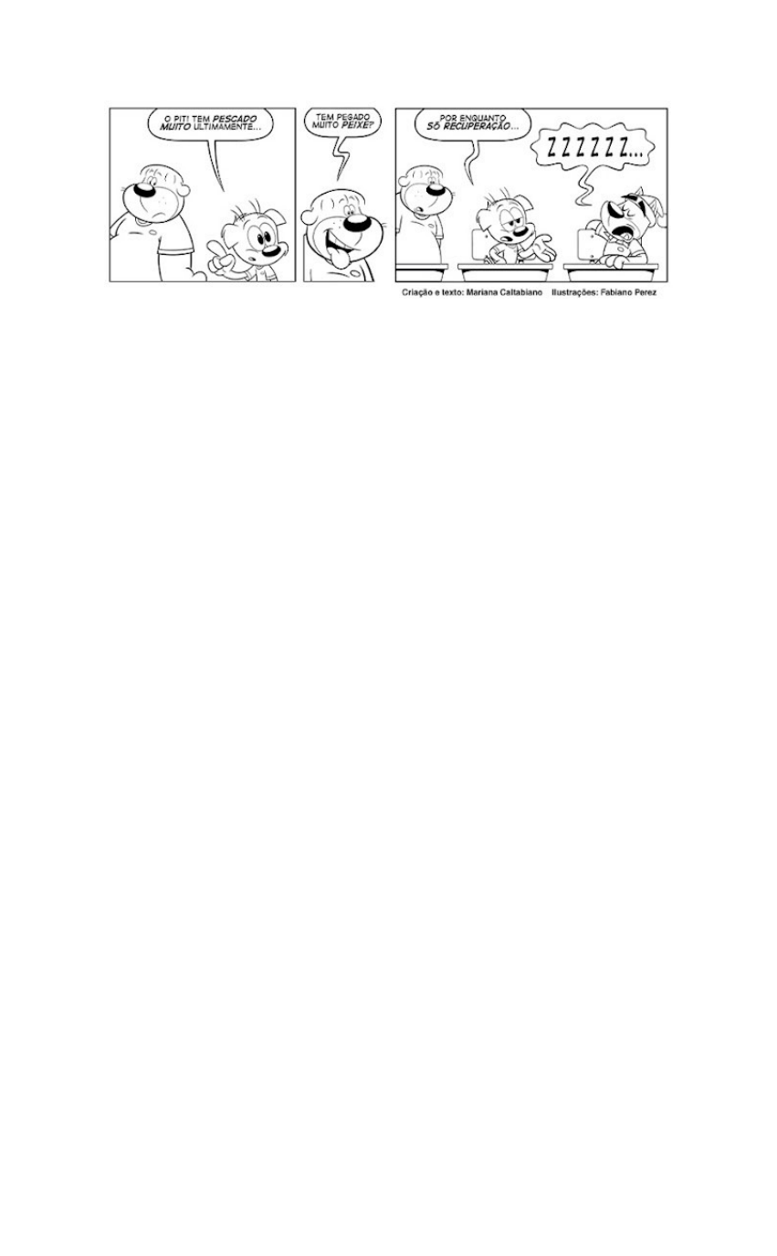 NOME:________________________________________________________ ATIVIDADE DE PORTUGUÊS LEIA O TEXTO ABAIXO PARA RESPONDER ÀS QUESTÕES 1 - 9: 1. Qual o gênero do texto? a) Uma carta. b) Uma tirinha. c) Um bilhete. d) Uma fábula. 2. Quantos personagens aparecem na história? ______________________________________________________________ 3. Em que lugar a história acontece? ______________________________________________________________ 4. Sobre quem os dois primeiros personagens estão falando? ______________________________________________________________ 5. O rosto do personagem do segundo quadrinho revela que ele está com vontade de: a) estudar. b) brincar. c) comer. d) conversar. 6. O texto revela que o último personagem: a) gosta de estudar. b) não gosta de brincar. c) gostar de colar na prova. d) falta muito à escola. 7. O que significam as letras “ZZZZZZ” no último balão? ______________________________________________________________ 8. O texto serve para a) vender um peixe. b) explicar como colar na prova. c) mostrar como se dorme. d) contar uma história. 9. A palavra que revela quantidade é: a) pescado. b) muito. c) recuperação. d) pegado. Leia o texto para responder às questões: 1. Qual o gênero do texto? _______________________________________________________ 2. Qual o assunto da tirinha? _______________________________________________________ 3. Quem era o goleiro do jogo de futebol? _______________________________________________________ 4. Por que o time adversário conseguiu fazer o gol? _______________________________________________________ 5. O que o personagem do quadrinho acima, quis dizer com “mas custa você voltar pro gol quando a gente é atacado?” ________________________________________________________ 6. A finalidade do texto é: a) anunciar. b) divertir. c) criticar. d) opinar. 7. No trecho: "... voltar pro gol...", a palavra grifada faz parte de uma linguagem: a) formal. b) visual. c) literária. d) informal. Leia a tirinha para responder às questões 1 - 4: 1. A finalidade do texto é a) provocar uma crítica. b) narrar um fato cômico. c) descrever um acontecimento. d) convencer o leitor. 2. No primeiro quadrinho, é possível concluir que o cão está a) pensativo. b) pachorrento. c) entusiasmado. d) consternado. 3. A palavra "ótima", no segundo quadrinho, é uma característica (adjetivo) da palavra a) peça. b) teatro. c) vacina. d) programa. 4. O texto causa humor porque há a) uma continuidade da expectativa inicial. b) uma hegemonia do pensamento do cão. c) um anseio de o leitor encontrar algo engraçado. d) uma quebra de expectativa na história. Leia o texto para resolver às questões 5 - 7: 5. A pergunta da cigarra no último quadrinho justifica-se porque a) o cupim não é amigo da cigarra. b) a cigarra não gosta de emprestar nada. c) o cupim não devolveria seu violão inteiro porque iria devorá-lo. d) a cigarra não é a verdadeira dona do violão. 6. O humor da tirinha é provocado porque a) a cigarra não empresta seu violão. b) o cupim desistiu de pedir emprestado. c) a cigarra faz uma pergunta ao leitor. d) a cigarra e o cupim não chegaram a um acordo. 7. Há uma linguagem informal no trecho a) "Cigarra!" b) "Me empresta..." c) "Só um pouquinho!" d) "Não!" Leia o texto e resolva à questão 8: 8. A tirinha é engraçado porque a) o cozinheiro não sabe fazer refeições elaboradas. b) o sargento se satisfaz com qualquer tipo e qualidade de alimento. c) o cozinheiro enganou o sargento. d) o sargento ficou feliz com o alimento preparado pelo cozinheiro. Leia e resolva às questões 9 e 10: 9. Há uma linguagem coloquial no trecho: a) "O que tem pro jantar, Helga?" b) "... em um delicioso molho de queijo." c) "... mingau de aveia frio." d) "Esqueci nosso aniversário..." 10. O traço de humor na tirinha está em: a) “O que tem para o jantar, Helga?” b) “Eu vou comer faisão com batatas gratinadas...” c) “Você vai comer mingau de aveia frio.” d) “Esqueci nosso aniversário de casamento de novo, né?” Leia e resolva às questões 1 – 5. 1. A tirinha acima faz parte de uma campanha de trânsito intitulada “Dicas para Viajar Tranquilo” do estado de São Paulo. Observe os recursos verbais e não verbais empregados e responda: qual o assunto principal desse texto? a) A segurança no trânsito. b) O transporte de crianças. c) Os acessórios de segurança. d) As brincadeiras de crianças. 2. A finalidade do texto é a) informar normas de segurança no trânsito. b) divulgar novas brincadeiras de trânsito. c) reclamar sobre o transporte de crianças. d) conscientizar sobre cuidados no trânsito. 3. No segundo quadrinho, a palavra “por isso” revela sentido de a) causa. b) tempo. c) conclusão. d) oposição. 4. O que significa a expressão “TUM” em destaque no texto? _______________________________________________________________ 5. Que sentimento pode ser observado no Cebolinha através da sua expressão facial no terceiro quadrinho? _______________________________________________________________ Leia e resolva às questões 6 – 9. 6. O uso das reticências (...), no segundo quadrinho, foi empregado para marcar a) uma dúvida. b) uma continuidade. c) uma interrupção. d) um chamamento. 7. Há emprego da linguagem informal em: a) “O segredo pra sobreviver...” b) “... é se manter ocupado!” c) “Nós faremos o que a Helga...” d) “... mudando os móveis de lugar.” 8. O humor da tirinha ocorre quando Hagar a) revela que sua mulher vive trocando os móveis de lugar. b) compreende que deve ficar trocando os móveis de lugar. c) apresenta ao seu amigo dicas para sobreviver na ilha. d) resolve ficar mudando os troncos de madeira do lugar. 9. A palavra “numa” é uma combinação de duas palavras: uma preposição e um artigo indefinido. Quais são essas duas palavras que formam essa cominação? ______________________________________________________________ Leia e resolva às 