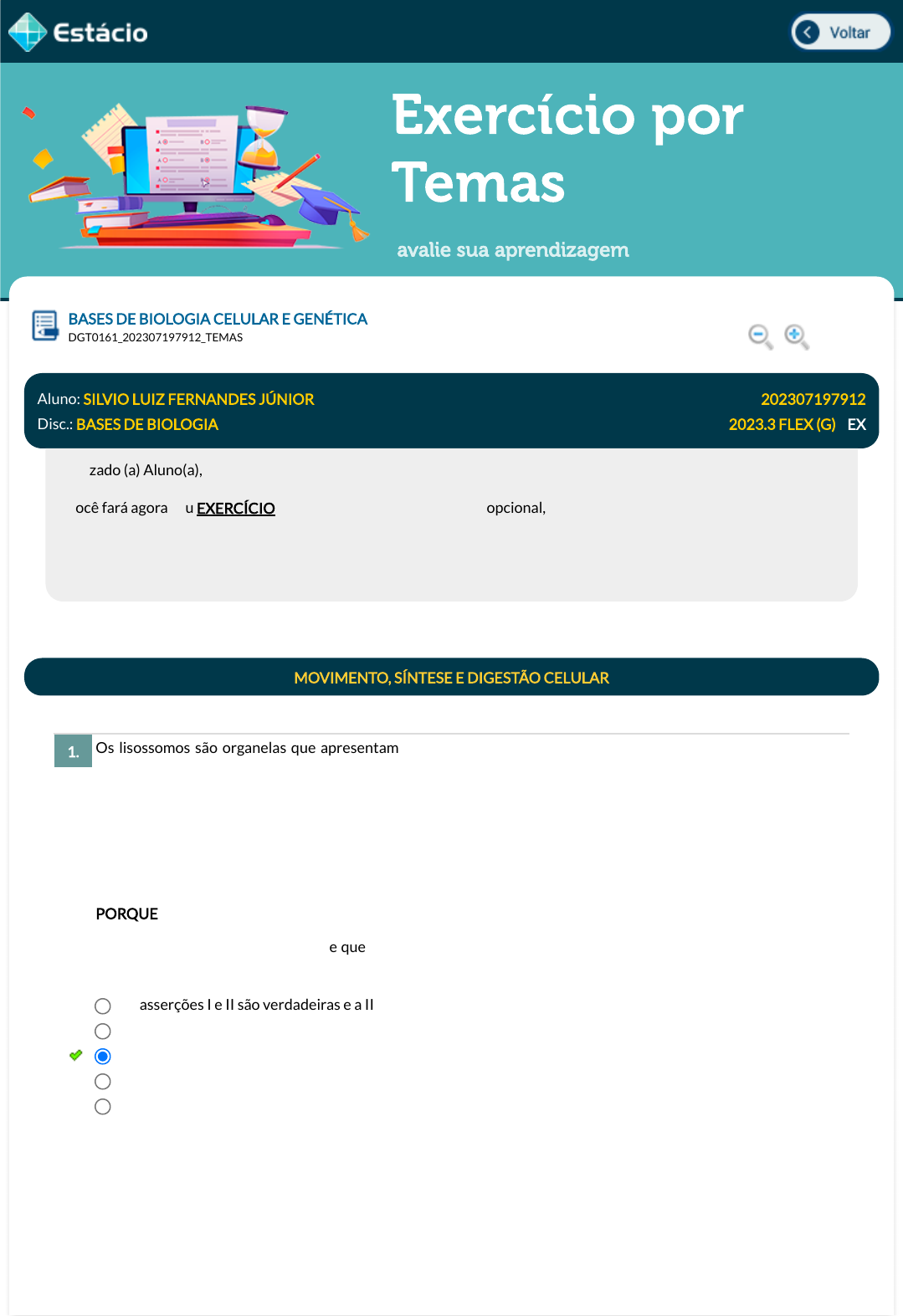 06/11/2023, 20:01 Estácio: Alunos https://simulado.estacio.br/alunos/ 1/5 Exercício por Temas avalie sua aprendizagem Os lisossomos são organelas que apresentam funções importantes no metabolismo celular, participam de vários processos celulares e fazem parte do sistema de endomembranas, assim como o retículo endoplasmático e o Complexo de Golgi. Com base nestas infromações, leia as asserções a seguir e assinale a alternativa correta. I. Os lisossomos possuem na sua estrutura uma membrana que o envolve, onde bombas de H+ hidrolisam ATP e bombeiam íons de H+ para o interior do lisossomo PORQUE II. no lúmen lisossomal, é importante que o pH seja ácido para que as enzimas digestivas em seu interior atuem na digestão de forma ideal. BASES DE BIOLOGIA CELULAR E GENÉTICA Lupa DGT0161_202307197912_TEMAS Aluno: SILVIO LUIZ FERNANDES JÚNIOR Matr.: 202307197912 Disc.: BASES DE BIOLOGIA 2023.3 FLEX (G) / EX Prezado (a) Aluno(a), Você fará agora seu EXERCÍCIO! Lembre-se que este exercício é opcional, mas não valerá ponto para sua avaliação. O mesmo será composto de questões de múltipla escolha. Após responde cada questão, você terá acesso ao gabarito comentado e/ou à explicação da mesma. Aproveite para se familiarizar com este modelo de questões que será usado na sua AV e AVS. MOVIMENTO, SÍNTESE E DIGESTÃO CELULAR 1. As asserções I e II são verdadeiras e a II não é uma justi�cativa para a I. A asserção I é falsa e a II é verdadeira. As asserções I e II são verdadeiras e a II é uma justi�cativa para a I. As asserções I e II são falsas. A asserção I é verdadeira e a II é falsa. Data Resp.: 06/11/2023 19:57:00 Explicação: Lisossomo, retículo endoplasmático e Complexo de Golgi são organelas que compõem o sistema de endomembranas. O lisossomo apresenta muitas funções como, por exemplo, a degradação de componentes celulares obsoletos. A membrana que envolve o lisossomo possui bombas de H+ que hidrolisam ATP e bombeiam íons de H+ para o lúmen lisossomal, tornando-o ácido. O pH ácido é essencial, uma vez que as enzimas digestivas que estão no seu interior possuem sua ação ideal em pH baixo. javascript:voltar(); javascript:voltar(); javascript:voltar(); javascript:voltar(); javascript:diminui(); javascript:diminui(); javascript:aumenta(); javascript:aumenta(); 06/11/2023, 20:01 Estácio: Alunos https://simulado.estacio.br/alunos/ 2/5 As células, ao realizarem o processo de endocitose, formam vesículas endocíticas que se fundem ao endossomo primário, que está próximo à membrana plasmática. Antes que ocorra a fusão das vesículas com os endossomos, estas perdem suas proteínas de revestimento. Depois que ocorre a fusão, os receptores membranares que foram internalizados: O citoesqueleto é uma rede de �lamentos que dá sustentação para a membrana plasmática, dando à célula sua forma geral, contribui para o posicionamento das organelas, de�ne os caminhos de transporte de vesículas e proporciona o movimento em muitos tipos de células. Os �lamentos que compõem o citoesqueleto têm capacidade de polimerização e despolimerização, condição importante para alguns processos celulares. Com base nesse texto, considere as asserções abaixo e assinale a alternativa correta. O citoesqueleto é formado por três grupos principais de �lamentos com características e funções especí�cas que são essenciais para o funcionamento e para as atividades celulares. PORQUE Além de atuarem separadamente, também realizam funções em conjunto. Um exemplo disso é o que ocorre na divisão celular, onde os microtúbulos formam o fuso mitótico e segregam os cromossomos, enquanto os �lamentos de actina produzem um anel contrátil no centro celular para dividir a célula-mãe em duas células-�lhas. As vesículas que se movimentam entre o retículo endoplasmático rugoso e o Complexo de Golgi se formam a partir do brotamento da membrana e são revestidas por proteínas, que são chamadas de proteínas de revestimento. Considerando as características das proteínas de revestimento, leia as a�rmativas e assinale a alternativa correta. 2. são enviados para o Complexo de Golgi. se transformam em corpos multivesiculares. são degradados no interior do endossomo inicial. retornam à membrana plasmática através de vesículas de transporte que brotam do endossomo inicial. seguem para o destino �nal nos lisossomos onde serão inteiramente digeridos. Data Resp.: 06/11/2023 19:57:48 Explicação: Logo depois da fusão, os receptores que foram internalizados voltam à membrana plasmática a partir de vesículas de transporte que se originam do endossomo inicial. Ao mesmo tempo, as partículas que estavam associadas anteriormente ao receptor e que continuam no endossomo inicial são dirigidas para a via de degradação no lisossomo. 3. A asserção I é falsa e a II é verdadeira. As asserções I e II são falsas. A asserção I é verdadeira e a II é falsa. As asserções I e II são verdadeiras e a II é uma justi�cativa para a I. As asserções I e II são verdadeiras e a II não é uma justi�cativa para a I. Data Resp.: 06/11/2023 19:58:23 Explicação: As duas asserções são verdadeiras e a II justi�ca a I, pois o funcionamento dos três �lamentos são indispensáveis para o funcionamento normal de uma célula. Uma divisão celular, por exemplo, não é realizada se não houver o trabalho ao mesmo tempo dos diferentes �lamentos. Se o microtúbulo estiver funcional e os �lamentos de actina não, a divisão não é completada. 4. 06/11/2023, 20:01 Estácio: Alunos https://simulado.estacio.br/alunos/ 3/5 I. O revestimento por clatrina acontece principalmente nas vesículas que agem no transporte entre o retículo endoplasmático rugoso e o Complexo de Golgi. II. As vesículas que brotam do retículo endoplasmático são revestidas pela proteína COP II. III. O revestimento por COP I acontece nas vesíc