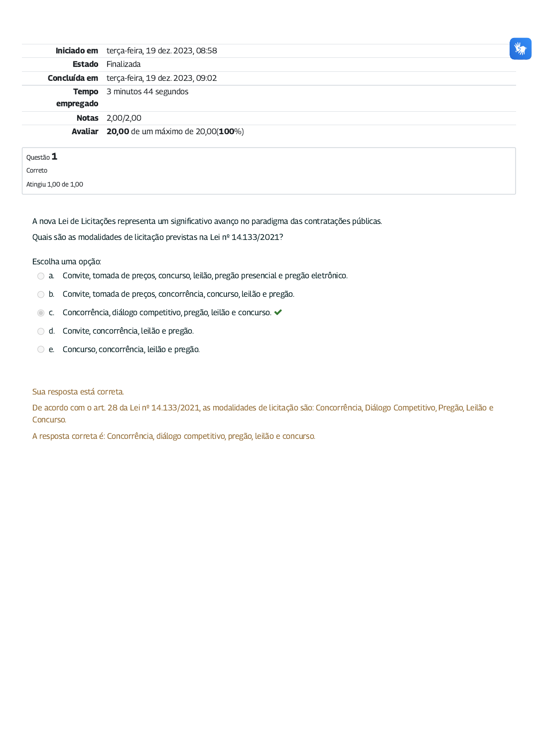 19/12/2023, 09:02 Exercício avaliativo - Módulo 1: Revisão da tentativa https://mooc41.escolavirtual.gov.br/mod/quiz/review.php?attempt=835793&cmid=18108 1/2 Iniciado em terça-feira, 19 dez. 2023, 08:58 Estado Finalizada Concluída em terça-feira, 19 dez. 2023, 09:02 Tempo empregado 3 minutos 44 segundos Notas 2,00/2,00 Avaliar 20,00 de um máximo de 20,00(100%) Questão 1 Correto Atingiu 1,00 de 1,00 A nova Lei de Licitações representa um signi�cativo avanço no paradigma das contratações públicas. Quais são as modalidades de licitação previstas na Lei nº 14.133/2021? Escolha uma opção: a. Convite, tomada de preços, concurso, leilão, pregão presencial e pregão eletrônico. b. Convite, tomada de preços, concorrência, concurso, leilão e pregão. c. Concorrência, diálogo competitivo, pregão, leilão e concurso. d. Convite, concorrência, leilão e pregão. e. Concurso, concorrência, leilão e pregão. Sua resposta está correta. De acordo com o art. 28 da Lei nº 14.133/2021, as modalidades de licitação são: Concorrência, Diálogo Competitivo, Pregão, Leilão e Concurso. A resposta correta é: Concorrência, diálogo competitivo, pregão, leilão e concurso. 19/12/2023, 09:02 Exercício avaliativo - Módulo 1: Revisão da tentativa https://mooc41.escolavirtual.gov.br/mod/quiz/review.php?attempt=835793&cmid=18108 2/2 Questão 2 Correto Atingiu 1,00 de 1,00 Os critérios de julgamento das propostas na seleção do fornecedor pela administração pública é um dos tópicos avaliados na fase preparatória da licitação. Quais são os critérios de julgamento previstos na Lei nº 14.133/2021? Escolha uma opção: a. Menor preço, técnica e preço, melhor técnica e maior lance ou oferta. b. Menor preço e maior oferta. c. Menor preço, maior desconto, técnica e preço, melhor técnica ou conteúdo artístico, e maior lance. d. Melhor técnica e maior lance ou oferta. e. Menor preço, maior desconto, técnica e preço, melhor técnica ou conteúdo artístico, maior lance e maior retorno econômico. Sua resposta está correta. Conforme o art. 33 da Lei nº 14.133/2021, o julgamento das propostas será realizado de acordo com os seguintes critérios: menor preço, maior desconto, melhor técnica ou conteúdo artístico, técnica e preço, maior lance, no caso de leilão, e maior retorno econômico. A resposta correta é: Menor preço, maior desconto, técnica e preço, melhor técnica ou conteúdo artístico, maior lance e maior retorno econômico.