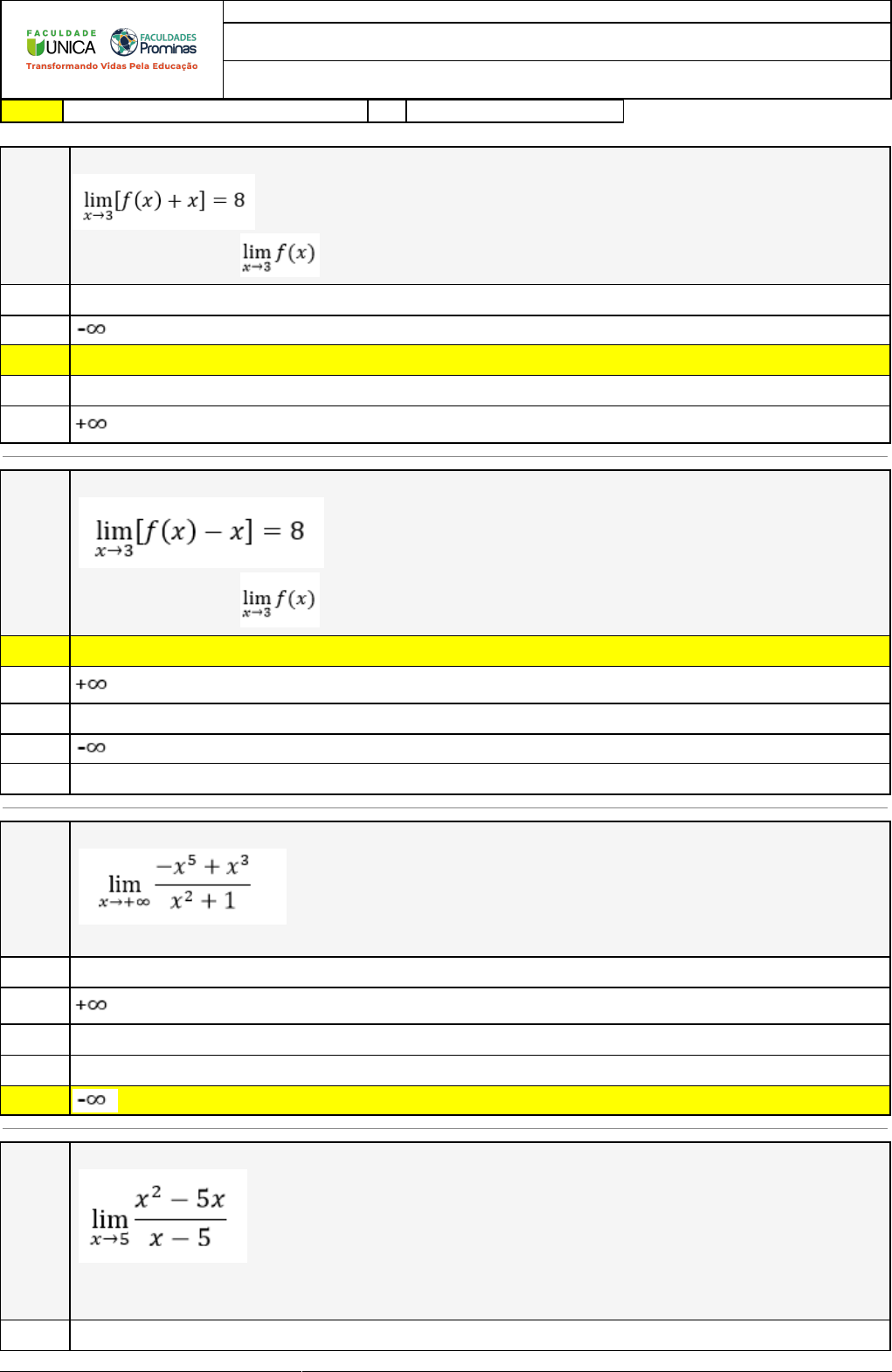 28/05/2023 20:12:12 1/3 REVISÃO DE SIMULADO Nome: MATEUS SOARES DE OLIVEIRA Disciplina: Cálculo Diferencial e Integral I e II Respostas corretas são marcadas em amarelo X Respostas marcardas por você. Questão 001 Analise o limite abaixo. Então o resultado é: A) 0 B) C) 5 X D) 3 E) Questão 002 Analise o limite abaixo. Então o resultado é: A) 11 B) C) 0 X D) E) 5 Questão 003 Analise o limite abaixo. O resultado desse limite é: A) 0 X B) C) 1 D) -1 E) Questão 004 Analise o limite abaixo. O resultado desse limite é: (Sugestão: fatore o numerador antes de calcular o limite) X A) 2 28/05/2023 20:12:12 2/3 B) 5 C) 1 D) 0 E) -5 Questão 005 Analise o limite abaixo. Então o resultado é: A) 2 B) C) X D) 3 E) 0 Questão 006 Analise o limite abaixo. O resultado desse limite é: A) 6 X B) 0 C) D) 6/4 E) Questão 007 Analise o limite abaixo. O resultado desse limite é: (Sugestão: fatore o numerador antes de calcular o limite) X A) 5 B) -5 C) 0 D) 2 E) 1 Questão 008 Analise o limite abaixo. O resultado desse limite é: (Sugestão: fatore o numerador antes de calcular o limite) A) 0 28/05/2023 20:12:12 3/3 B) X C) -2 D) 2 E)