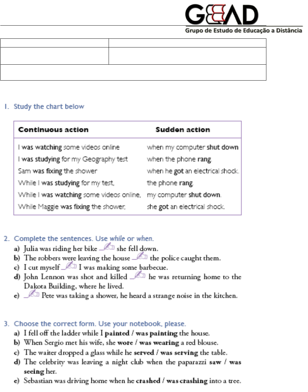 Comunicação Modulo II Agenda 15 Atividade avaliativa I Was Watching a Video When My Computer Shut Down Aluno: Joamilton Gomes da Silva Exercício 2 a) Julia was riding her bike when she fell down. b) The robbers were leaving the house when the police caught them. c) I cut myself when I was making some barbecue. d) John Lennon was shot and killed when he was returning home to the Dakota Building, where he lived. e) Pete was taking a shower when he heard a strange noise in the kitchen. Exercicio 3 a) I fell off the ladder while I was painting the house. b) When Sergio met his wife, she was wearing a red blouse. c) The waiter dropped a glass while he was serving the table. d) The celebrity was leaving a night club when the paparazzi were seeing her. e) Sebastian was driving home when he crashed into a tree. a - The boys were playing ball when it started to rain. b - The mechanic was fixing my car when he got an electric shock c - The police officer stopped the driver quickly when he was driving. d - Cristina met her boyfriend when she was traveling in Europe.