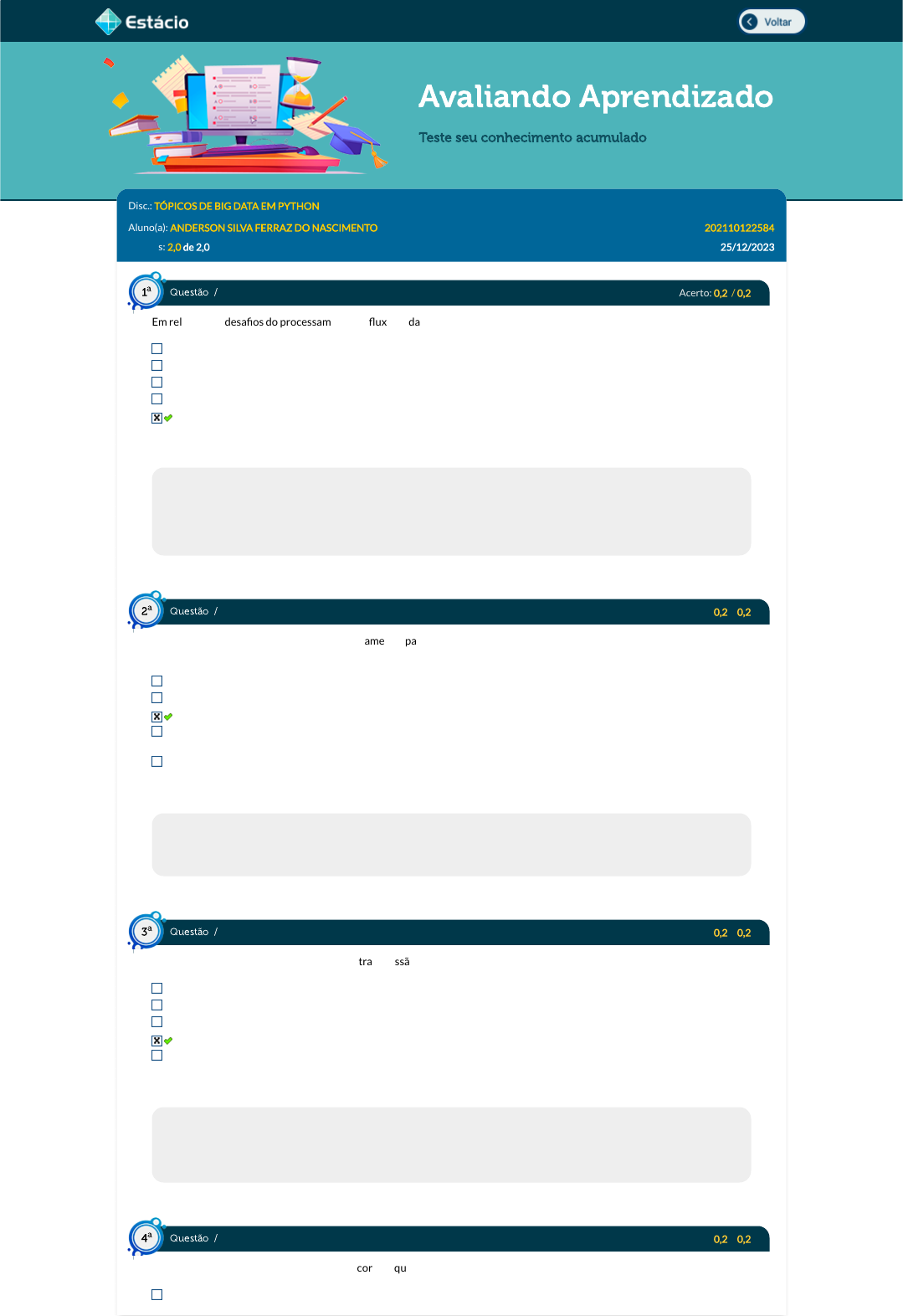 25/12/2023, 14:01 Estácio: Alunos https://simulado.estacio.br/alunos/ 1/3 Avaliando Aprendizado Teste seu conhecimento acumulado Disc.: TÓPICOS DE BIG DATA EM PYTHON Aluno(a): ANDERSON SILVA FERRAZ DO NASCIMENTO 202110122584 Acertos: 2,0 de 2,0 25/12/2023 Acerto: 0,2 / 0,2 Em relação aos desa�os do processamento de �uxo de dados, selecione a opção correta. Usar algoritmos de criptogra�a nos dados para evitar o acesso indevido. Garantir a qualidade dos dados através de ferramentas de controle que não aceitem qualquer inconsistência. Aplicar recursos de redundância no projeto para reduzir a volatilidade dos dados. Dimensionar o projeto logo no início para evitar a necessidade de expansão posteriormente. Garantir a consistência da informação através da ordenação dos dados. Respondido em 25/12/2023 13:52:16 Explicação: Nas aplicações de streaming de dados, di�cilmente não vai ocorrer alguma inconsistência, pois, normalmente, elas estão contextualizadas em ambientes dinâmicos. Portanto, deve-se ordenar os dados para manter a consistência dos dados e, além disso, o sistema deve ter uma tolerância a falhas sendo capaz de operar ainda que haja problemas, desde que estejam dentro de um patamar de qualidade pré-estabelecido. Acerto: 0,2 / 0,2 Reconhecer os conceitos de Data Lake é fundamental para o pro�ssional de Tecnologia da Informação. Selecione a opção correta que de�ne resumidamente o que é o Data Lake. É um ambiente para tratamento e armazenamento apenas de dados relacionais. É um repositório para tratamento dos dados. É um repositório centralizado para armazenamento de dados. Trata-se de um componente do HDFS responsável pela implementação do mecanismo MapReduce para fazer o gerenciamento dos dados. É uma tecnologia de armazenamento e processamento de dados. Respondido em 25/12/2023 13:52:53 Explicação: O Data Lake é um repositório centralizado capaz de armazenar dados nos diversos formatos: estruturados, não estruturados e semiestruturados sem a necessidade de aplicar nenhum tratamento. Acerto: 0,2 / 0,2 Em relação ao protocolo de transporte para transmissão de aplicações de streaming, selecione a opção correta. MQTT CoAP HTTP UDP TCP Respondido em 25/12/2023 13:54:12 Explicação: O protocolo UDP - protocolo de datagrama do usuário - é utilizado para aplicações de streaming por ser mais rápido. O protocolo TCP é orientado à con�abilidade e, no caso de aplicações de streaming, ele é muito lento inviabilizando a aplicação. Os protocolos HTTP, MQTT e CoAP não se enquadram no transporte de dados. Acerto: 0,2 / 0,2 Em relação ao Data Lake, selecione a opção correta que contenha o(s) formato(s) de dados que pode(m) ser armazenado(s) nele. apenas estruturado Questão / 1 a Questão / 2 a Questão / 3 a Questão / 4 a https://simulado.estacio.br/alunos/inicio.asp https://simulado.estacio.br/alunos/inicio.asp javascript:voltar(); javascript:voltar(); 25/12/2023, 14:01 Estácio: Alunos https://simulado.estacio.br/alunos/ 2/3 apenas tabelas relacionais apenas não estruturado estruturado, não estruturado e semiestruturado estruturado e semiestruturado Respondido em 25/12/2023 13:55:42 Explicação: O Data Lake pode armazenar dados estruturados, semiestruturados e não estruturados que correspondem a característica de variedade dos dados que é bem típica de aplicações de Big Data. Acerto: 0,2 / 0,2 Em relação ao formato dos dados, selecione a opção correta que corresponde ao formato dos dados de transações bancárias. dados semiestruturados dados de Big Data dados de Internet das Coisas dados estruturados dados não estruturados Respondido em 25/12/2023 13:56:42 Explicação: Os dados de transações bancárias são salvos em tabelas e, portanto, correspondem a dados estruturados, que são típicos de sistemas de transações on line armazenados em banco de dados. As demais alternativas tratam de dados não convencionais que não são armazenados em bancos de dados tradicionais. Acerto: 0,2 / 0,2 A respeito do HDFS, selecione a opção correta cujo componente lógico mantém os dados do usuário na forma de blocos de dados. Bloco de dados YARN Replicação NameNode DataNode Respondido em 25/12/2023 13:57:16 Explicação: O DataNode é componente da arquitetura do HDFS responsável pelo armazenamento dos dados na forma de blocos de dados. Acerto: 0,2 / 0,2 (NC-UFPR/2019 - Adaptada) Sobre a IoT (Internet das coisas) e seus blocos básicos de construção, identi�que como verdadeiras (V) ou falsas (F) as seguintes a�rmativas: ( ) Na IoT, os objetos podem prover comunicação entre usuários e dispositivos, viabilizando diversas aplicações, tais como coleta de dados de pacientes e monitoramento de idosos e sensoriamento de ambientes de difícil acesso. ( ) A tecnologia de IoT consiste na coexistência colaborativa de dois componentes: As "coisas" e os protocolos de rede que permitem a sua comunicação. ( ) Protocolos de comunicação: Viabilizam a troca de dados via Internet entre os objetos físicos e outros sistemas. Assinale a alternativa que apresenta a sequência correta, de cima para baixo. F V V F V F F F F V V F V F V Respondido em 25/12/2023 13:57:57 Explicação: O avanço da tecnologia criou dispositivos e sensores eletrônicos que geram enormes quantidades de dados. Esses equipamentos podem ser utilizados em diversas aplicações, tais como: coleta de dados de pacientes e monitoramento de idosos e sensoriamento de ambientes de difícil acesso. A tecnologia de IoT consiste na coexistência colaborativa de quatro componentes: Objetos físicos (ou "coisas"), Computação, Protocolos de comunicação e Serviços. Questão / 5 a Questão / 6 a Questão / 7 a 25/12/2023, 14:01 Estácio: Alunos https://simulado.estacio.br/alunos/ 3/3 Acerto: 0,2 / 0,2 O Hadoop é uma tecnologia especializada em atender as demandas de Big Data. Selecione a opção correta que contenha a linguagem de programaç