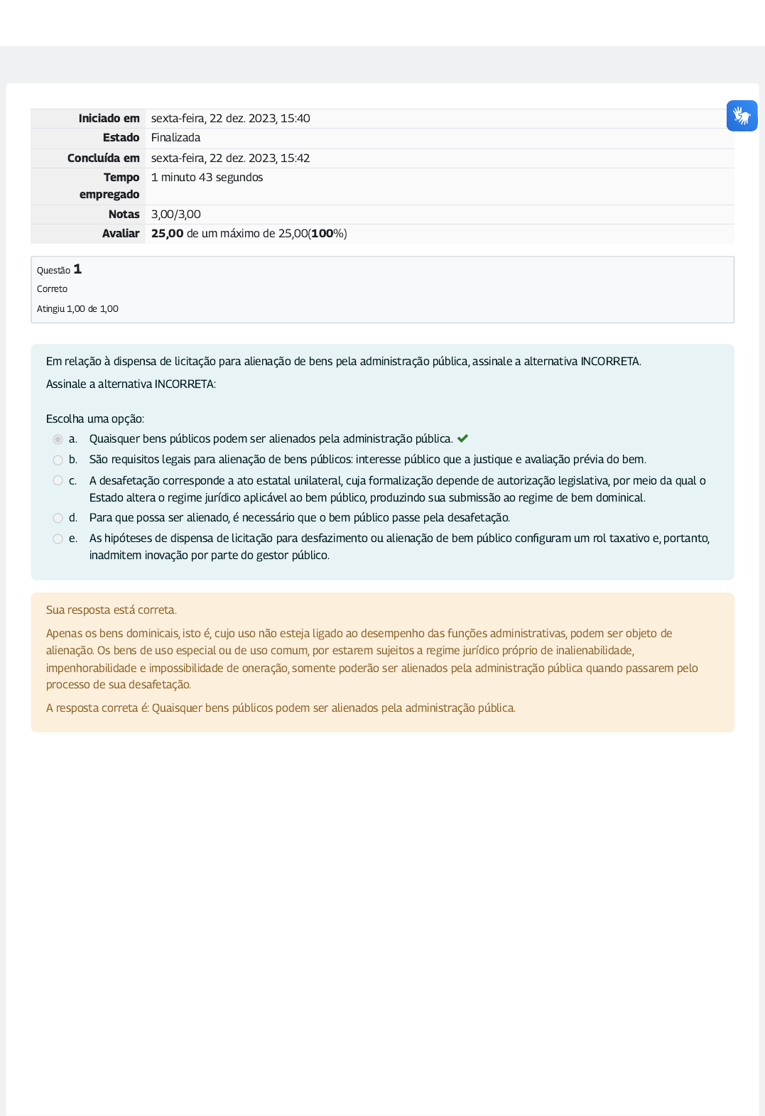 Iniciado em sexta-feira, 22 dez. 2023, 15:40 Estado Finalizada Concluída em sexta-feira, 22 dez. 2023, 15:42 Tempo empregado 1 minuto 43 segundos Notas 3,00/3,00 Avaliar 25,00 de um máximo de 25,00(100%) Questão 1 Correto Atingiu 1,00 de 1,00 Em relação à dispensa de licitação para alienação de bens pela administração pública, assinale a alternativa INCORRETA. Assinale a alternativa INCORRETA: Escolha uma opção: a. Quaisquer bens públicos podem ser alienados pela administração pública. b. São requisitos legais para alienação de bens públicos: interesse público que a justique e avaliação prévia do bem. c. A desafetação corresponde a ato estatal unilateral, cuja formalização depende de autorização legislativa, por meio da qual o Estado altera o regime jurídico aplicável ao bem público, produzindo sua submissão ao regime de bem dominical. d. Para que possa ser alienado, é necessário que o bem público passe pela desafetação. e. As hipóteses de dispensa de licitação para desfazimento ou alienação de bem público con�guram um rol taxativo e, portanto, inadmitem inovação por parte do gestor público. Sua resposta está correta. Apenas os bens dominicais, isto é, cujo uso não esteja ligado ao desempenho das funções administrativas, podem ser objeto de alienação. Os bens de uso especial ou de uso comum, por estarem sujeitos a regime jurídico próprio de inalienabilidade, impenhorabilidade e impossibilidade de oneração, somente poderão ser alienados pela administração pública quando passarem pelo processo de sua desafetação. A resposta correta é: Quaisquer bens públicos podem ser alienados pela administração pública. Questão 2 Correto Atingiu 1,00 de 1,00 De acordo com o art. 76 da Lei nº 14.133/2021, é correto a�rmar: Assinale a alternativa correta: Escolha uma opção: a. A alienação de bens móveis e imóveis pela administração pública exige autorização legislativa. b. A dação em pagamento é uma hipótese que dispensa a licitação para alienação de bem público móvel. c. Doação e permuta são hipóteses que dispensam o uso da licitação para alienação de bens públicos móveis ou imóveis. d. A doação onerosa de imóvel público dispensa a realização de licitação prévia. e. Se o imóvel a ser alienado tiver sido adquirido em procedimento judicial, será necessária autorização legislativa para a sua alienação por dispensa de licitação. Sua resposta está correta. A alienação de bens imóveis pela administração pública exige autorização legislativa, ressalvada a hipótese do imóvel ser adquirido por dação em pagamento ou em procedimento judicial. A alienação de bens móveis pela administração pública, em contrapartida não necessita de autorização legislativa. São hipóteses em que a lei autoriza a dispensa de licitação para alienação de bem público imóvel: a dação em pagamento, a permuta, a investidura, a venda, a alienação gratuita ou onerosa, o aforamento, a concessão de direito real de uso, a locação e permissão de uso, a alienação e concessão de direito real de uso, gratuita ou onerosa, a legitimação de posse por meio da concessão de licença de ocupação e a legitimação fundiária e legitimação de posse. Quanto à alienação de bem público móvel, a lei dispensa a licitação em caso de doação sem ônus, permuta, venda de ações, venda de títulos, venda de bens produzidos ou comercializados por entidades da Administração Pública, venda de materiais e equipamentos para outro ente da Administração Pública. A resposta correta é: Doação e permuta são hipóteses que dispensam o uso da licitação para alienação de bens públicos móveis ou imóveis. Questão 3 Correto Atingiu 1,00 de 1,00 Considere que determinado órgão da administração pública federal, em vista da redução de suas atividades e de seu quadro de pessoal, pretenda permutar o imóvel onde se encontra atualmente instalado, avaliado no valor de R$ 400.000,00, por outro, com área menor, localizado nas proximidades e que atenda às �nalidades de instalação do referido órgão, em vista da redução de pessoal e das atividades. Nesse contexto, e de acordo com a Lei nº 14.133/2021, é possível a�rmar: Nesse contexto, e de acordo com a Lei nº 14.133/2021, é possível a�rmar: Escolha uma opção: a. Se o imóvel a ser permutado com o bem público possuir valor diferente do valor venal de R$ 400.000,00, não poderá ocorrer a permuta. b. Para que a licitação seja dispensada, o imóvel a ser recebido pela administração pública, não poderá custar menos do que R$ 200.000,00. c. Se o valor do imóvel a ser recebido pela administração pública for inferior a R$ 400.000,00, a permuta poderá ocorrer, mas sem dispensa de licitação. d. Se o valor do imóvel a ser recebido for inferior a R$ 400.000,00, havendo a permuta, quem receber o imóvel público não precisará devolver a diferença de valor ao erário. e. A permuta do imóvel público independe de autorização legislativa Sua resposta está correta. A permuta é uma das hipóteses legais em que é possível o desfazimento ou a alienação de imóvel público por dispensa de licitação, desde que observados os seguintes requistos: 1) o imóvel ou os imóveis a serem recebidos em troca atendam aos requisitos relacionados às �nalidades precípuas da administração; 2) a diferença apurada não ultrapasse a metade do valor do imóvel que será ofertado pela União, segundo avaliação prévia; 3) ocorra o retorno de valores, sempre que for o caso; e 4) exista autorização legal em caso de imóvel com uso afetado à função administrativa. A resposta correta é: Para que a licitação seja dispensada, o imóvel a ser recebido pela administração pública, não poderá custar menos do que R$ 200.000,00.