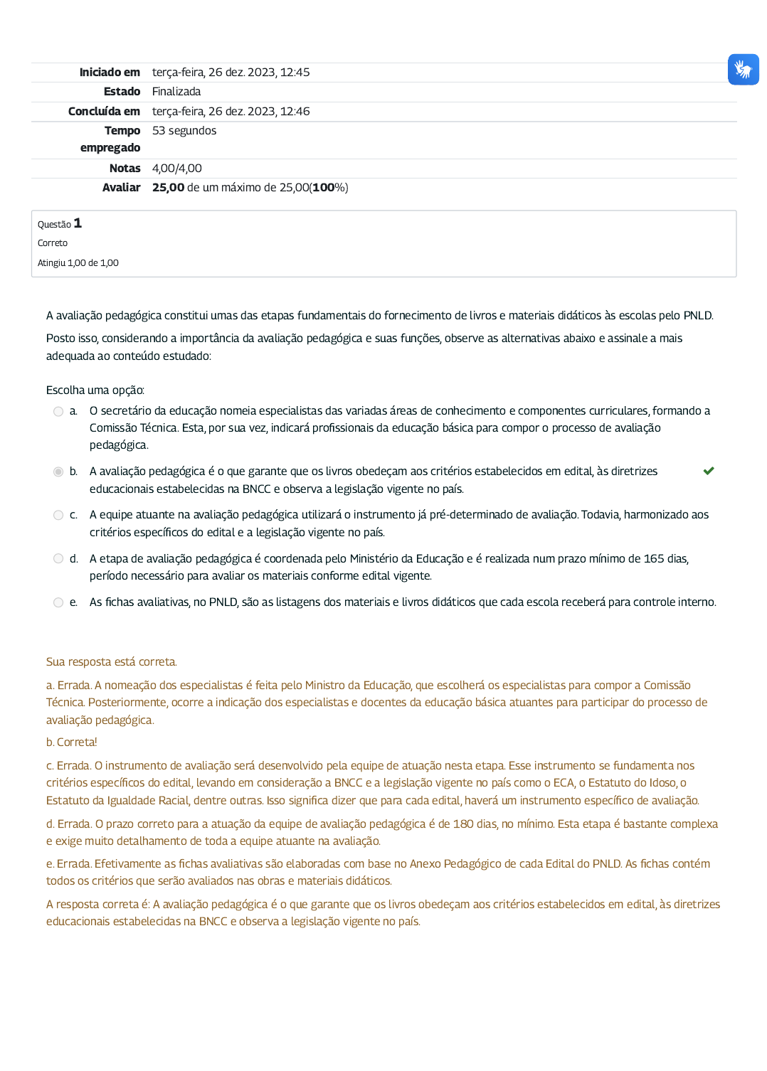 26/12/2023, 12:46 Exercício Avaliativo - Módulo 4: Revisão da tentativa https://mooc41.escolavirtual.gov.br/mod/quiz/review.php?attempt=976059&cmid=21331 1/4 Iniciado em terça-feira, 26 dez. 2023, 12:45 Estado Finalizada Concluída em terça-feira, 26 dez. 2023, 12:46 Tempo empregado 53 segundos Notas 4,00/4,00 Avaliar 25,00 de um máximo de 25,00(100%) Questão 1 Correto Atingiu 1,00 de 1,00 A avaliação pedagógica constitui umas das etapas fundamentais do fornecimento de livros e materiais didáticos às escolas pelo PNLD. Posto isso, considerando a importância da avaliação pedagógica e suas funções, observe as alternativas abaixo e assinale a mais adequada ao conteúdo estudado: Escolha uma opção: a. O secretário da educação nomeia especialistas das variadas áreas de conhecimento e componentes curriculares, formando a Comissão Técnica. Esta, por sua vez, indicará pro�ssionais da educação básica para compor o processo de avaliação pedagógica. b. A avaliação pedagógica é o que garante que os livros obedeçam aos critérios estabelecidos em edital, às diretrizes educacionais estabelecidas na BNCC e observa a legislação vigente no país. c. A equipe atuante na avaliação pedagógica utilizará o instrumento já pré-determinado de avaliação. Todavia, harmonizado aos critérios especí�cos do edital e a legislação vigente no país. d. A etapa de avaliação pedagógica é coordenada pelo Ministério da Educação e é realizada num prazo mínimo de 165 dias, período necessário para avaliar os materiais conforme edital vigente. e. As �chas avaliativas, no PNLD, são as listagens dos materiais e livros didáticos que cada escola receberá para controle interno. Sua resposta está correta. a. Errada. A nomeação dos especialistas é feita pelo Ministro da Educação, que escolherá os especialistas para compor a Comissão Técnica. Posteriormente, ocorre a indicação dos especialistas e docentes da educação básica atuantes para participar do processo de avaliação pedagógica. b. Correta! c. Errada. O instrumento de avaliação será desenvolvido pela equipe de atuação nesta etapa. Esse instrumento se fundamenta nos critérios especí�cos do edital, levando em consideração a BNCC e a legislação vigente no país como o ECA, o Estatuto do Idoso, o Estatuto da Igualdade Racial, dentre outras. Isso signi�ca dizer que para cada edital, haverá um instrumento especí�co de avaliação. d. Errada. O prazo correto para a atuação da equipe de avaliação pedagógica é de 180 dias, no mínimo. Esta etapa é bastante complexa e exige muito detalhamento de toda a equipe atuante na avaliação. e. Errada. Efetivamente as �chas avaliativas são elaboradas com base no Anexo Pedagógico de cada Edital do PNLD. As �chas contém todos os critérios que serão avaliados nas obras e materiais didáticos. A resposta correta é: A avaliação pedagógica é o que garante que os livros obedeçam aos critérios estabelecidos em edital, às diretrizes educacionais estabelecidas na BNCC e observa a legislação vigente no país. 26/12/2023, 12:46 Exercício Avaliativo - Módulo 4: Revisão da tentativa https://mooc41.escolavirtual.gov.br/mod/quiz/review.php?attempt=976059&cmid=21331 2/4 Questão 2 Correto Atingiu 1,00 de 1,00 Referente ao encargo que a Resenha possui no processo de escolha no Programa Nacional do Livro e Material Didático, assinale a alternativa mais adequada: Escolha uma opção: a. A resenha é o instrumento que determina quais materiais irão para cada instituição escolar. b. Visa democratizar e garantir que todos tenham acesso ao conhecimento e às informações, ampliando o pensamento crítico e cientí�co, além de desenvolver e melhorar a qualidade de vida de todos. c. A resenha de cada material didático que ocorre depois da avaliação pedagógica é uma ação acessória para o processo de escolhas no PNLD. d. A resenha traz informações explícitas de cada livro e cada material didático, para que o professor possa consultá-la e veri�car se a proposta daquela obra atende ao Projeto Político Pedagógico (PPP) da escola. e. A Resenha é dispensável no direcionamento da escolha dos livros e dos materiais didáticos pelas escolas. Sua resposta está correta. a. Errada. A resenha direciona o professor a conhecer a obra de um modo amplo, geral e, havendo adequação dela com o PPP, o professor poderá consultar a obra integral. b. Errada. Essa alternativa descreve o objetivo do PNLD como um todo na �nalidade de democratizar e garantir o direito a informação e educação de qualidade. c. Errada. A resenha não deve ser confundida como um acessório dispensável, visto que seu encargo é de facilitador na administração dos livros e materiais didáticos. d. Correta! e. Errada. A resenha é fundamental, ou seja, imprescindível para direcionar a escolha dos livros e dos materiais didáticos pelas escolas. A resposta correta é: A resenha traz informações explícitas de cada livro e cada material didático, para que o professor possa consultá- la e veri�car se a proposta daquela obra atende ao Projeto Político Pedagógico (PPP) da escola. 26/12/2023, 12:46 Exercício Avaliativo - Módulo 4: Revisão da tentativa https://mooc41.escolavirtual.gov.br/mod/quiz/review.php?attempt=976059&cmid=21331 3/4 Questão 3 Correto Atingiu 1,00 de 1,00 Com fundamentação no conteúdo estudado, assinale a alternativa mais adequada referente ao Guia do PNLD: Escolha uma opção: a. O Guia do PNLD é considerado um documento não o�cial, disponibilizado para orientar a escolha dos livros didáticos pelas escolas públicas brasileiras. b. O Guia é um documento restrito aos servidores e pro�ssionais diretamente ligados a educação básica do Brasil. c. O Guia do PNLD é o instrumento em que se encontram disponíveis as obras didáticas e literárias aprovadas na etapa de avaliação pedagógica, os princípios e critérios