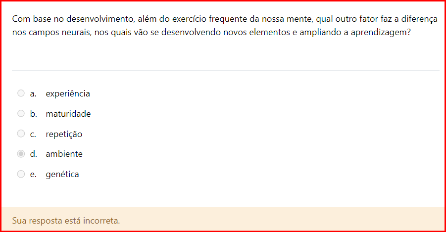 Com base no desenvolvimento, além do exercício frequente da nossa mente, qual outro fator faz a diferença nos campos neurais, nos quais vão se desenvolvendo novos elementos e ampliando a aprendizagem? a. experiência b. maturidade c. repetição d. ambiente e. genética