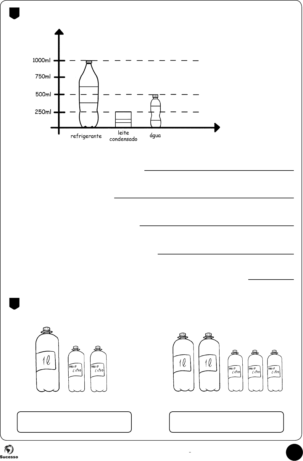 Banco de Questões – Matemática – 2o ano | Ensino Fundamental 121 c. Quantos litros tem o refrigerante? d. Qual é o volume do leite condensado? e. Qual é o resultado da soma dos volumes de água e refrigerante? b. Qual é o volume da água? 5. Observe o gráfico e responda de acordo com o pedido: 6. Quantos litros de líquido há ao todo em cada item? a. Qual o produto de menor volume? a. b. 122 Banco de Questões – Matemática – 2o ano | Ensino Fundamental 7. Quero repartir 1 litro de refrigerante, em 4 copos com 250 ml cada. Quantos copos irei encher? 8. Qual o recipiente que possui o maior volume de líquido? Marque um X na resposta correta. Qual a diferença de volume entre eles? 1 LITRO 5 LITROS 1 LITRO 9. Cinco copos de 200 ml enchem uma garrafa de 1 litro de guaraná. Quantas garrafas enchem 20 copos? 10. Mariana fez 6 litros de suco e quer repartir em jarras de 1 litro cada uma. Quantas jarras Mariana vai precisar? 11. Mamãe faz 4 litros de suco por dia. Quantos litros de suco mamãe faz durante uma semana? Escola: Professor(a): Aluno(a): Turma: Banco de Questões Matemática 3oano Ensino Fundamental