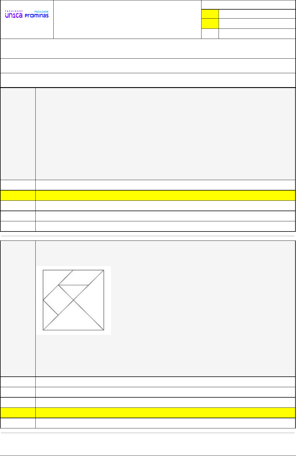 Pincel Atômico - 29/12/2023 16:41:57 1/4 ROBERTO CARLOS CARNEIRO Exercício Caminho do Conhecimento - Etapa 10 (21441) Atividade finalizada em 27/12/2023 21:19:40 (1517829 / 1) LEGENDA Resposta correta na questão # Resposta correta - Questão Anulada X Resposta selecionada pelo Aluno Disciplina: GEOMETRIA: FUNDAMENTOS E MÉTODOS DE ENSINO E PRÁTICAS PEDAGÓGICAS [869472] - Avaliação com 8 questões, com o peso total de 1,67 pontos [capítulos - 5] Turma: Segunda Graduação: Segunda Graduação 6 meses - Licenciatura em Matemática - Grupo: FPD-MAIO2023 - SGegu0A260523 [92670] Aluno(a): 91471699 - ROBERTO CARLOS CARNEIRO - Respondeu 8 questões corretas, obtendo um total de 1,67 pontos como nota [359903_152935] Questão 001 As transformações de semelhança no plano possuem propriedades e conceitos que são muito úteis a diversas áreas do conhecimento como a própria Matemática, a Engenharia, a Arquitetura, as Ciências Biológicas, dentre outras. Em relação a essas transformações, analise as seguintes afirmativas: I. A transformação de semelhança chamada de homotetia gera objetos semelhantes ao original a partir da multiplicação das medidas de seus segmentos de reta por um valor constante. II. Num processo de homotetia, a transformação não gera deformação. III. Se a razão de homotetia é negativa, a orientação espacial da figura não é alterada, mas ocorre uma ampliação. Sobre essas afirmações, é correto afirmar que as verdadeiras estão em: II e III, apenas. X l e II, apenas. II, apenas. I e III, apenas. I, II e III. [359903_152951] Questão 002 (VUNESP/2019/PM-SP) A figura representa um quebra-cabeças geométrico chinês com 7 peças denominadas tans: 5 triângulos retângulos, todos semelhantes entre si, 1 quadrado e 1 paralelogramo: Com essas 7 peças, sem sobrepô-las, pode se formar várias figuras como a de uma casa, a de um gato, a de um cisne, além de figuras geométricas, como a do quadrado representado acima. Considerando-se todos os ângulos internos das tans, representam-se como α e β as medidas, em graus, do maior e do menor desses ângulos. Nesse caso, α + β corresponde à medida de um ângulo: Agudo, ou seja, com medida entre 0º e 90º. Reto, ou seja, com medida igual a 90º. Obtuso, ou seja, com medida entre 90º e 180º. X Raso, ou seja, com medida igual a 180º. Côncavo, ou seja, com medida entre 180º e 360º. Pincel Atômico - 29/12/2023 16:41:57 2/4 [359904_152508] Questão 003 (FCC/Metrô SP/Analista de Desenho Industrial) Considere a figura abaixo: A figura demonstra o procedimento utilizado para a ampliação ou redução, a partir da replicação de figuras geométricas tomadas como modelo, processo este conhecido como Mosaico. Polígono de Sierpinski. Curva de Koch. Rosácea. X Homotetia. [359903_152506] Questão 004 (INEP/2015/Enem) Na imagem, a personagem Mafalda mede a circunferência do globo que representa o planeta Terra. QUINO. Toda Mafalda. São Paulo: Martins Fontes, 2008 (adaptado). Em uma aula de Matemática, o professor considera que a medida encontrada por Mafalda, referente à maior circunferência do globo, foi de 80 cm. Além disso, informa que a medida real da maior circunferência da Terra, a linha do Equador, é de aproximadamente 40 000 km. A circunferência da linha do Equador é quantas vezes maior do que a medida encontrada por Mafalda? X 50 000 000. 500. 5 000. 500 000. 5 000 000. Pincel Atômico - 29/12/2023 16:41:57 3/4 [359903_152505] Questão 005 Ao longo do percurso escolar, especialmente em Geografia, temos contato com muitos mapas e outros desenhos que utilizam um recurso bastante propício para representações de coisas grandes demais ou pequenas demais: a escala. Do ponto de vista da Matemática e das construções geométricas, a escala é uma relação entre duas dimensões lineares que guardam, entre si, uma proporção que permite desenhar um objeto pequeno ou grande demais com tamanhos que possamos enxergar em nosso campo visual natural. Isto é, conseguimos representar as dimensões reais de objetos por meio de desenhos ou construções que estão ligados, __________, por uma _________ com o objeto original. Assim, outros dois conceitos muito presentes ao se trabalhar com escalas são os de ________, que pode ser entendida como divisão ou relação de tamanho entre grandezas, e _________, que é a relação de igualdade entre as partes de uma grandeza. Analisando-se esse excerto, pode-se afirmar que as palavras ou expressões que melhor completam as lacunas são, nessa ordem: racionalmente – razão – proporcionalmente – proporção. proporcionalmente – proporção – razão – razão. geometricamente – razão – proporção – proporção. X proporcionalmente – razão – razão – proporção. de forma racional – proporcionalmente – razão – proporção. [359905_152512] Questão 006 (INEP/2019/Enem) Construir figuras de diversos tipos, apenas dobrando e cortando papel, sem cola e sem tesoura, é a arte do origami (ori = dobrar; kami = papel), que tem um significado altamente simbólico no Japão. A base do origami é o conhecimento do mundo por base do tato. Uma jovem resolveu construir um cisne usando a técnica do origami, utilizando uma folha de papel de 18 cm por 12 cm. Assim, começou por dobrar a folha conforme a figura. Após essa primeira dobradura, a medida do segmento AE é 6√3 cm. X 6√5 cm. 12√2 cm. 2√22 cm. 12 cm. Pincel Atômico - 29/12/2023 16:41:57 4/4 [359903_152943] Questão 007 (INEP/2016/Enem) Um professor, ao fazer uma atividade de origami (dobraduras) com seus alunos, pede para que estes dobrem um pedaço de papel em forma triangular, como na figura a seguir, de modo que M e N sejam pontos médios, respectivamente, de AB e AC, e D, ponto do lado BC, indica a nova posição do vértice A do triângulo ABC. Se ABC é um triângulo qualquer, após a construção, são exemplos de triângulos isósceles os triângulos: CND e NDM. CA