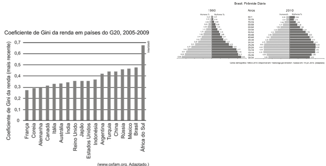 1. UFTM 2012 O Coeficiente de Gini é uma relação estatística para medir a desigualdade social, incluindo a distribuição de renda, e varia de O (zero) a 1 (um). O gráfico apresenta, no período de 2005 a 2009, os coeficientes encontrados em alguns países do G20, onde para a distribuição de renda o coeficiente 0 corresponde à completa igualdade na renda (todos detêm a mesma renda per capita) e o coeficiente 1 corresponde à completa desigualdade entre as rendas. A partir da análise do gráfico, é correto afirmar que, no período e dentre os países analisados, a. o Brasil é o segundo país com maior desigualdade na distribuição de renda dentre os países do G20. b. o Brasil apresenta a melhor taxa de distribuição de renda dos países da América Latina. c. assim como no Brasil, os governos de países de economias emergentes priorizaram a melhoria na distribuição de renda. d. a África do Sul apresenta a melhor distribuição de renda do grupo em função dos recursos minerais existentes em seu território. e. países desenvolvidos como França, Alemanha e Canadá, embora apresentem economia estável, possuem elevados índices de desigualdade social. 2. UFRN 2013 O Brasil vivencia uma mudança na estrutura etária de sua população que repercute nas políticas estatais. As pirâmides etárias constituem uma forma de representação de dados importante para planejar e implementar políticas que visem à melhoria da qualidade de vida da população. Observe as pirâmides abaixo. Levando em conta as informações das pirâmides e as perspectivas de melhoria da qualidade de vida da população brasileira, as políticas governamentais atuais devem considerar a. o aumento da população de idosos, que gera demandas de aposentadorias e adequações no sistema de saúde. b. o aumento da população de crianças, que implica a necessidade de ampliação da rede de escolas e creches. c. a diminuição da população de crianças, que exige a adoção de programas de incentivo à natalidade e de distribuição de renda. d. a diminuição da população de idosos, que requer a melhoria no sistema de previdência e assistência social. 3. ENEM 2014 O jovem espanhol Daniel se sente perdido. Seu diploma de desenhista industrial e seu alto conhecimento de inglês devem ajudá-lo a tomar um rumo. Mas a taxa de desemprego, que supera 52% entre os que têm menos de 25 anos, o desnorteia. Ele está convencido de que seu futuro profissional não está na Espanha, como o de, pelo menos, 120 mil conterrâneos que emigraram nos últimos dois anos. O irmão dele, que é engenheiro-agrônomo, conseguiu emprego no Chile. Atualmente, Daniel participa de uma “oficina de procura de emprego” em países como Brasil, Alemanha e China. A oficina é oferecida por uma universidade espanhola. GUILAYN, P. Na Espanha, universidade ensina a emigrar. O Globo, 17 fev. 2013 (adaptado). A situação ilustra uma crise econômica que implica LISTA - POPULAÇÃO NO BRASIL, TAXAS DEMOGRÁFICAS, TRANSIÇÃO E INDICADORES. a. valorização do trabalho fabril. b. expansão dos recursos tecnológicos. c. exportação de mão de obra qualificada. d. diversificação dos mercados produtivos. e. intensificação dos intercâmbios estudantis. 4. UEG 2012 Quando se analisa a população economicamente ativa (PEA) de países desenvolvidos, verifica-se um elevado porcentual de ativos com baixos índices de desemprego. Por outro lado, a situação dos países subdesenvolvidos apresenta uma realidade oposta, com uma considerável parcela da população dedicada ao subemprego e, portanto, ligada à economia informal. A esse respeito, é correto afirmar: a. o crescimento da economia informal nos países desenvolvidos está diretamente ligado ao processo de globalização que gerou o desemprego estrutural. b. o Estatuto da Criança e do Adolescente proíbe, no Brasil, o trabalho de menores de 18 anos, mesmo na condição de aprendizes. c. os vendedores ambulantes, guardadores de carros, diaristas, entre outros, fazem parte da população economicamente ativa, pois não têm vínculos empregatícios. d. na economia informal, os trabalhadores não participam do sistema tributário, não têm carteira assinada e nem acesso aos direitos trabalhistas. 5. ENEM 2017 O padrão da pirâmide etária ilustrada apresenta demanda de investimentos socioeconômicos para a a. redução da mortalidade infantil. b. promoção da saúde dos idosos. c. resolução do déficit habitacional. d. garantia da segurança alimentar. e. universalização da educação básica. 6. G1 - CFTMG 2015 A questão refere-se às imagens a seguir. A análise das duas pirâmides etárias permite afirmar que se trata de um país pertencente a. ao grupo dos emergentes, pela melhoria nos índices de expectativa de vida. b. ao bloco das nações desenvolvidas, pela redução recente nas taxas de natalidade. c. à porção da África subsaariana, pela explosão demográfica ocorrida na última década. d. às regiões de conflitos do Oriente Médio, pela ampliação das taxas de mortalidade infantil. 7. ENEM 2017 A evolução na estrutura etária apresentada influenciou a Estado a formar ações para a. garantir a igualdade de gênero. b. priorizar a construção de escolas. c. reestruturar o sistema previdenciário. d. investir no controle da natalidade. e. fiscalizar a entrada de imigrantes. 8. UFSM 2015 Nas últimas décadas, houve diversas mudanças estruturais na economia brasileira, como a industrialização e a urbanização, que alteraram o comportamento reprodutivo da população. Um gráfico em forma de pirâmide - em cuja ordenada aparecem os grupos de idade, e em cuja abscissa encontra-se o contingente populacional em números absolutos ou percentuais - é a forma usual de representar a estrutura etária de uma população. Fonte: OLIC, N. B.; SILVA, A. C. da; LOZANO, R. Vereda digital geograña. São Paulo: Moderna, 2012, p. 387 - 388. (adaptado) Observe o g