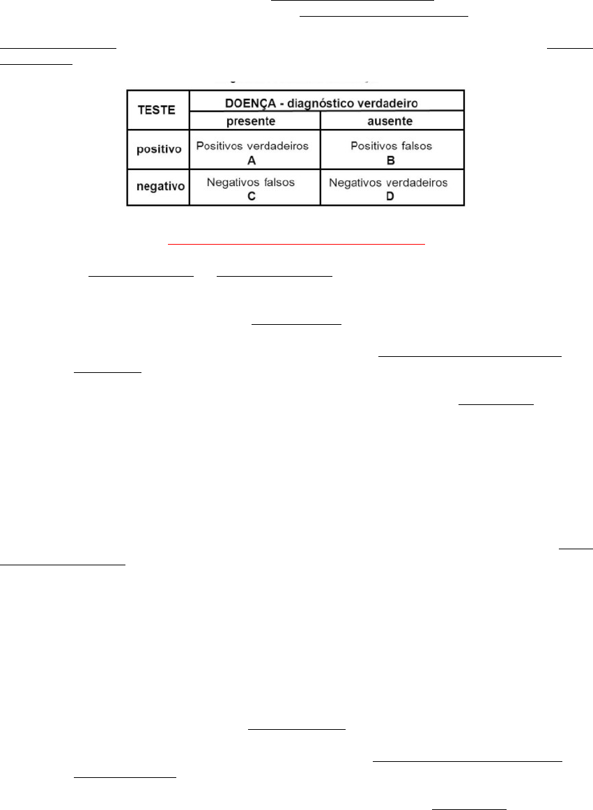 TESTES E DIAGNOSTICOS Sempre que faço um teste diagnóstico, e dá resultado positivo, ele pode acertar, pois a pessoa realmente é doente, ou pode errar, pois pode ser um falso-positivo. Ou dando negativo, pode acertar, pois a pessoa realmente não está doente, ou pode errar, pois pode ser um falso-negativo. Portanto, existem QUATRO possibilidades diagnósticas. Olhando a tabela, o teste ACERTOU no A e no D. No A, o teste disse que era positivo, e realmente era doente. Por isso chama de VERDADEIRO POSITIVO. No D o teste disse que era negativo, e realmente era. Por isso, chama VERDADEIRO NEGATIVO. O teste errou no B e no C. No B o teste disse que era positivo, mas a pessoa não é doente. A gente chama de FALSO POSITIVO. No C o teste disse que era negativo, mas a pessoa é doente. É o FALSO NEGATIVO. Propriedades dos Testes Diagnósticos Lembrar que SENSIBILIDADE E ESPECIFICIDADE SÃO CARACTERÍSTICAS INERENTES AOS TESTES DIAGNÓSTICOS. Sensibilidade É a capacidade de um teste diagnóstico identificar os VERDADEIROS POSITIVOS nos indivíduos DOENTES. Portanto, sempre que pensarmos em sensibilidade, tem que se dirigir a COLUNA 1, de modo que calculamos por A / A + C. Quando um teste é muito sensível, ele peca por excesso, pegando até quem só parece doente. Então, raramente deixa de encontrar pessoas com a doença. Ou seja, quanto mais sensível o teste, MENOR O ÍNDICE DE FALSO-NEGATIVOS (C). Portanto, isso significa que DANDO NEGATIVO, praticamente EXCLUO A DOENÇA, e POR ISSO SE USA TESTES MUITO SENSÍVEIS PARA TRIAGEM! Por outro lado, por pegar tudo que parece com a doença, está sujeito a encontrar MAIS FALSO-POSITIVOS, ou seja, indivíduos com teste positivo, mas que não apresentam a doença. Quando queremos um teste mais sensível? · TRIAGENS DIAGNÓSTICAS (Exp. bancos de sangue) · Quando a doença é grave (Não pode passar despercebida) · Quando a doença é tratável (Existe chance de cura) · Quando os resultados errados (falsos-positivos) não provocam traumas psicológicos, econômico ou social Especificidade É a capacidade de um teste diagnóstico identificar os VERDADEIROS NEGATIVOS nos indivíduos NÃO DOENTES. Portanto, sempre que pensar em especificidade, tem que se dirigir a COLUNA 2, de modo que calculamos por D / B + D. Quando um teste é muito específico, raramente dirá que os não doentes são doentes. Ou seja, BAIXO ÍNDICE DE FALSO-POSITIVOS. Então esses testes DANDO POSITIVO, praticamente FECHO DIAGNÓSTICO. Porém, por ser muito específico, está sujeito a encontrar MAIS FALSO-NEGATIVOS, ou seja, indivíduos com teste negativos, mas que apresentam a doença. Quando queremos um teste mais específico? · CONFIRMAÇÃO DO DIAGNÓSTICO · Doença importante, mas DIFÍCIL DE TRATAR ou INCURÁVEL · Quando os resultados errados (falsos-positivos) provocam traumas psicológicos, econômico ou social (exp. Câncer) Valor preditivo É também chamado de "Probabilidade pós-teste", ou seja, a probabilidade de se ter ou não a doença, após o resultado do teste. Podemos dizer que a "Probabilidade pré-teste" é a própria prevalência da doença na população. São duas perguntas: 1) Dado que o teste diagnóstico foi POSITIVO, qual a probabilidade de realmente se ter a doença? Esse é o VALOR PREDITIVO POSITIVO (VPP). OLHO A LINHA 1. Ou seja, OS ACERTOS NOS RESULTADOS POSITIVOS. Portanto, A/A+B. · TESTES MAIS ESPECÍFICOS -> MENOS FALSO-POSITIVOS -> MAIOR VPP (o positivo de teste específico podemos confiar) · TESTES MAIS SENSÍVEIS -> MAIS FALSO-POSITIVOS -> MENOR VPP. 2) Dado que o teste diagnóstico foi NEGATIVO, qual é a probabilidade de realmente não se ter a doença? Esse é o VALOR PREDITIVO NEGATIVO (VPN). OLHO A LINHA 2. Ou seja, OS ACERTOS NOS RESULTADOS NEGATIVOS. Portanto, D / C + D. · TESTES MAIS SENSÍVEIS -> MENOS FALSOS-NEGATIVOS -> MAIOR VPN. (o negativo de teste sensível podemos confiar) · TESTES MAIS ESPECÍFICOS -> MAIS FALSO-NEGATIVOS -> MENOR VPN. Esses valores preditivos podem sofrer variações, dependendo, além da sensibilidade e especificidade do teste, da PREVALÊNCIA da doença na população. Entretanto, devemos sempre lembrar que "a sensibilidade e especificidade do teste NÃO SÃO influenciadas pela prevalência, pois são características inerentes ao teste, sendo igual independente de que população ele seja feito" (QUESTÃO) · QUANTO MAIOR A PREVALÊNCIA da doença testada, MAIOR O VPP e MENOR O VPN. Isto é, maior será a probabilidade de um resultado positivo significar que o paciente em questão é de fato doente. · QUANTO MENOR A PREVALÊNCIA da doença testada, MENOR O VPP e MAIOR O VPN. Isto é, maior será a probabilidade de um resultado negativo significar que o paciente em questão é de fato sadio. Por exemplo: 1) População de prostitutas x Teste rápido para HIV. Nessa situação de alta prevalência, é esperado um número maior de resultados falso-negativos (MENOR VPN), ainda que seja aplicado um teste com boa sensibilidade. Por outro lado, terá um baixo número de falso-positivos (MAIOR VPP). 2) Pouplação de freiras x Teste rápido para HIV. Numa situação de baixa prevalência, mesmo um teste muito específico, irá produzir muitos resultados falso-positivos (MENOR VPP), devido ao elevado número de indivíduos sadios na coletividade. Por outro lado, terá um baixo número de falso-negativos (MAIOR VPN). Acurácia Mede a proporção de acertos do teste, o total de verdadeiramente positivos e verdadeiramente negativos, em relação à amostra estudada. Portanto, A + D / A+B+C+D. Dicas Importantes para Memorizar · Sensibilidade = capacidade de detectar os DOENTES · Especificidade = capacidade de achar os NÃO DOENTES · Nos testes com alta SENSIBILIDADE, temos MENOS FALSO-NEGATIVOS, de modo que ser der resultado NEGATIVO, eu EXCLUO A DOENÇA, usando portanto para TRIAGEM. · Nos testes com alta ESPECIFICIDADE, tem MENOS FALSO-POSTIVOS, de modo que se der resultado POSITIVO, eu FECHO O D