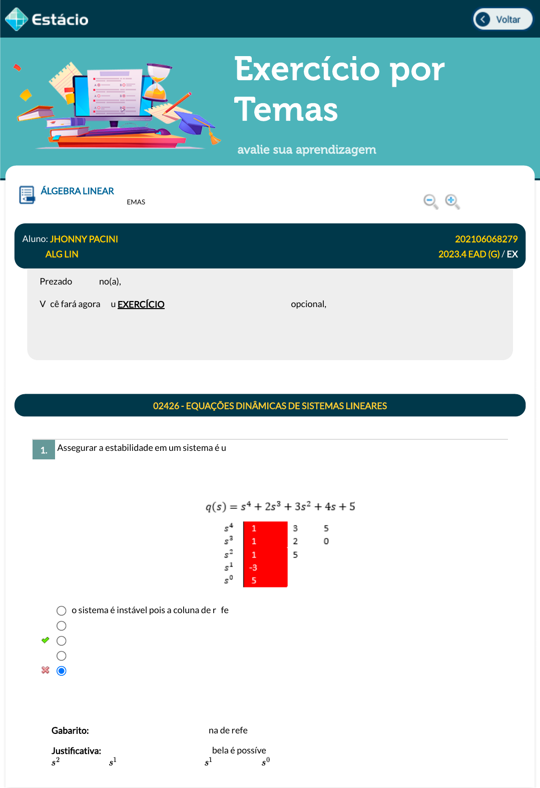 26/12/2023, 19:48 Estácio: Alunos https://simulado.estacio.br/alunos/ 1/7 Exercício por Temas avalie sua aprendizagem Assegurar a estabilidade em um sistema é uma questão fundamental em qualquer projeto de sistema de controle. O critério de estabilidade de Routh-Hurwitz é uma metodologia fundamental para analisar a estabilidade de sistemas dinâmico lineares. De acordo com a Tabela de Routh que representa a simpli�cação da tabela do polinômio abaixo, é possível a�rmar que: ÁLGEBRA LINEAR Lupa DGT1558_202106068279_TEMAS Aluno: JHONNY PACINI Matr.: 202106068279 Disc.: ALG LIN 2023.4 EAD (G) / EX Prezado (a) Aluno(a), Você fará agora seu EXERCÍCIO! Lembre-se que este exercício é opcional, mas não valerá ponto para sua avaliação. O mesmo será composto de questões de múltipla escolha. Após responde cada questão, você terá acesso ao gabarito comentado e/ou à explicação da mesma. Aproveite para se familiarizar com este modelo de questões que será usado na sua AV e AVS. 02426 - EQUAÇÕES DINÂMICAS DE SISTEMAS LINEARES 1. o sistema é instável pois a coluna de referência não apresenta mudança de sinal. o sistema é estável pois apresenta apenas raízes com partes reais positivas. o sistema é instável pois a coluna de referência apresenta mudança de sinal. o sistema é estável pois a coluna de referência apresenta mudança de sinal. o sistema é instável pois apresenta apenas raízes com partes reais negativas. Data Resp.: 26/12/2023 19:46:26 Explicação: Gabarito: o sistema é instável pois a coluna de referência apresenta mudança de sinal. Justi�cativa: Através da coluna pivô da tabela é possível observar, através das duas mudanças de sinal (da linha para a linha e novamente da linha para a linha ). Sendo, por essa razão, instável.s2 s1 s1 s0 javascript:voltar(); javascript:voltar(); javascript:voltar(); javascript:voltar(); javascript:diminui(); javascript:diminui(); javascript:aumenta(); javascript:aumenta(); 26/12/2023, 19:48 Estácio: Alunos https://simulado.estacio.br/alunos/ 2/7 Assegurar a estabilidade em um sistema é uma questão fundamental em qualquer projeto de sistema de controle. O critério de estabilidade de Routh-Hurwitz é uma metodologia fundamental para analisar a estabilidade de sistemas dinâmico lineares. Observando o polinômio característico abaixo, é possível de�nir que o sistema será estável para: A representação de sistemas físicos através de modelos matemáticos é uma ferramenta de grande importância. Observando-se o sistema mecânico de translação da �gura abaixo, é possível determinar que o número de variáveis de estado que o mesmo apresenta é igual a: 2. Data Resp.: 26/12/2023 19:46:30 Explicação: Gabarito: Justi�cativa: Através do critério de estabilidade de Routh-Hurwitz é possível montar a seguinte tabela de Routh para o polinômio: Para a linha é possível observar que para que não haja mudança de sinal , então: Para a linha é possível observar que para que não haja mudança de sinal Então: 3. 2 4 5 1 3 Data Resp.: 26/12/2023 19:46:41 Explicação: Gabarito: 2 0<k<1 k > 0 k > 1 k < 0 k < 1 0<k<1 s1 2 − 2k > 0 k < 1 s0 k > 0 0<k<1 26/12/2023, 19:48 Estácio: Alunos https://simulado.estacio.br/alunos/ 3/7 Assegurar a estabilidade em um sistema é uma questão fundamental em qualquer projeto de sistema de controle. O critério de estabilidade de Routh-Hurwitz é uma metodologia fundamental para analisar a estabilidade de sistemas dinâmico lineares. Observando o polinômio característico abaixo, é possível de�nir que o sistema será estável para: Assegurar a estabilidade em um sistema é uma questão fundamental em qualquer projeto de sistema de controle. O critério de estabilidade de Routh-Hurwitz é uma metodologia fundamental para analisar a estabilidade de sistemas dinâmico lineares. De acordo com a Tabela de Routh que representa a simpli�cação da tabela do polinômio abaixo, é possível a�rmar que o sistema descrito por esse polinômio apresenta: Justi�cativa: Observando-se o sistema é possível identi�car uma força sendo aplicada sobre o conjunto mecânico. Essa força promove o deslocamento do conjunto e a consequente distensão da mola e de um amortecedor. Vale destacar que o atrito não está sendo considerado Dessa maneira, é possível montar a equação da seguinte maneira: Força - esforço da mola - amortecedor = força resultante Com duas diferenciais esse sistema possui 2 variáveis de estado. 4. Data Resp.: 26/12/2023 19:47:03 Explicação: Gabarito: Justi�cativa: Através do critério de estabilidade de Routh Hurwitz é possível montar a seguinte tabela de Routh para o polinômio: Para a linha é possível observar que para que não haja mudança de sinal , então: Para a linha é possível observar que para que não haja mudança de sinal Então: 5. f(t) (x(t)) 0<k<8 k < 8 k < 0 k > 8 8<k<0 0<k<8 s1 (4 −k /2) > 0 k < 8 s0 k > 0 0<k<8 26/12/2023, 19:48 Estácio: Alunos https://simulado.estacio.br/alunos/ 4/7 Considerando-se a classi�cação das equações diferenciais quanto a ordem da derivada de maior grau, é possível dizer que a equação diferencial abaixo é de: Considerando a característica de linearidade das equações diferenciais, é possível dizer que a equação abaixo é: 1 pólo no semiplano esquerdo 1 pólo no semiplano direito 2 pólos na origem do sistema 2 pólos no semiplano esquerdo 2 pólos no semiplano direito Data Resp.: 26/12/2023 19:47:19 Explicação: Gabarito: 2 pólos no semiplano direito Justi�cativa: Como o sistema apresenta 2 mudanças de sinal, é possível concluir que o mesmo apresenta 2 pólos no semiplano direito. Ainda seria possível determinar os pólos do polinômio: 6. quarta ordem primeira ordem segunda ordem ordem única terceira ordem Data Resp.: 26/12/2023 19:47:39 Explicação: Gabarito: quarta ordem Justi�cativa: Como a ordem da equação diferencial é de�nid