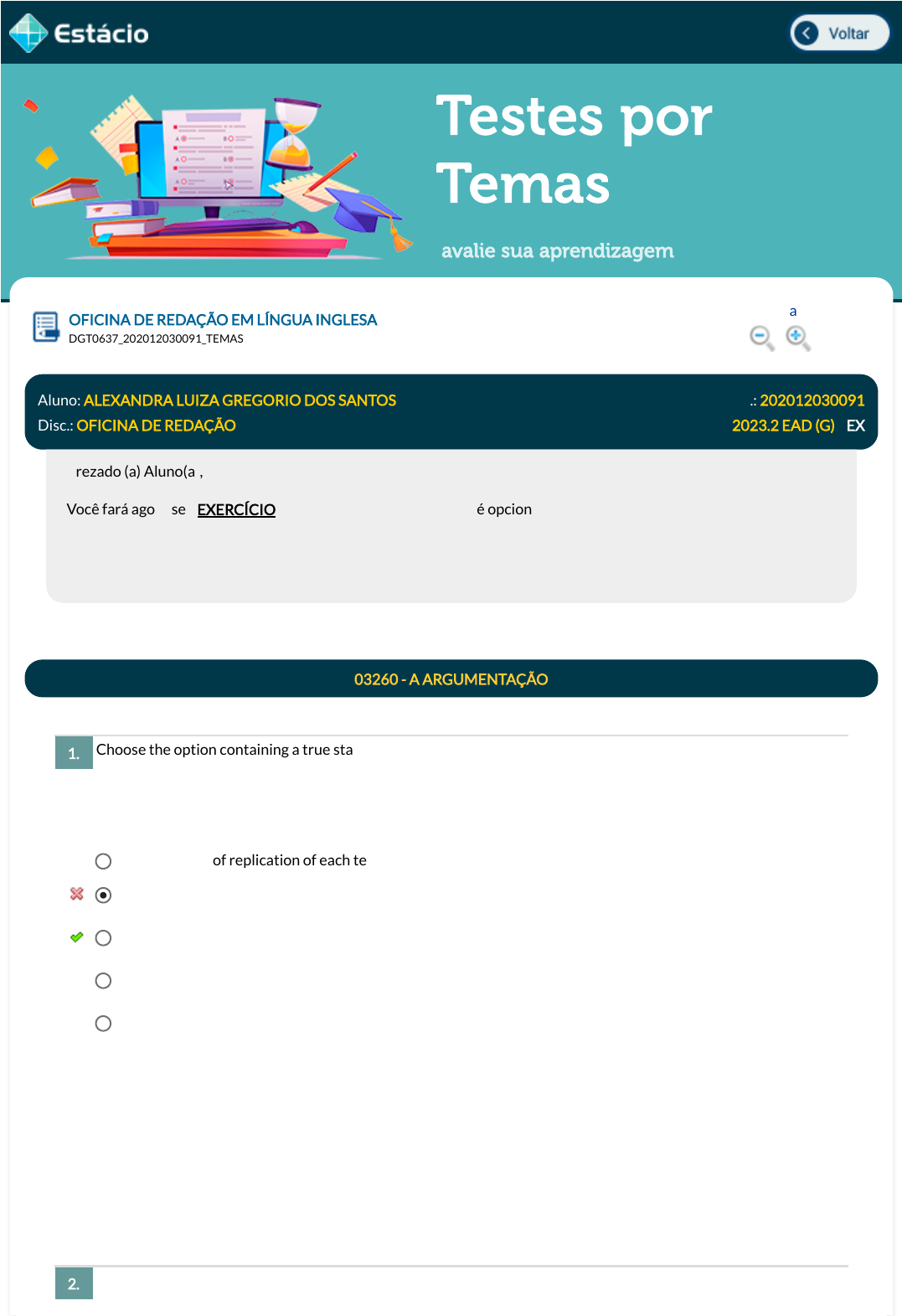 02/09/2023, 09:40 Estácio: Alunos https://simulado.estacio.br/alunos/ 1/6 Testes por Temas avalie sua aprendizagem Choose the option containing a true statement concerning the verb tense employed in the following sentences. "The fatty acid compositions were measured based on a well-established method (Folch, Lees, & Sloane-Stanley, 1957; Lepage & Roy, 1986). Each test was replicated three times for each experimental group." Retrieved from https://onlinelibrary.wiley.com/doi/10.1002/fsn3.1443 Focusing on the effect of the covid-19 pandemic on marital relationships, Gaby Hinsliff's text is initiated by the following introductory paragraph: OFICINA DE REDAÇÃO EM LÍNGUA INGLESA Lupa DGT0637_202012030091_TEMAS Aluno: ALEXANDRA LUIZA GREGORIO DOS SANTOS Matr.: 202012030091 Disc.: OFICINA DE REDAÇÃO 2023.2 EAD (G) / EX Prezado (a) Aluno(a), Você fará agora seu EXERCÍCIO! Lembre-se que este exercício é opcional, mas não valerá ponto para sua avaliação. O mesmo será composto de questões de múltipla escolha. Após responde cada questão, você terá acesso ao gabarito comentado e/ou à explicação da mesma. Aproveite para se familiarizar com este modelo de questões que será usado na sua AV e AVS. 03260 - A ARGUMENTAÇÃO 1. The necessity of replication of each test is an argument against the "methods" mentioned. A future tense would be more adequate for the paragraph, since it argues for the relevance of methods which will still be expounded later in the paper. The Simple Past tense is correctly employed since the authors are arguing for the relevance of their methodology in that speci�c study. The Simple Present tense would be more suitable in both sentences, since they support notions which are characterized as "well-established". The Present Perfect tense would be more suitable in the �rst sentence, for it consists of the description of an area of research that led to the "well-established" method. Data Resp.: 02/09/2023 09:40:15 Explicação: As Swales and Feak (2004) indicate, authors of academic texts commonly use the past to describe researchers' actions in single studies. Therefore, "The Simple Past tense is correctly employed since the authors are arguing for the relevance of their methodology in that speci�c study". 2. javascript:voltar(); javascript:voltar(); javascript:diminui(); javascript:aumenta(); 02/09/2023, 09:40 Estácio: Alunos https://simulado.estacio.br/alunos/ 2/6 Love is not love, which alters when it alteration �nds. It¿s a beautiful sentiment around which to build a Shakespearean sonnet, but in real life not everyone adapts to the dramatic changes thrust upon them in a pandemic with the apparent grace of Kate Garraway. The TV presenter's husband, Derek Draper, almost died of Covid; he is now back home after months in intensive care, but needs round-the-clock nursing. He can speak, but can't hold what most people would regard as a conversation. It cannot be the life or the marriage either of them dreamed of in their early 50s. But as she said hopefully at the weekend, she thinks they have found "a new way to be in love", a relationship of complete trust and reliance. "That¿s a positive thing to come out of this, to have that certainty of each other. He and I are very close." HINSLIFF, Gaby. The pandemic has taught us that love can bend without breaking. Disponível em: The pandemic has taught us all that love can bend without breaking | Gaby Hinsliff | The Guardian. Acesso em: 15 fev. 2022. Now, choose the option that best summarizes the strategies employed by the author to attract the readers¿ attention and introduce the topic of the text as a whole: In the book Academic Writing for Graduate Students by Swales and Feak, three rhetorical moves are identi�ed. These moves should function as guidelines for the writing of the introduction to argumentative texts as well as the building up of the thesis statement. Mark the alternative with the adequate description of the third rhetorical move, according to Swales and Feak: Topic statements are fundamental for argumentative texts. Mark the alternative that best describes the function of topic statements: Hinsliff starts with a quote from a Shakespearean sonnet that endorses the main point of her text, that "love can bend without breaking", and recurs to the touching story of a resilient couple to con�rm her main argument. Hinsliff turns to characters from Shakespeare's sonnets to prove that "love can bend without breaking" and couples can make it through the turbulent times imposed by the pandemic. Hinsliff provides statistics to validate the argument that marital relationships have been put to the test, showing that even celebrities - such as Kate Garraway, a famous TV presenter - had her marriage challenged by the hardships posed by covid-19. Hinsliff promotes a balanced account of the hardships faced by couples during the pandemic, listing reasons why some couples will not be as resilient as Kate Garraway and Derek Draper. Hinsliff's introduction analyzes the pros and cons of the circumstances faced by most couples during the covid-19 pandemic, looking into the advantages and disadvantages of resilience. Data Resp.: 02/09/2023 09:40:19 Explicação: The Shakespearean sonnet touches the heart of the question posed by the author, con�rming her thesis that "love can bend without breaking". Kate Garraway and Derek Draper's experience validates Hinsliff's argument that love can win the battle against the turmoil imposed by the pandemic. 3. (1) Outlining the purpose and the nature of the research; (2) announcing its principal �ndings; and (3) indicating the structure of the research paper. (1) Establishing a research territory; (2) establishing a niche; and (3) occupying the niche. (1) Establishing a research territory; (2) establishing a niche; and (3) extending previous knowledge. (1) Indicating a gap in the previous research; (2) raising questions about it; and (3) extending previous knowle