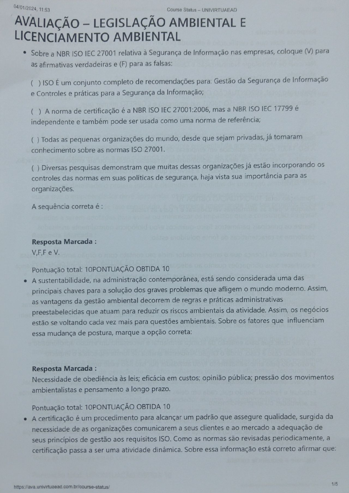 AVALIAÇÃO - LEGISLAÇÃO AMBIENTAL E LICENCIAMENTO AMBIENTAL ° Sobre a NBR ISO IEC 27001 relativa à Segurança de lnformação nas empresas, coloque (V) para as afirmativas verdadeiras e (F) para as faIsas: ( ) ISO É um conjunto completo de recomendações para: Gestão da Segurança de Informação e Controles e práticas para a Segurança da Informação; ( ) A norma de certificação é a NBR ISO IEC 27001z2006, mas a NBR ISO IEC 17799 é independente e também pode ser usada como uma norma de referênc¡a; ( )Todas as pequenas organizações do mundo, desde que sejam privadas,já tomaram conhecimento sobre as normas ISO 27001. ( ) Diversas pesquisas demonstram que muitas dessas organizaçõesjá estão incorporando os controles das normas em suas políticas de segurança, haja vista sua importância para as organizações. A sequência correta é : Resposta Marcada : V,F,F e V. Pontuação totalz 1OPONTUAÇÃO OBTIDA 10 o A sustentabilidade, na administração contemporânea, está sendo considerada uma das principais chaves para a solução dos graves problemas que afligem o mundo moderno. Assim, as vantagens da gestão ambiental decorrem de regras e práticas administrativas preestabelecidas que atuam para reduzir os riscos ambientais da atividade. Assim, os negócios estão se voitando cada vez mais para questões ambientais. Sobre os fatores que influenciam essa mudança de postura, marque a opção corretaz Resposta Marcada : Necessidade de obediência às Ieis; eficácia em custos; opinião pública; pressão dos movimentos ambientalístas e pensamento a Iongo prazo. Pontuação tota|: 1OPONTUAÇÃO OBTIDA 10 o A certificação é um procedimento para aIcançar um padrão que assegure qua|idade, surgida da necessidade de as organizações comunicarem a seus clientes e ao mercado a adequação de seus princípios de gestão aos requisitos ISO. Como as normas são revisadas periodicamente, a certificação passa a ser uma atividade dinâmica. Sobre essa informação está correto afirmar que: 1l5httpszllavaunivirtuaead.com.br/oourse-status¡ 04l0112024. 11:53 Cmmm Rlnlun ~ UNIVHUUAF AD Resposta Marcada : Podemos dizer que a certificação é efetuada por um organismo certifícador que no âmbito Sistema Brasileiro de Avaliação da Conformidade (SBAC) deve estar cadastrado no Instituto Nac:n:| de Metrologia Normalização e Qualidade Industrial (INMETRO) para exercer tal ativi a e. Pontuação tota|: 10PONTUAÇÃO OBTIDA 10 o Sobre a aplicabilidade da ISO 14001 nas empresas é CORRETO afírmar que Resposta Marcada : A ISO 14001 pode ser aplicada em empresas de qualquer porte e qualquer atividade, seja ela indústria, prestadora de serviços, agroindústria, empresas públicas ou até empresas de extração, a ISO 14001 ainda certifica produtos e serviços que estejam de acordo com as normas ambientais. Pontuação tota|1 1OPONTUAÇÃO OBTIDA 10 o Marque V para as afirmativas verdadeiras e F para as falsas. Dentre os principais parâmetros físico-químicos e/ou biológicos normalmente analisados conforme as características da fonte po|uídora estãoz () É através da Licença que o empreendedor inicia seu contato com o órgão ambiental e passa a conhecer suas obrigações quanto ao adequado controle ambiental de sua atividade. A Licença possui uma Iista de restrições ambientais que devem ser seguidas pela empresa. ( ) Desde 1981, de acordo com a Lei Federal 6.938/81, o Licenciamento Ambiental tornou-se obrigatório em todo o território nacional e as atividades efetiva ou potencialmente pquidoras não podem funcionar sem o devido Iicenciamento. Desde então, empresas que funcionam sem a Licença Ambiental estão sujeitas às sanções previstas em Iei. ( )Va|e dizer que para emissão da licença ambiental é necessário um estudo aprofundado e detalhado caso a caso, onde o Órgão Ambiental analisa de forma especifica o ¡mpacto provocado pelo empreendimento e/ou atividade, por ísto não existi uma Iicença padrão. ( ) Deve-se ter ciência de que são três esferas, de órgãos ambienta¡s, competentesz MunicipaL Estadual e FederaL Sendo que, cada um deles tem suas exigências e responsabilidades perante as atívidades ou empreendimento. ( ) O procedimento tradicíonal de Iicenciamento ambienta| compreende a Licença Participativa (LP), Licença de Instalação (LI) e Licença de Operação (LO). Cada uma é exigida em uma etapa específica do Iicenciamento. Assinale a sequência correta. 915httpszllava.univirtuaead.oom.br/course-slatus/ o4/o1/2024, 11;53 Resposta Marcada : V, V, V, F. Course Status - UNIVIRTUAEAD Pontuação totalz 1OPONTUAÇÃO OBTIDA 10 ° Com base em seu conhecimento, relacione corretamente e marque a alternativa CORRETA. 1- Licença Prévia 2- Licença |nstalação 3- Licença Operação ( )Autor¡za o funcionamento do empreendimento. Essa deve ser requerida quando a empresa estiver edificada e após a verificação da eficácia das medidas de controle ambiental estabelecidas nas condicionantes das Iicenças anteriores. ( ) Funciona como um aIicerce para a edificação de todo o empreendimento. Nesta etapa, são definidos todos os aspectos referentes ao controle ambiental da empresa. De início o órgão licenciador determina, se a área sugerida para a instalação da empresa é tecnicamente adequada. ( ) Uma vez detalhado o projeto inicial e definidas as medidas de proteção ambientaL é nessa etapa que o empreendedor deve apresentar os projetos demonstrando como seu empreendimento será de fato construído. É de extrema importância que tais projetos íncluam as medidas a serem adotadas para evitar ou minimizar os impactos que a construção irá gerar. Resposta Marcada : 3 - 1 - 2. Pontuação tota|: 1OPONTUAÇÃO OBTIDA 10 o Leia as afírmativas a segu¡r: I- O Iicenciamento ambiental é o procedimento admínistrativo pelo qual o órgão ambiental autoriza a |oca|ização, instalação, ampliação e operação de empreendimentos e ativid